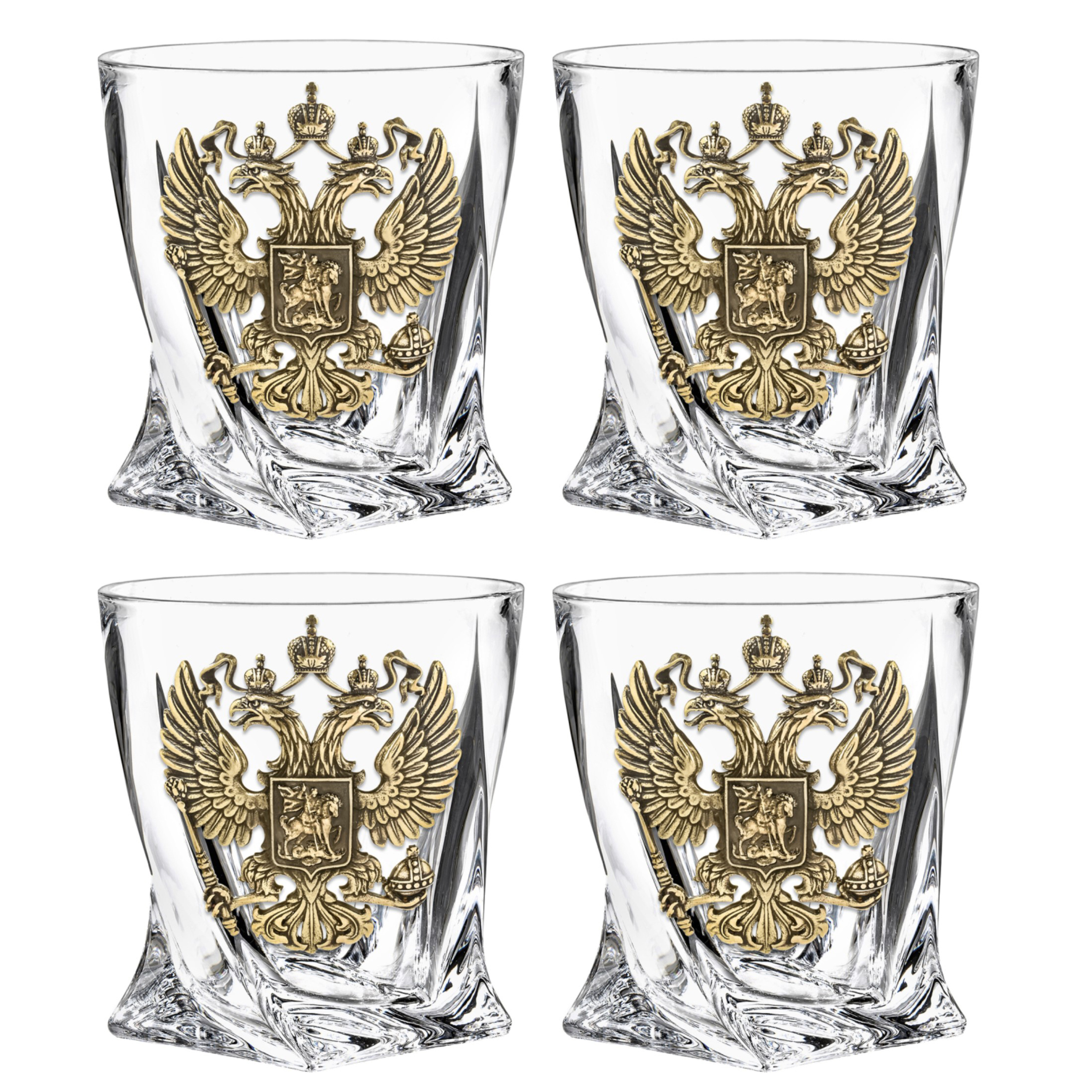 Набор для виски на четыре персоны с изображением Большого государственного герба России — предмет, сочетающий весомый символизм и безупречное исполнение. В его состав входят четыре стеклянных бокала, украшенных массивными латунными накладками с изображением двуглавого орла, выполненными методом художественного литья. Рельефная поверхность металла подчеркивает каждый элемент: короны, скипетр, держава, щит с Георгием Победоносцем — вся композиция создана с максимальной точностью и уважением к государственной символике.
