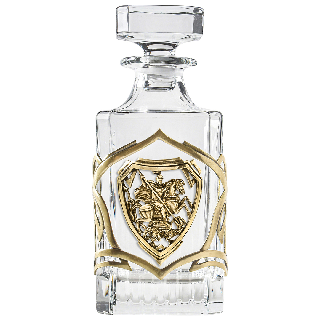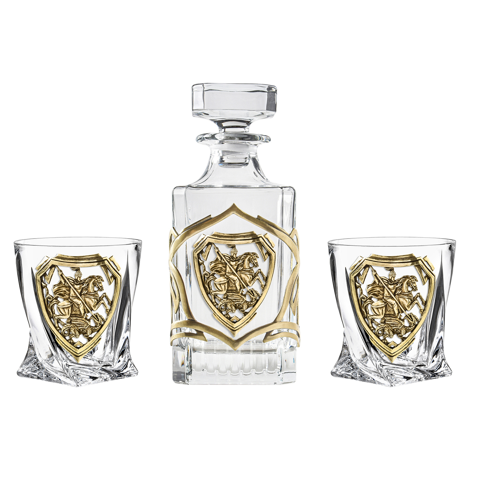 Набор для виски «Георгий Победоносец» на две персоны — это идеальный выбор для тех, кто ценит роскошь и символику. В набор входят два высококачественных хрустальных бокала с уникальной гранью и штоф, украшенные декоративными элементами, выполненными из латуни с позолотой. На каждом элементе изображён Георгий Победоносец — в эпической сцене сражения с драконом. Этот символ силы и мужества излучает мощь и престиж, напоминая о значимости истории и традиций.