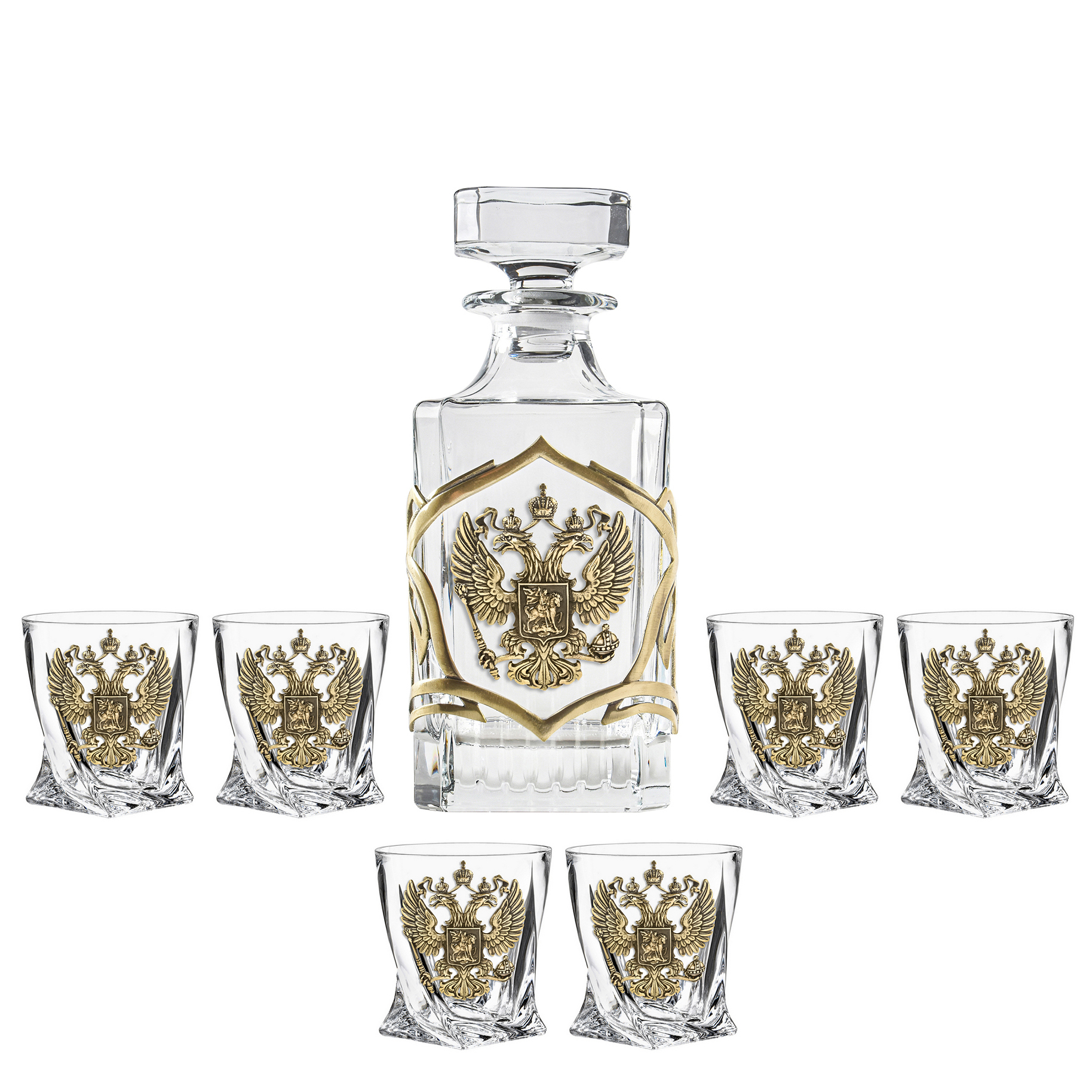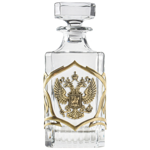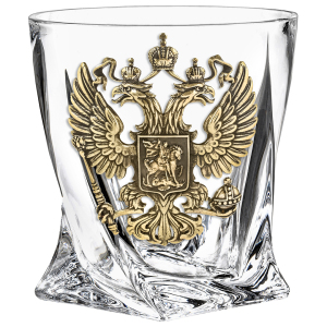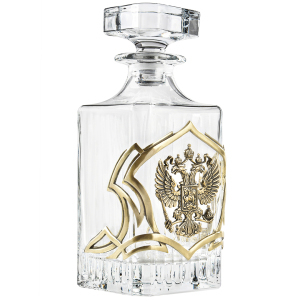 Подарочный набор для виски на шесть персон воплощает в себе союз могущества, традиции и статуса. В состав комплекта входят шесть хрустальных бокалов с выразительной алмазной гранью, штоф с массивной пробкой и комплект камней для охлаждения напитка, аккуратно упакованный в стилизованный чехол. Все элементы декорированы объемным рельефом герба Российской Федерации — двуглавым орлом, увенчанным тремя коронами, с державой, скипетром и щитом, на котором восседает Георгий Победоносец, пронзающий змея. Символ власти и чести отлит из латуни с позолоченной патиной и вручную закреплён на стеклянной поверхности.