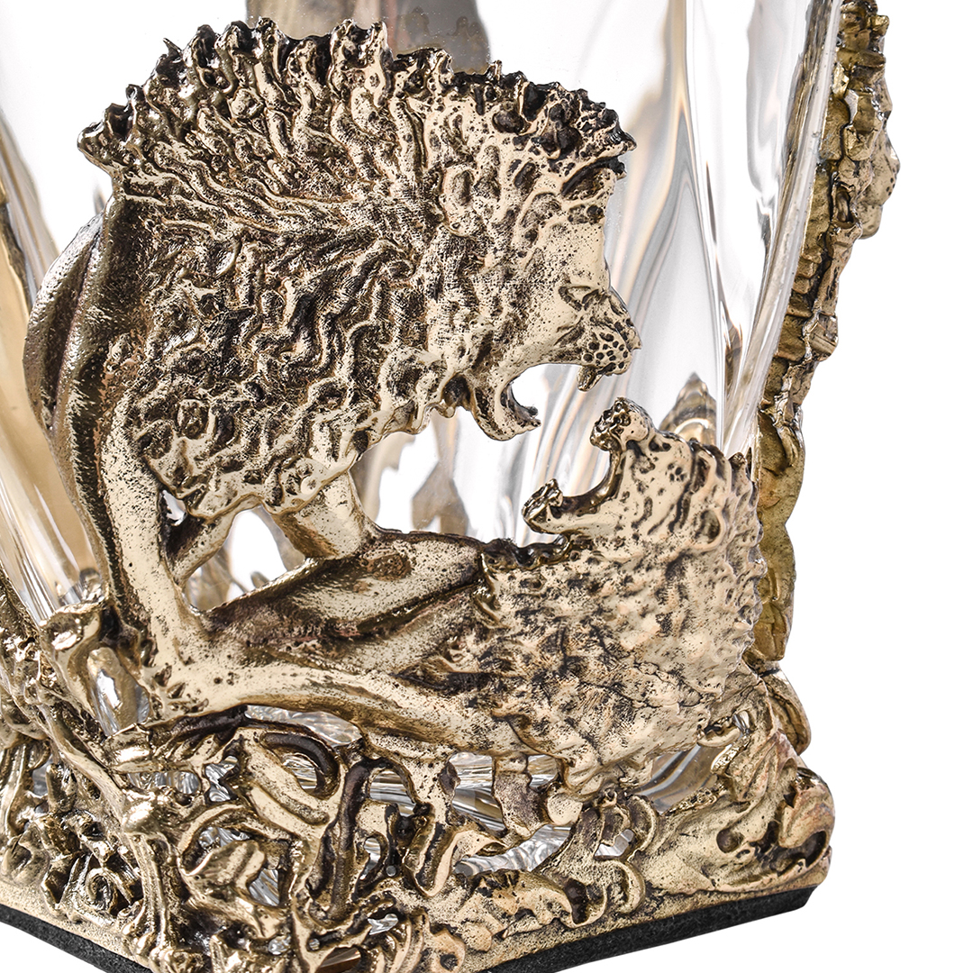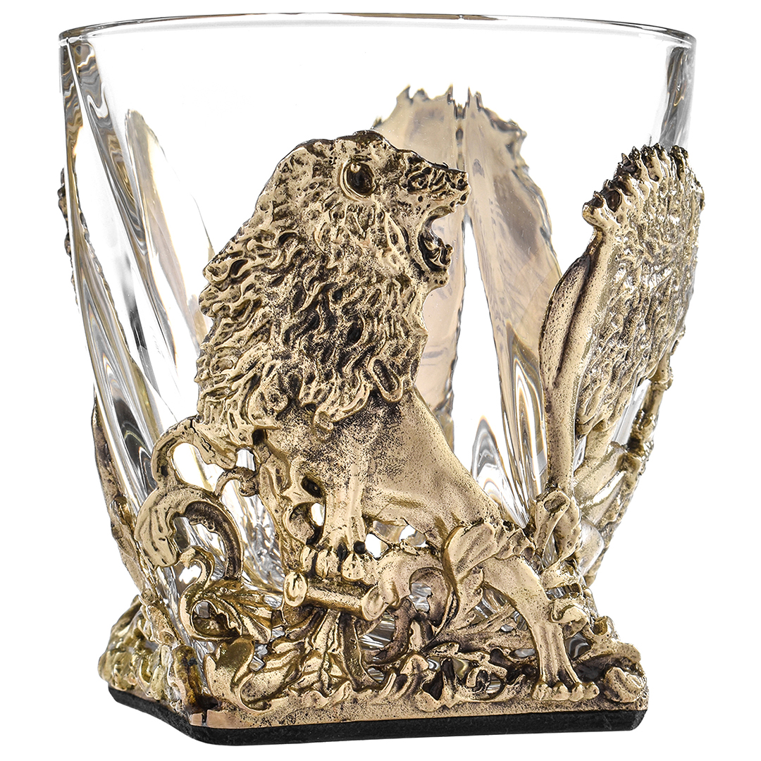 Плавные изгибы латунного декора создают изысканный контраст с чёткой геометрией стакана. Благодаря тонкой ручной проработке можно рассмотреть текстуру гривы, мощные лапы и выразительный взгляд зверя. Металл, прошедший патинирование, сохраняет благородный оттенок, а рельефные элементы остаются устойчивыми к истиранию. Бокалы удобно ложатся в руку и прекрасно подходят для подачи виски, бурбона или других крепких напитков.