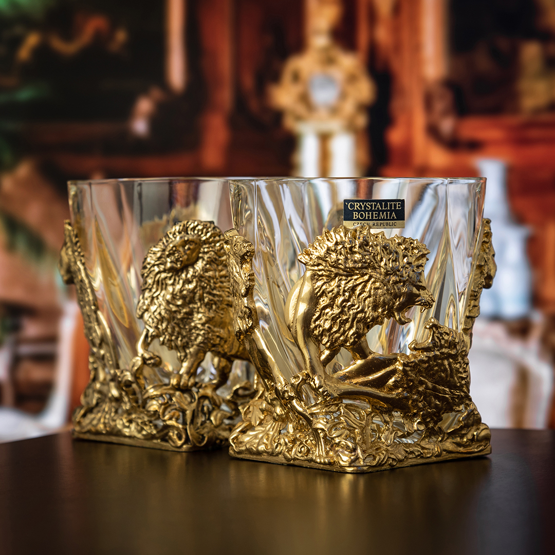 Набор для виски «Львы» на 2 персоны — это предмет с ярко выраженным мужским характером и образным посланием силы, власти и достоинства. Каждый стакан выполнен из утолщённого прозрачного стекла и украшен декоративным обрамлением из патинированной латуни, отлитым в виде львов — царственных и гордых. Один из львов изображён в профиль с раскрытой пастью — как символ решимости и силы, другой — в спокойной позе, с прямым взглядом, воплощая мудрость, уверенность и достоинство. Композиции обрамлены стилизованными листьями и завитками, которые придают объём и подчёркивают значимость образа.