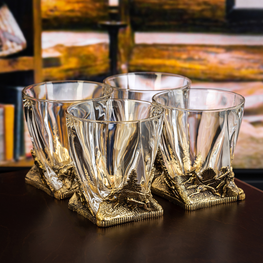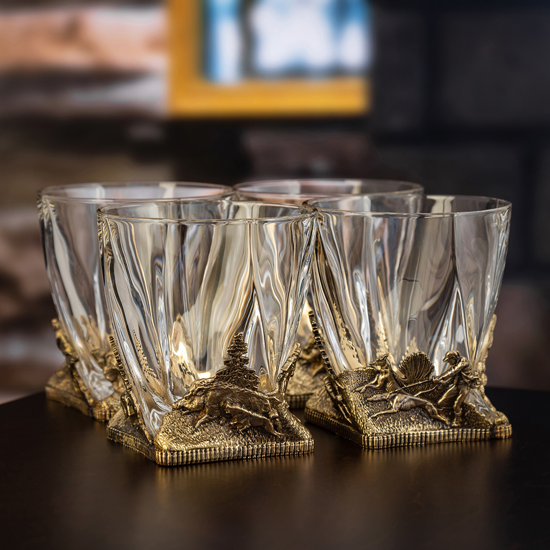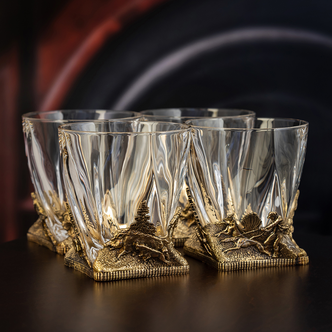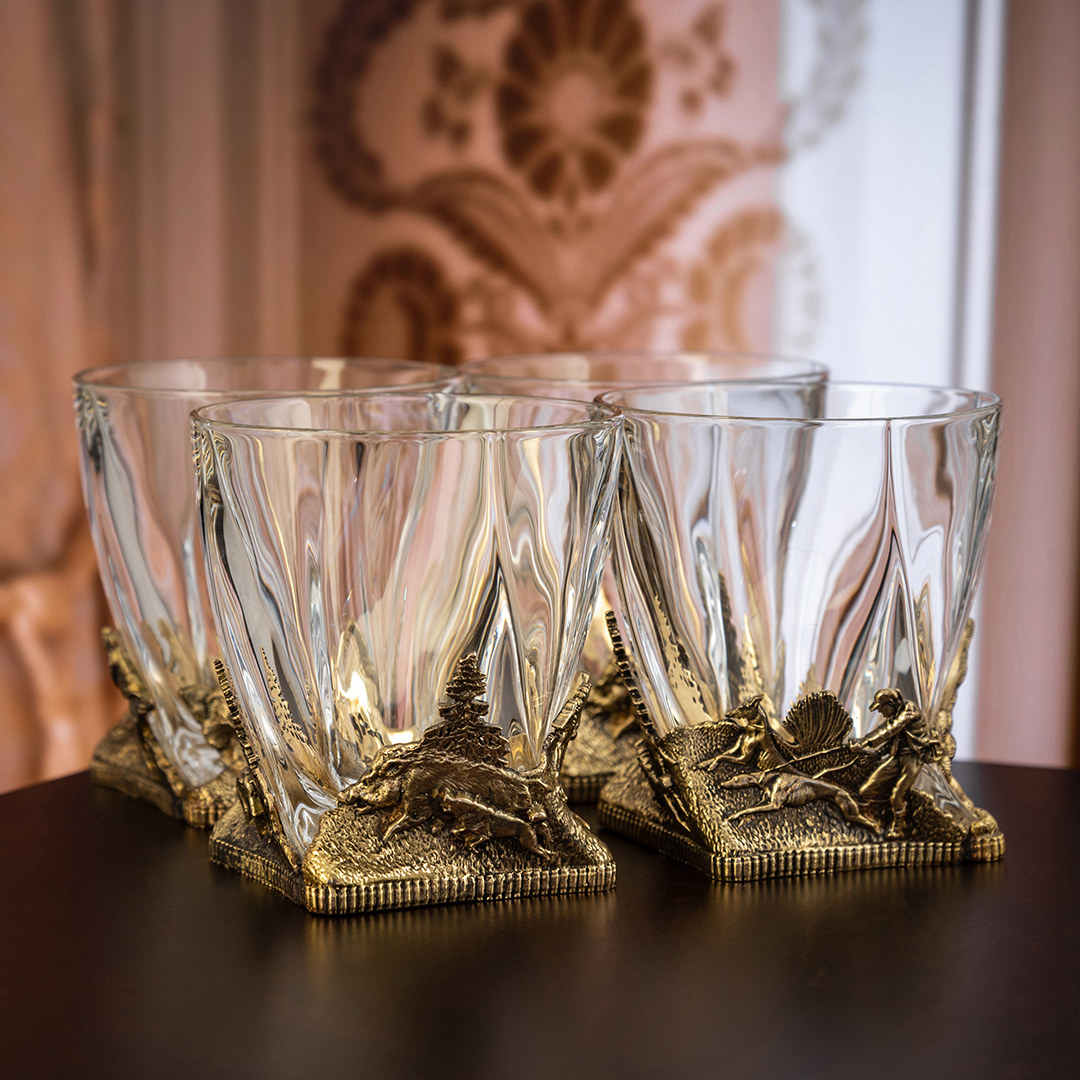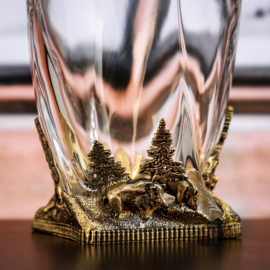 Фактурный металл отливается с филигранной точностью по технологии художественного литья. Все элементы — от хвои на деревьях до мускулатуры зверей — выполнены вручную и покрыты благородным тёплым блеском, имитирующим старинную бронзу. Благодаря сочетанию прозрачного стекла и тяжёлого металлического основания бокалы выглядят монументально, но при этом сохраняют изящество и удобство в использовании. Каждый элемент набора — это не просто предмет сервировки, а отдельная история, раскрывающая уважение к силе природы и традиции охоты.