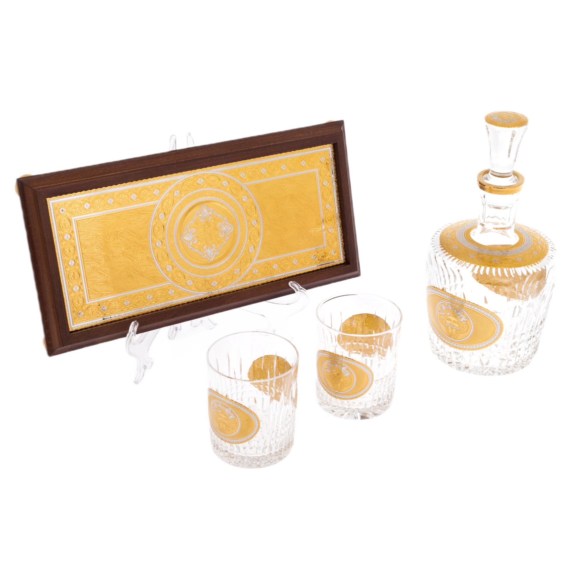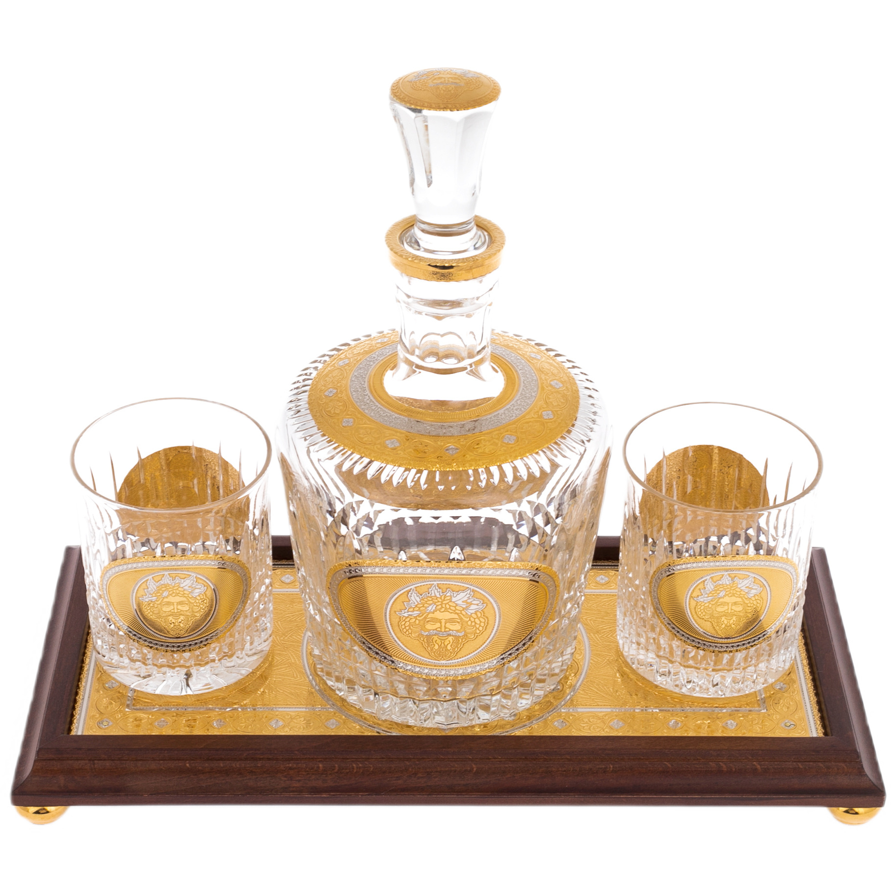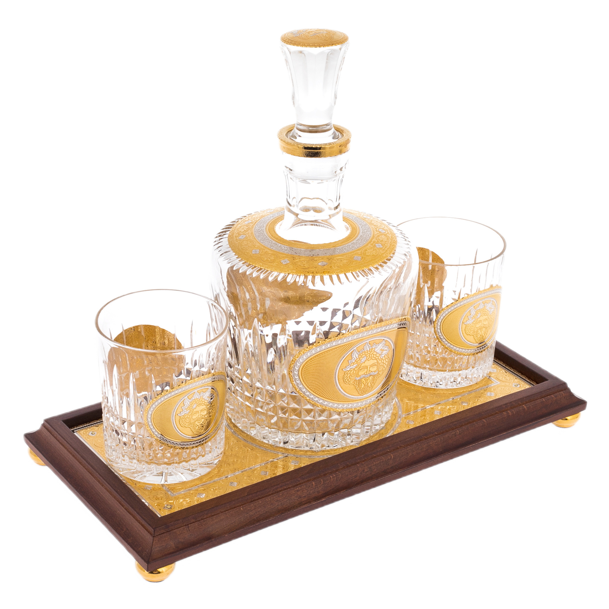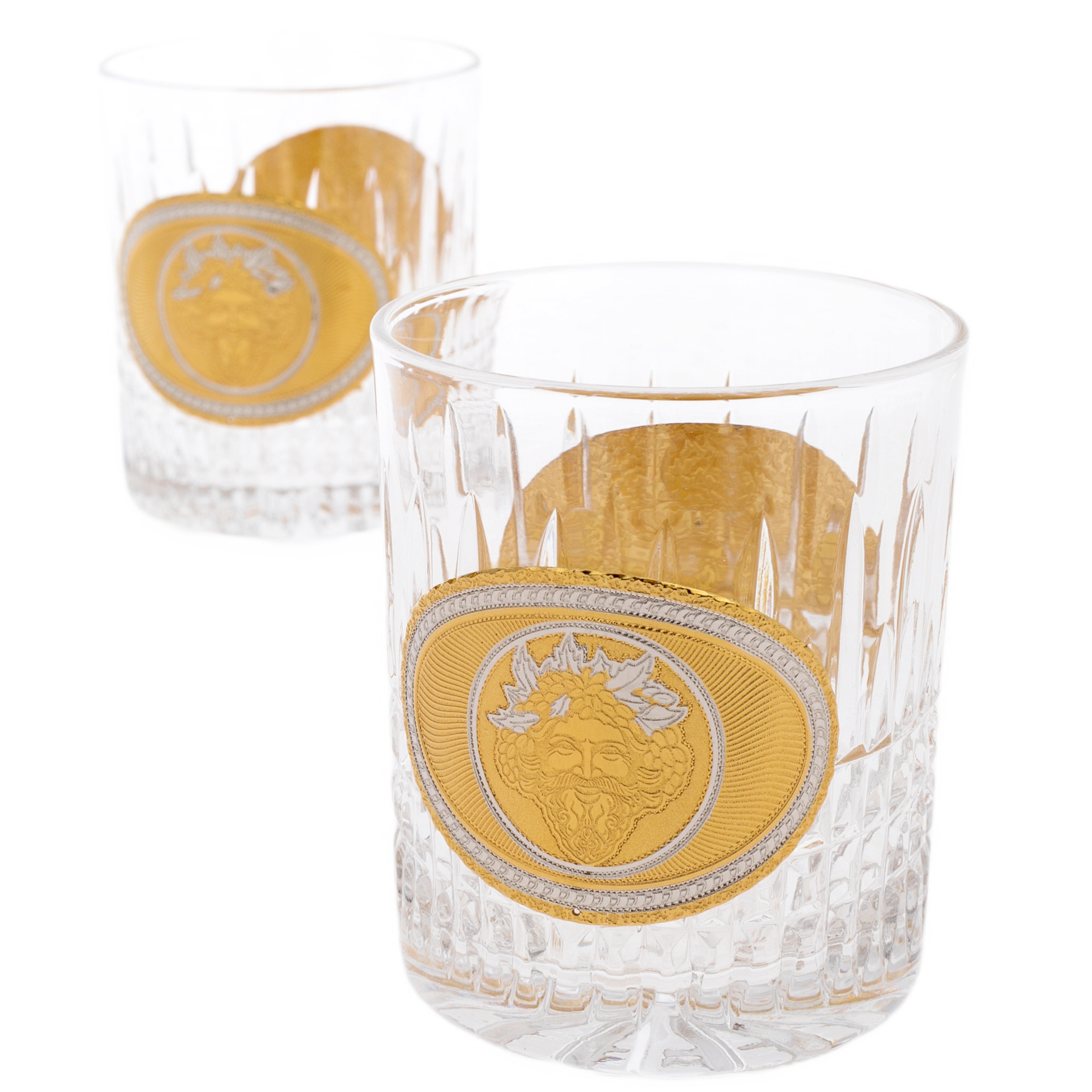 Два стакана, входящие в комплект, поражают своей изысканной геометрией и утончёнными деталями. Они созданы для тех, кто умеет ценить не только вкус напитка, но и эстетику момента. Каждый стакан декорирован медальоном, отражающим идею гармонии и щедрости, которыми пропитана сама природа.