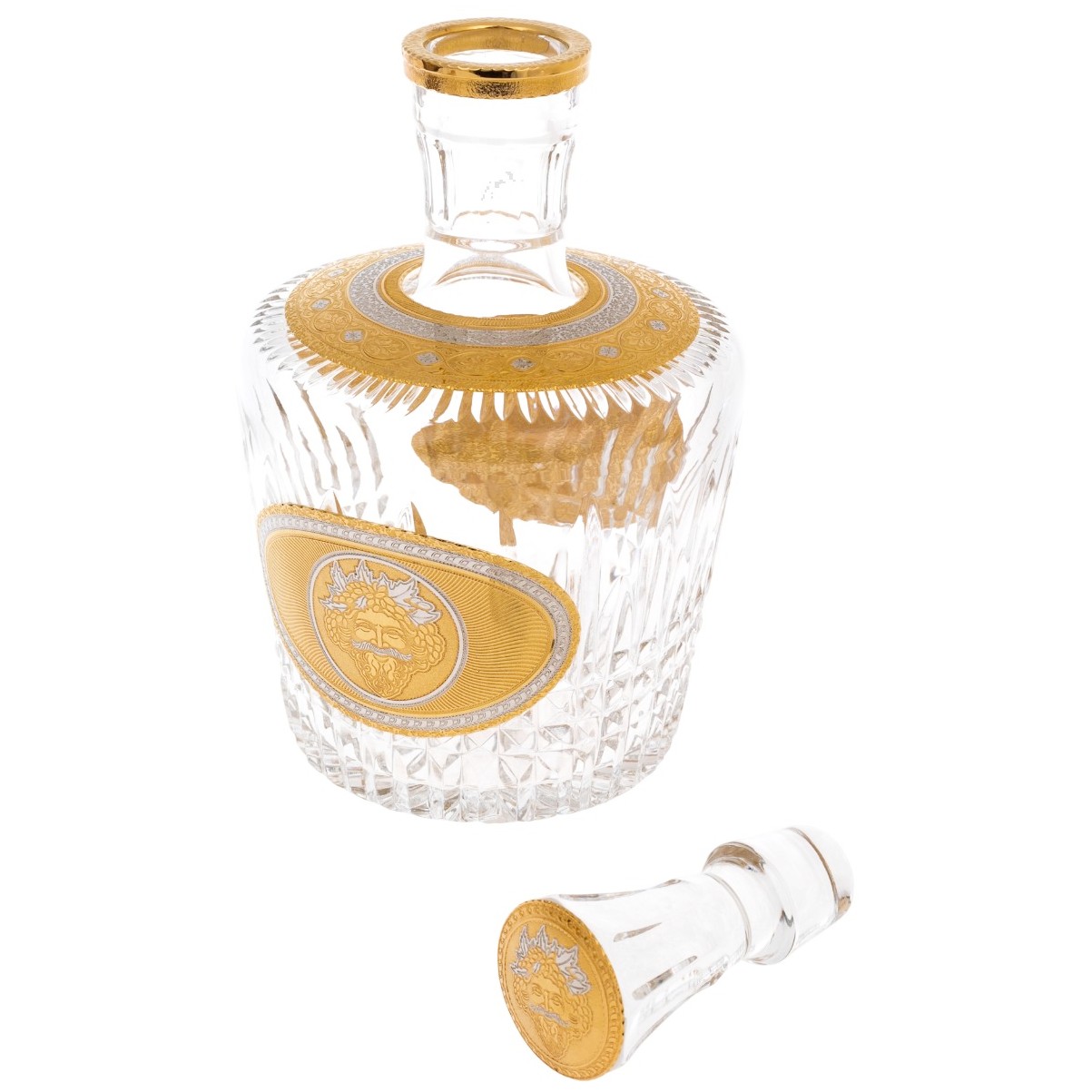 Декантер притягивает взгляд игрой граней, переливающихся на свету, как драгоценные камни. Его поверхность украшена золотыми медальонами с изображением Бахуса — символа изобилия и радости жизни. Элементы декора выполнены с использованием техники гравировки и позолоты, добавляющей благородства каждому штриху. Герметичная крышка, повторяющая узоры сосуда, сохраняет аромат и вкус благородного напитка, превращая каждый глоток в ритуал наслаждения.