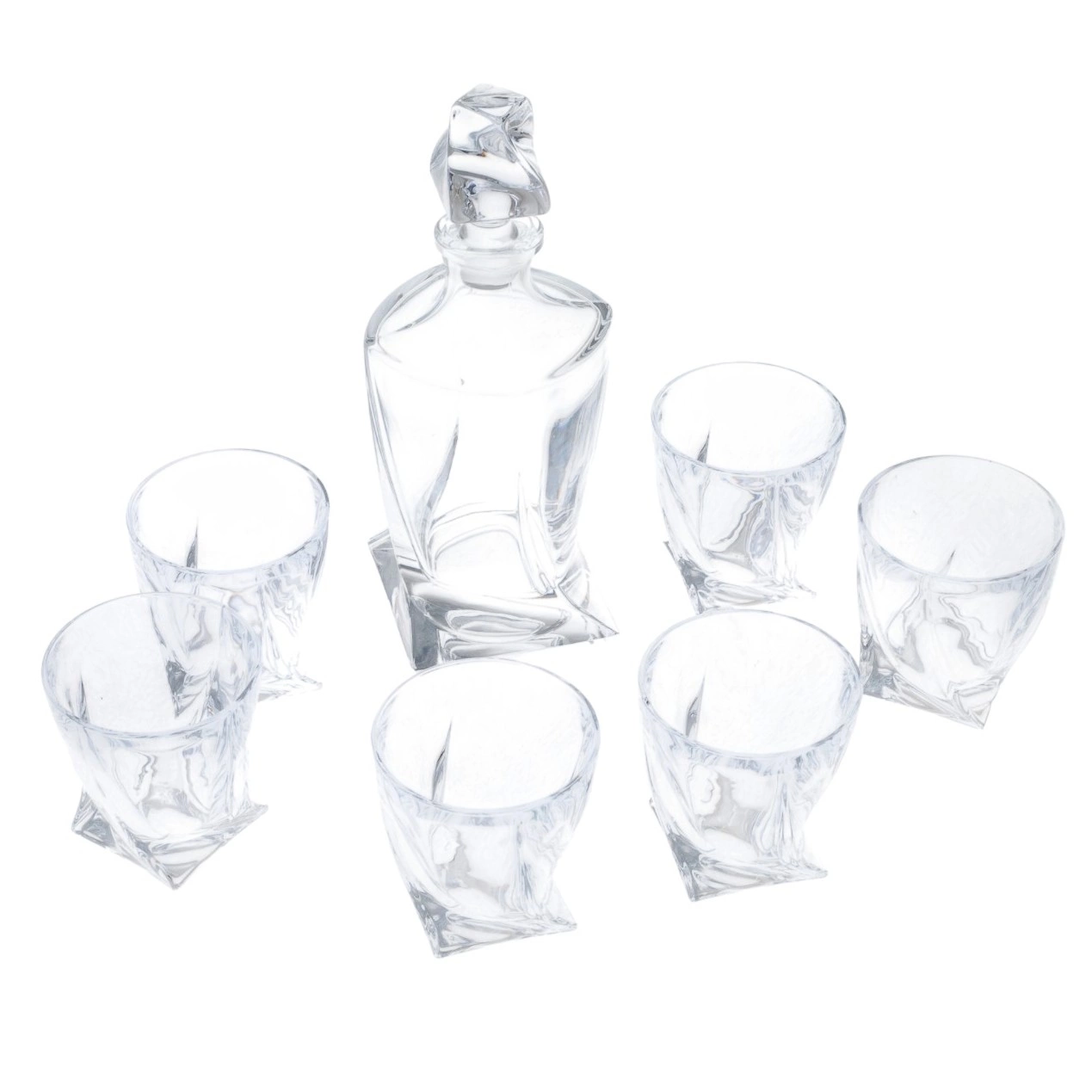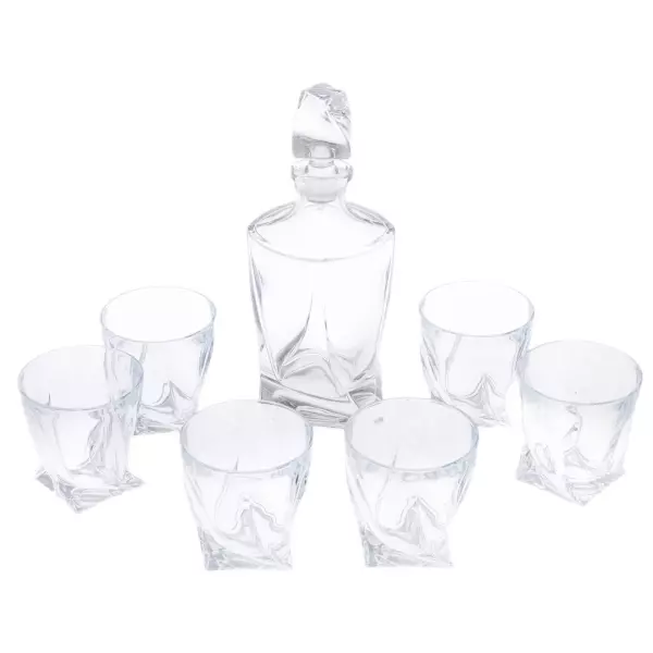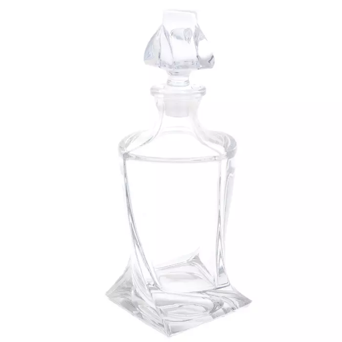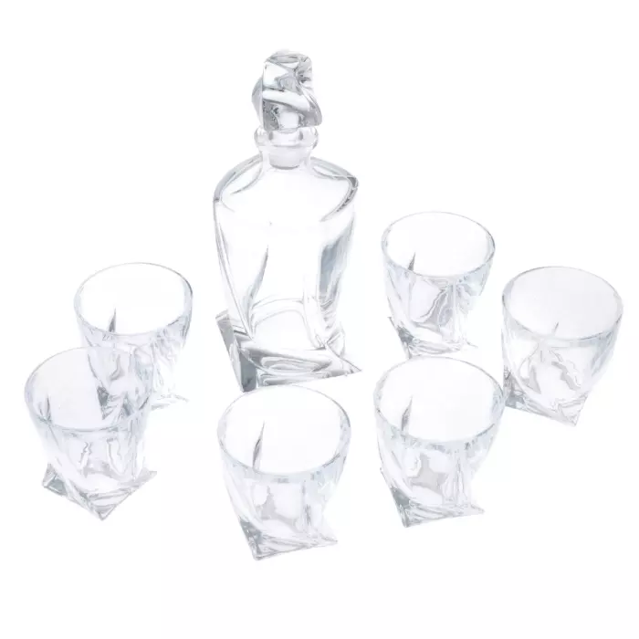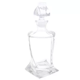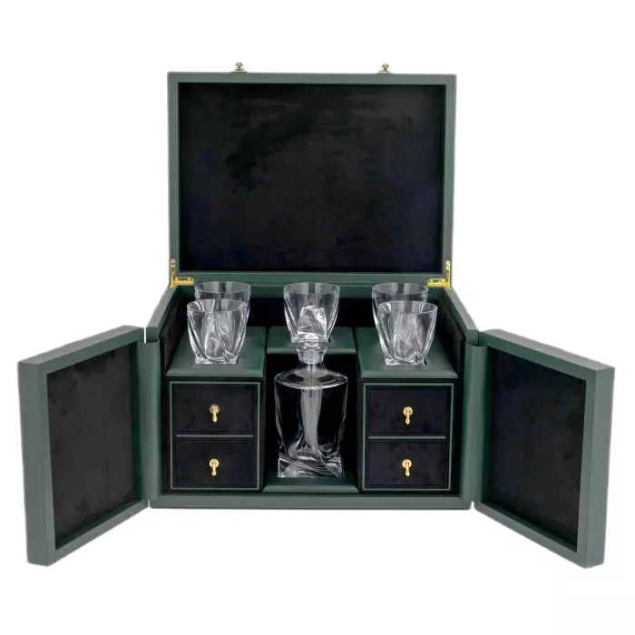 Основой набора служит высококачественное стекло, обладающее чистотой и прозрачностью, позволяющей раскрывать оттенки напитка без искажений. Графин, установленный на устойчивом основании, отличается выразительной пластикой стенок, мягко искажающих свет и формирующих характерный силуэт, а пробка, повторяющая геометрию корпуса, завершает образ целостной формы. Бокалы, имеющие слегка расширяющийся вверх силуэт, удобно ложатся в руку, при этом их гранёная структура усиливает визуальное восприятие напитка. Дополняющий набор футляр из натуральной кожи придаёт изделию завершённость и удобство хранения, защищая стекло и подчеркивая премиальный характер предмета.