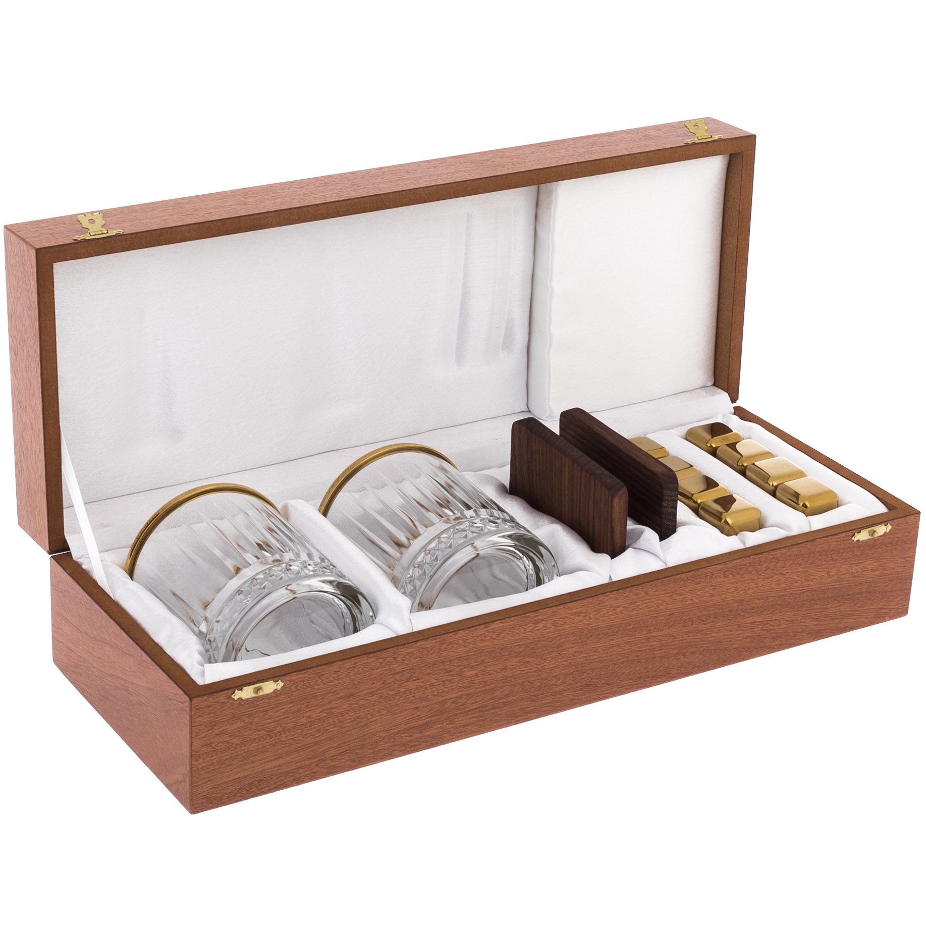 Бокалы для виски в деревянном футляре станут отличным подарком руководителю и чиновнику на любое торжество. Изысканные и элегантные бокалы ручной работы станут настоящим украшение Вашего стола и царским подарком для любого мужчины. Великолепное сочетание стекла первоклассного качества, которое не тускнеет при мытье и не теряет тонкости звона, и ювелирно выполненного художественного литья.