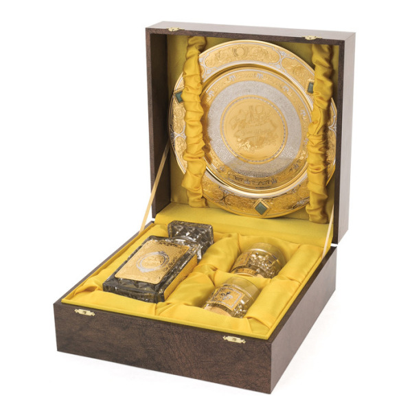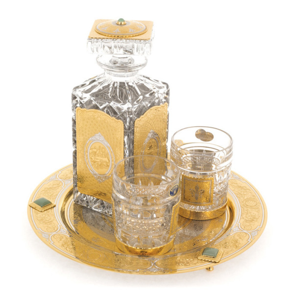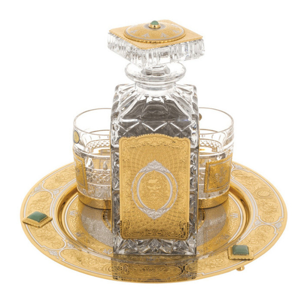 Набор для виски "In vina veritas" с подносом, на 2 персоны, ЗлатоустНабор для виски "In vina veritas" с подносом, на 2 персоны, ЗлатоустНабор для виски «In Vina Veritas» — это не просто сервировочный комплект, а утверждение статуса и вкуса, зафиксированное в хрустале и металле. Декантер и два стакана из прозрачного хрусталя в благородной огранке отражают свет, словно драгоценные камни, играя бликами на поверхности. Их оформление вручную покрыто золочёными вставками, украшенными тончайшей гравировкой — результат филигранной работы мастеров из Златоуста. Все элементы размещены на подносе из ценной древесины, дополненном массивными литыми ручками и гравированным полем с пейзажем — словно из окна винного шато.
