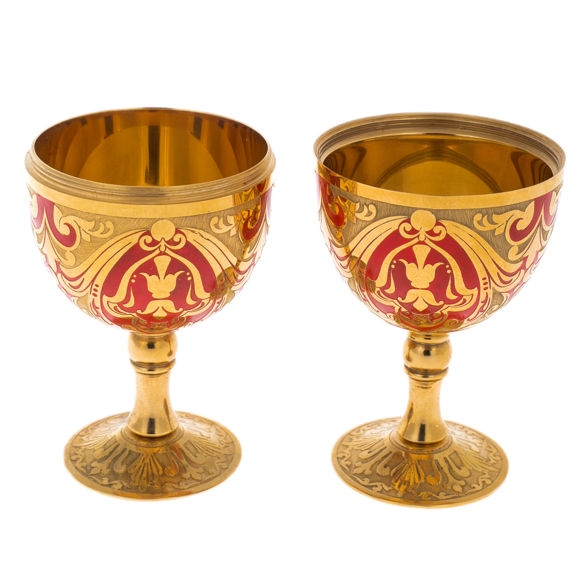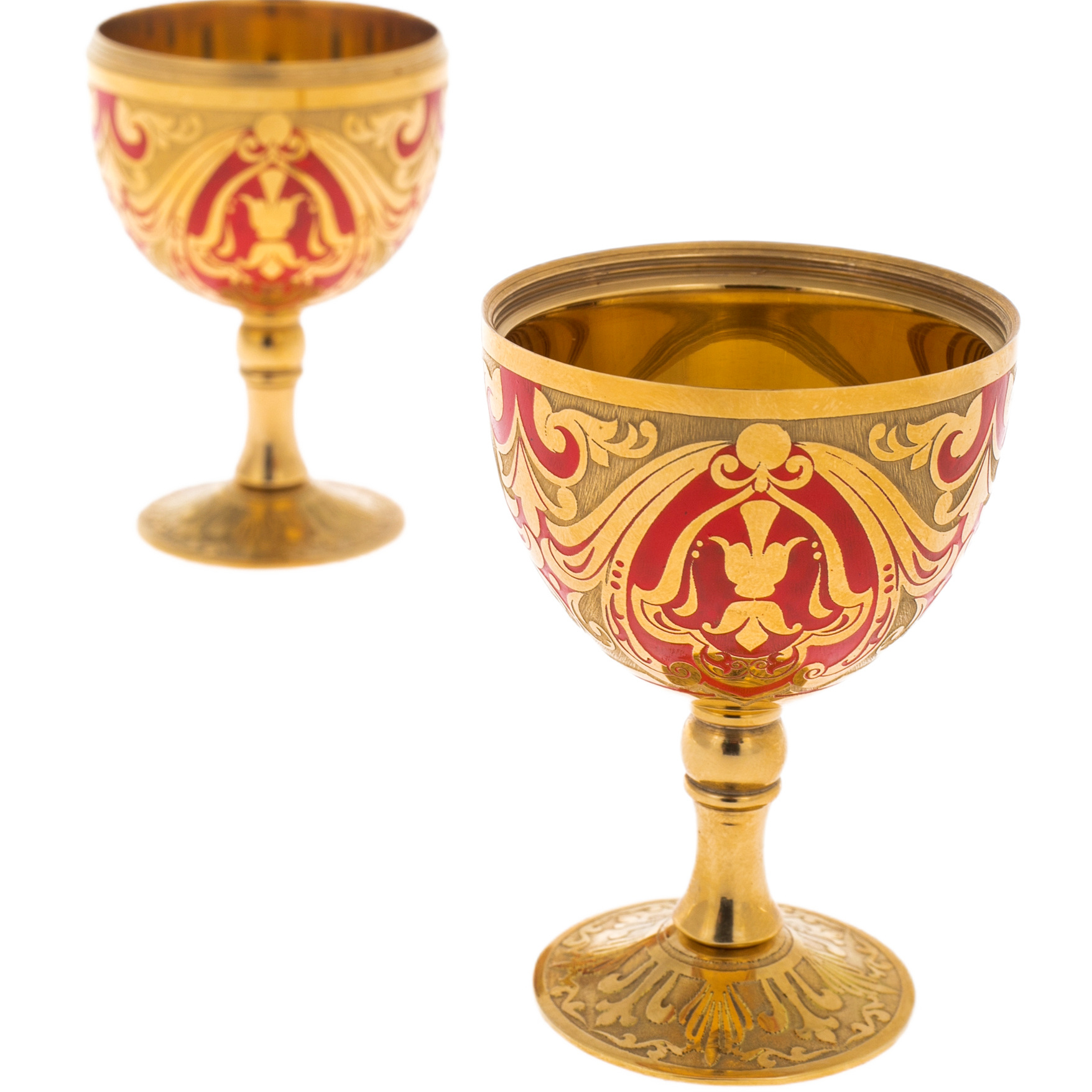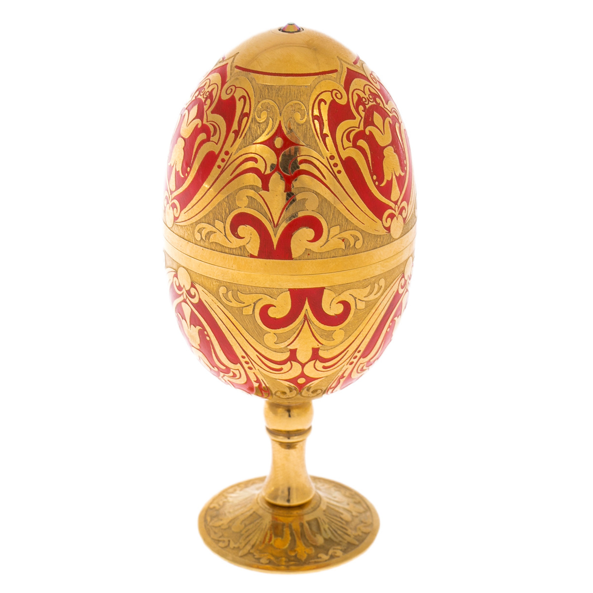 Изящный набор, скрытый в форме пасхального яйца, словно артефакт из времен золотого века русского императорского двора, воплощает идею интимного торжества вдвоём. Поднимая верхнюю часть, владелец раскрывает две миниатюрные рюмки на ножке, искусно вписанные в изначальный силуэт яйца. Каждая рюмка, будучи логическим продолжением композиции, демонстрирует полное совпадение орнамента с внешним оформлением футляра, создавая ощущение тайны и художественного единства. Плавная линия стебля и округлая чаша, покрытая теплым сиянием золота, подчеркивают камерный, но торжественный характер застолья, где всё начинается с жеста и завершается чувством.
