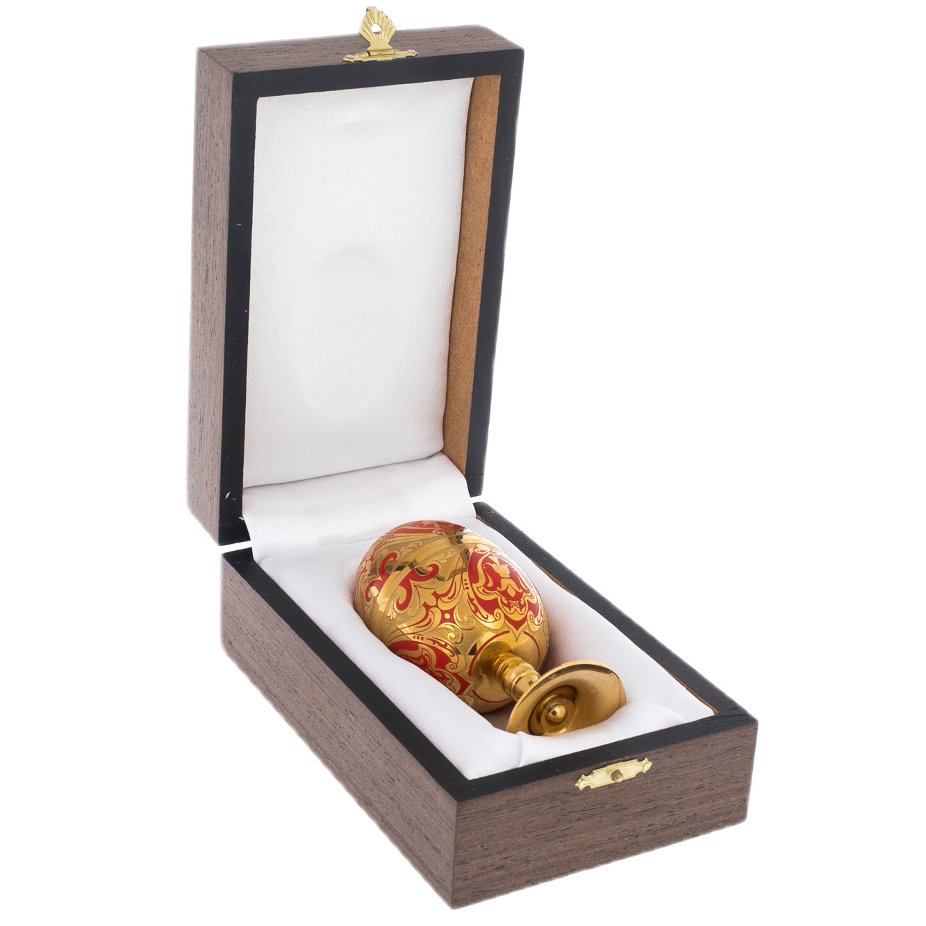 Художественный смысл заложен не только в визуальной гармонии, но и в самой символике формы: яйцо — как источник жизни и начала, золото — как символ вечности, пара рюмок — как олицетворение союза, доверия и особого ритуала. Презентационный футляр из натурального дерева с мягкой внутренней отделкой завершает образ подарка, достойного коллекционера, дипломата или человека, к которому питают глубокое уважение.