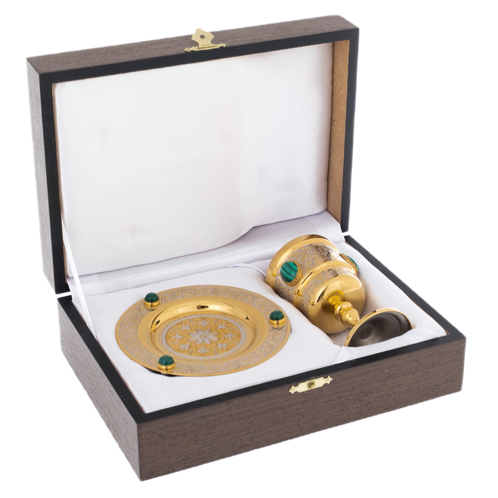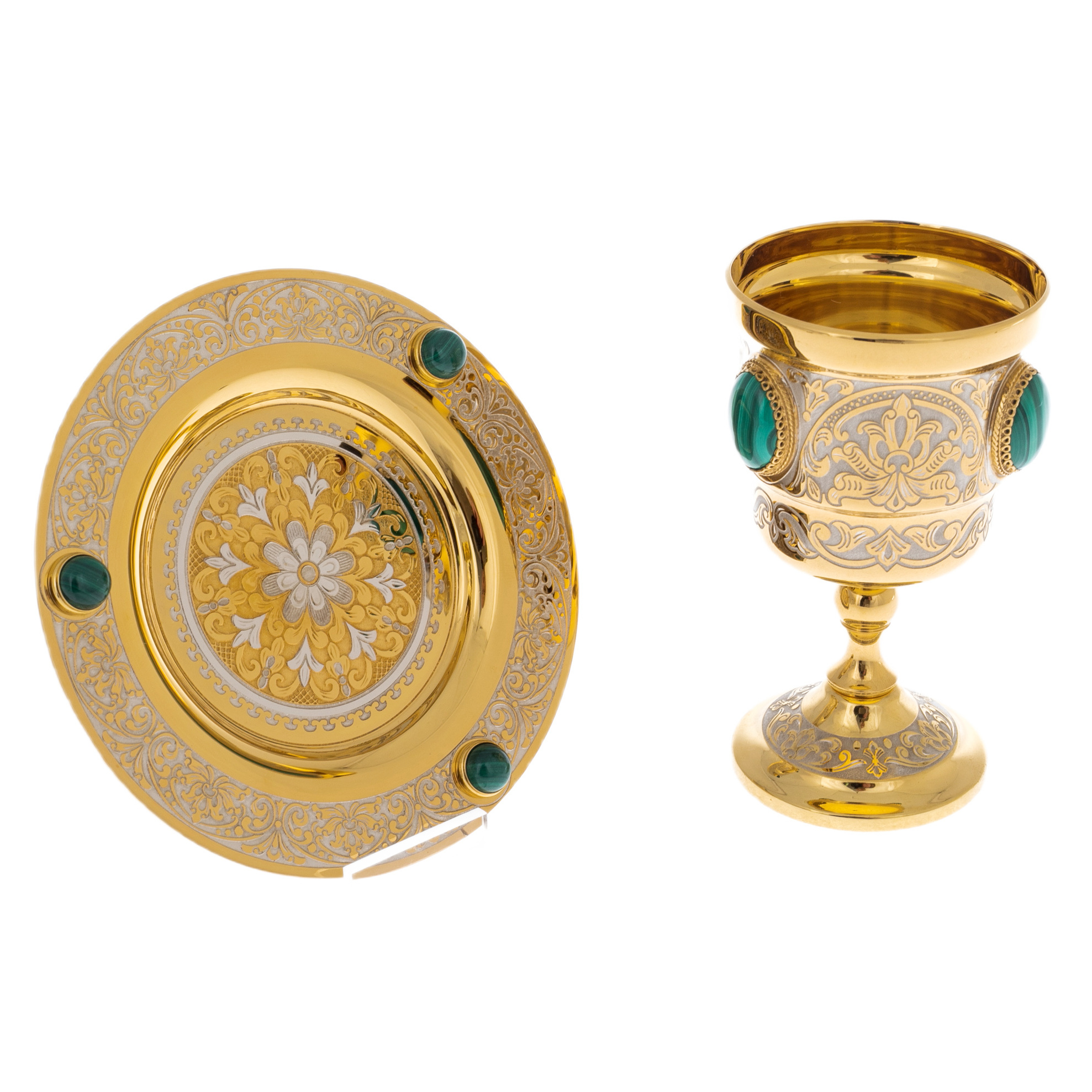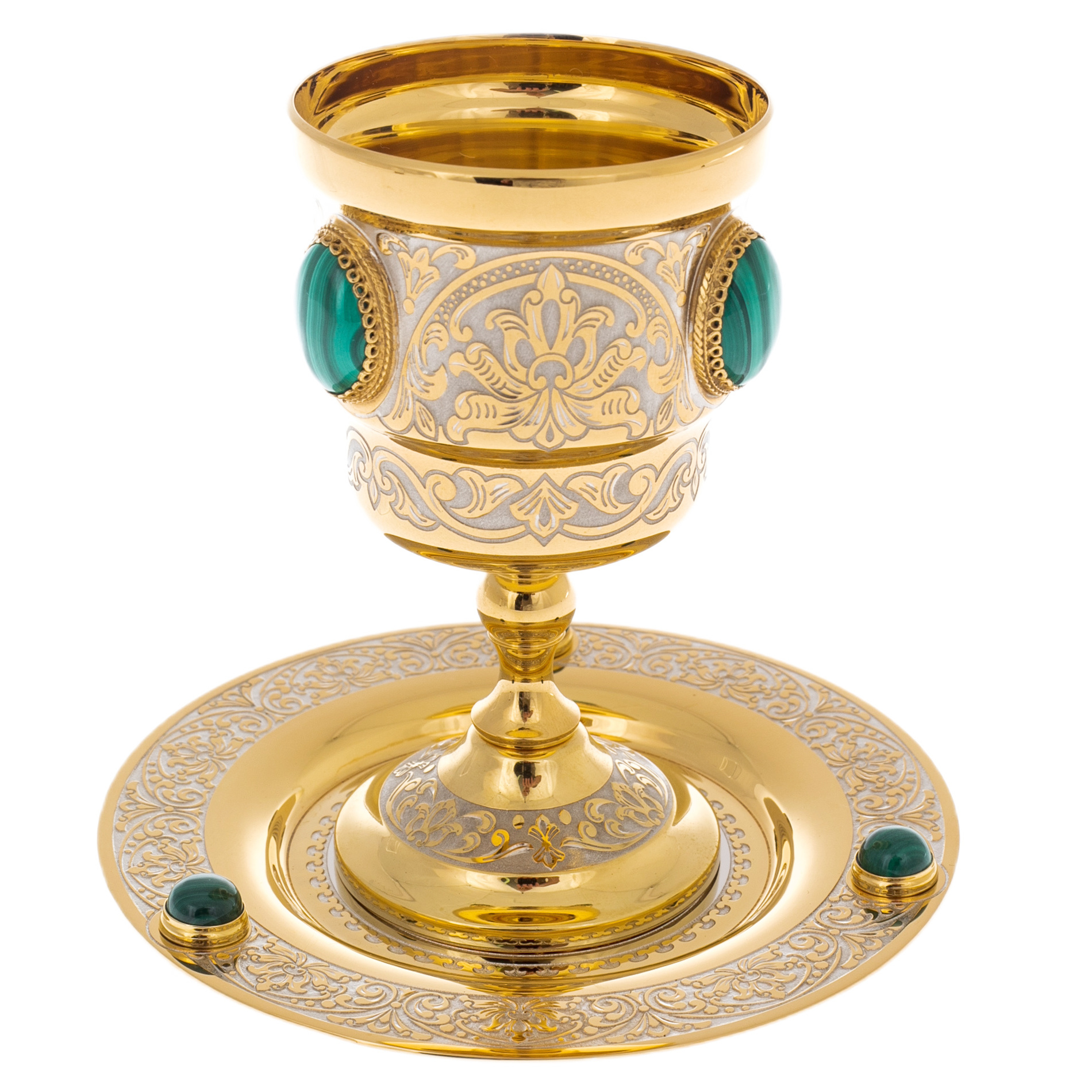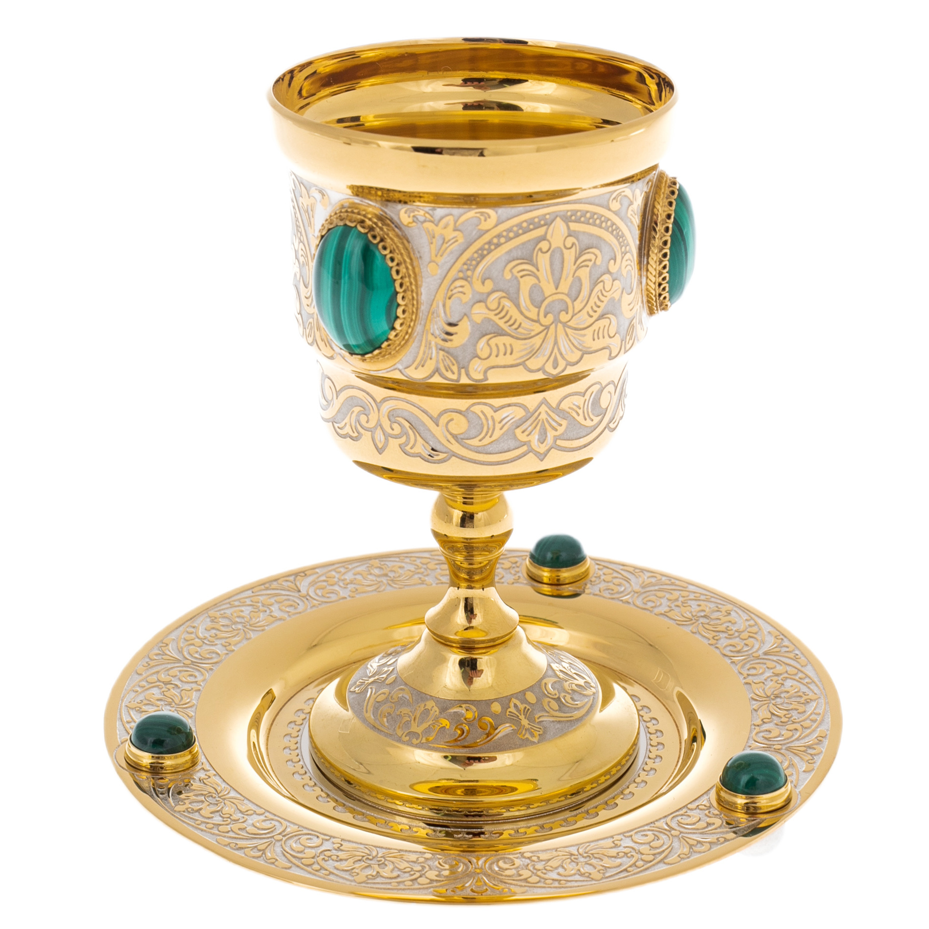 Изысканный орнамент, выполненный на поверхности чарки и блюдца, подчеркивает мастерство и внимание к деталям. Гравировка изумительно сочетается с золотыми и никелевыми элементами, создавая впечатление величия и гармонии. Малахитовые камни, расположенные на чаше и блюдце, символизируют природное богатство и являются изюминкой этого набора.