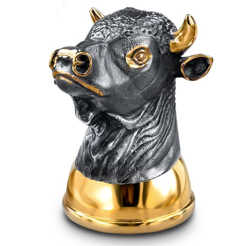 Стопка-перевёртыш «Бык» — выразительный и символически насыщенный предмет, в котором мощь животного воплощена в благородном серебре. Выполненная в виде головы быка с массивными рогами и уверенным, чуть надменным выражением, она сразу заявляет о характере владельца. Модель сочетает скульптурную точность и ювелирную эстетику: каждая складка кожи, каждый изгиб ноздри проработан с виртуозной детализацией. Стопка переворачивается и становится устойчивым сосудом для крепких напитков, а в состоянии покоя превращается в миниатюрную скульптуру с мощным визуальным и энергетическим зарядом.