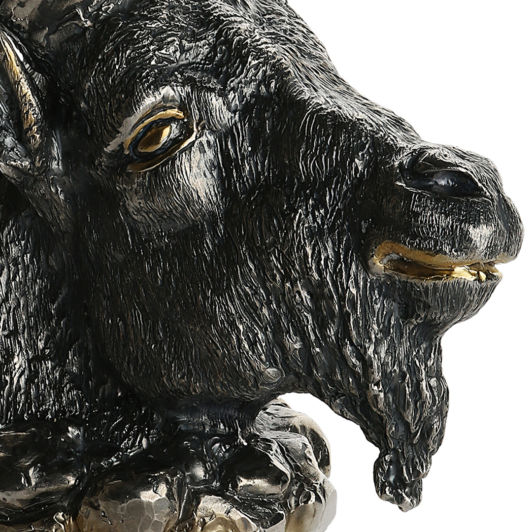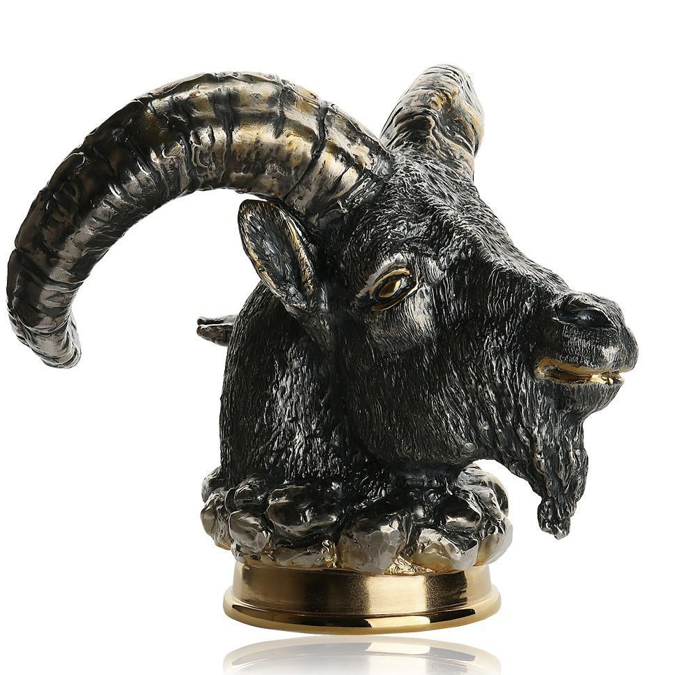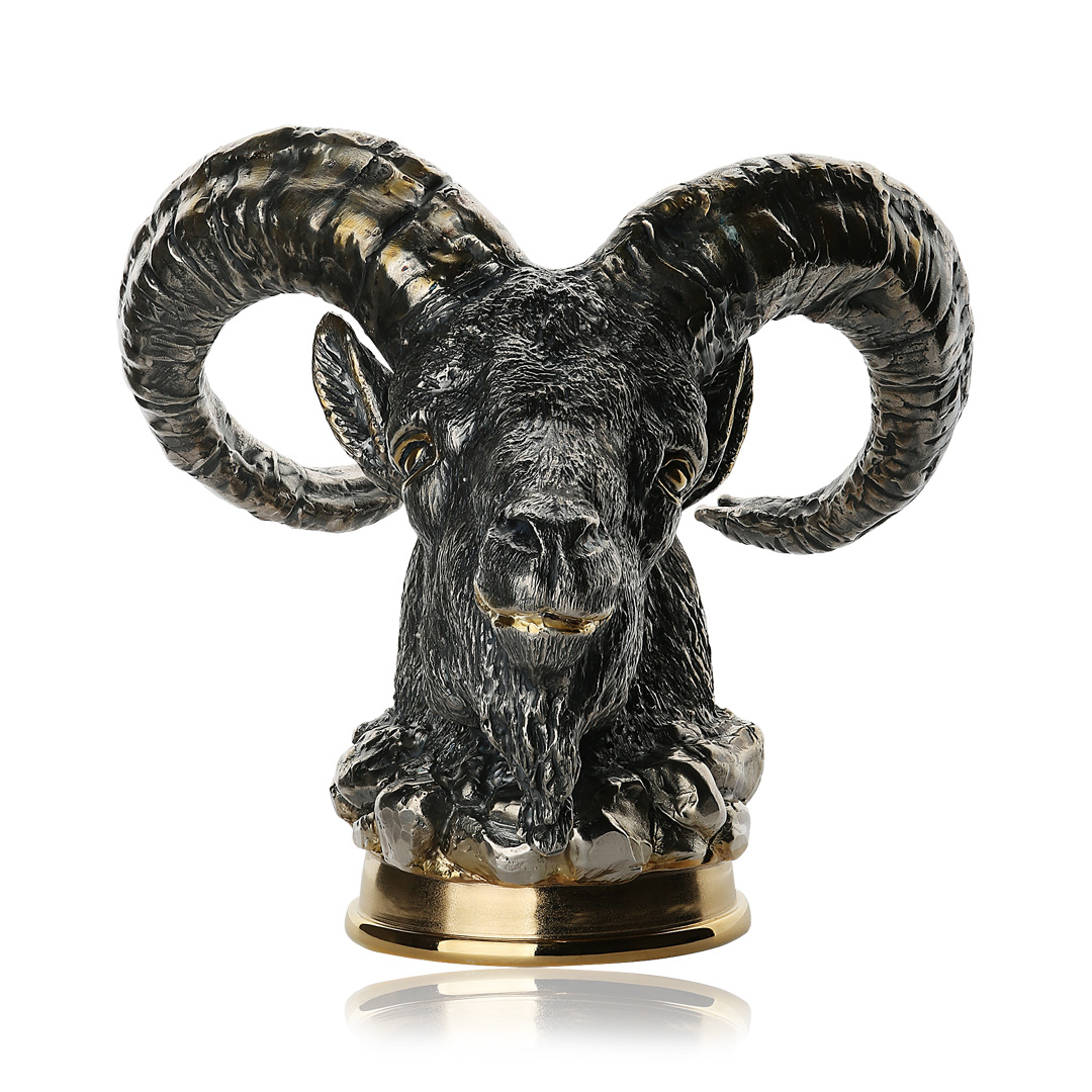 Технология создания требует высочайшей точности: скульптурная часть отлита из серебра с последующей патинировкой, подчёркивающей глубину и реалистичность фактуры. Золотые акценты на глазах, морде и рогах придают фигуре благородную контрастность, усиливая сходство с трофеем, достойным охотничьего зала или кабинета. Всё исполнено вручную, с вниманием к мельчайшим деталям, где каждая линия несёт образ силы, выносливости и упрямой воли к победе.