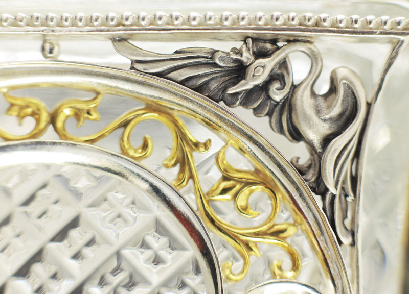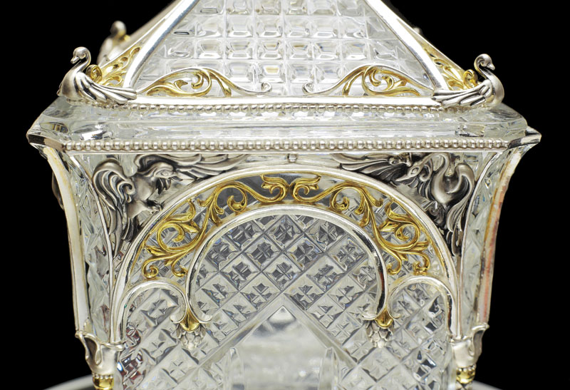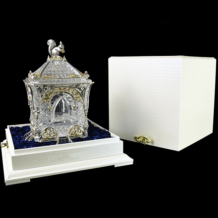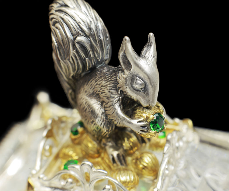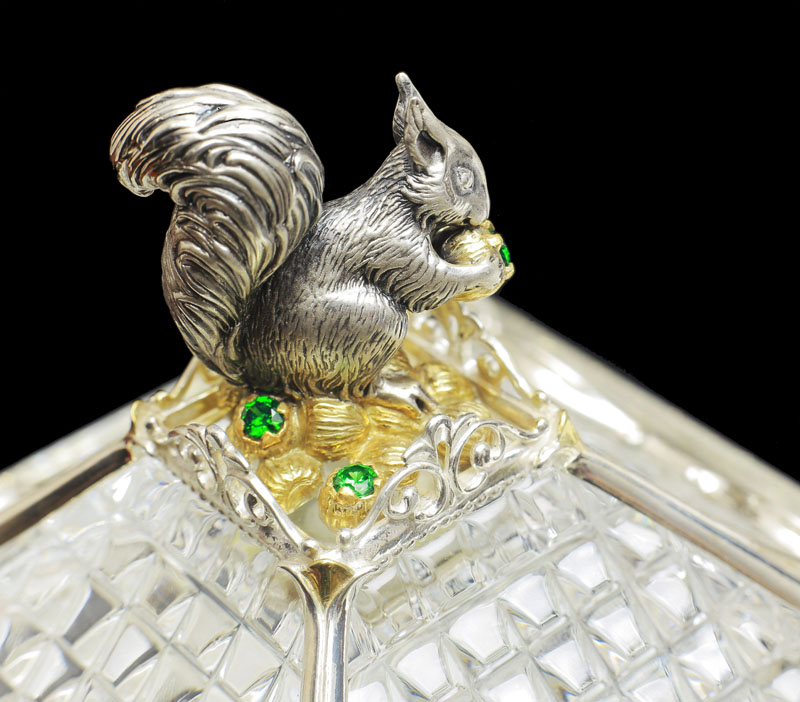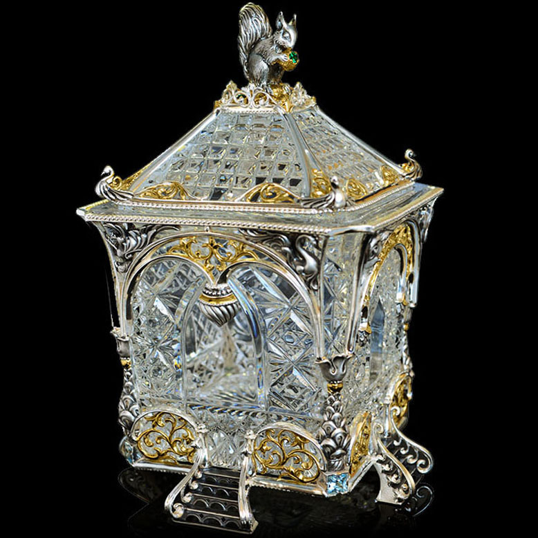 Как и у Ели, хрустальная основа сахарницы обрамлена изящным серебром. Резной орнамент архитектуры тех времен был не просто украшением — он нес в себе особый смысл. Наш домик не исключение — в исконно русских традициях здесь изображены сюжеты сказки, символизирующие борьбу добра со злом. Строгие архитектурные элементы оживляются золоченым растительным орнаментом, что создает гармоничный ансамбль творений природы и человека. В центре внимания, конечно же, главный персонаж сюжета — Белочка. Она с большой ловкостью разгрызает свои золотые орешки, вынимая при этом драгоценные изумруды.