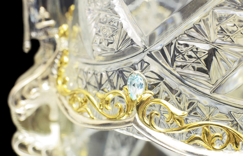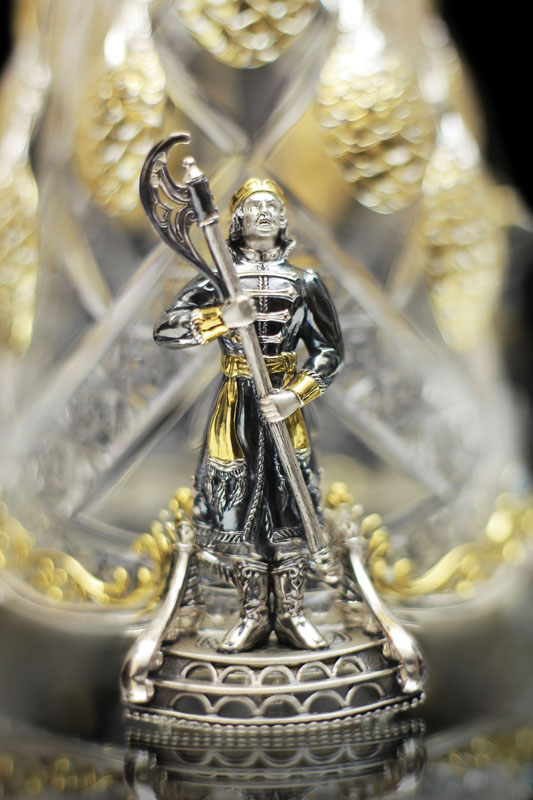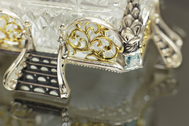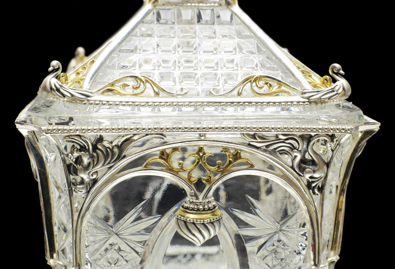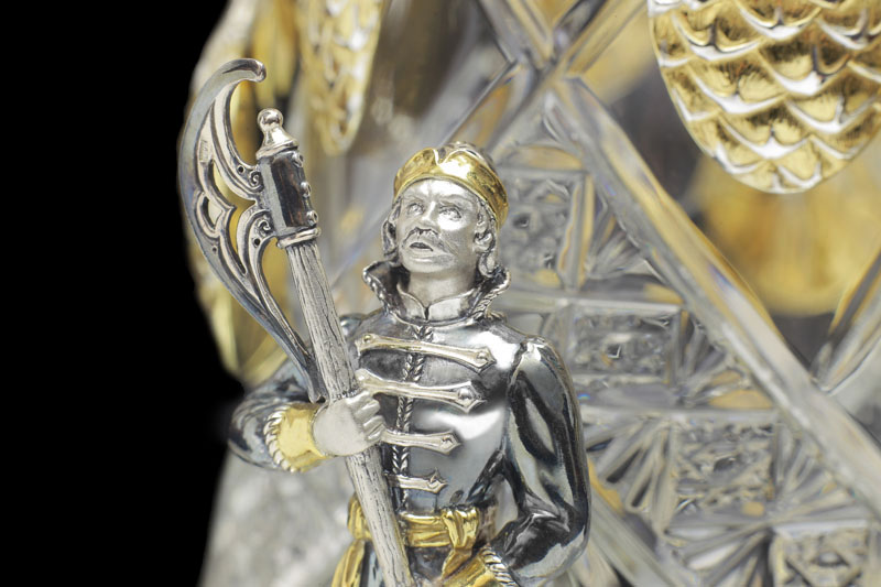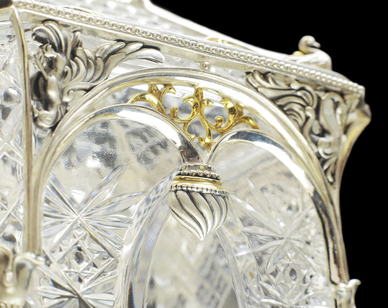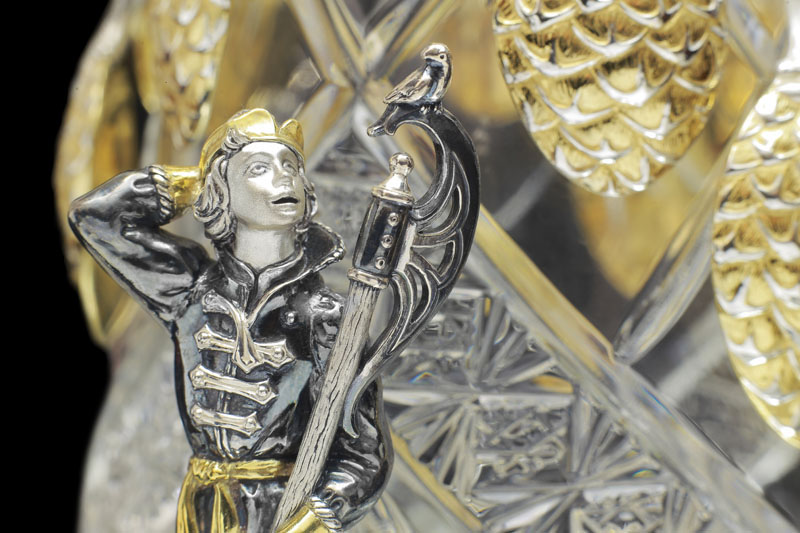 Как и у Ели, хрустальная основа сахарницы обрамлена изящным серебром. Резной орнамент архитектуры тех времен был не просто украшением — он нес в себе особый смысл. Наш домик не исключение — в исконно русских традициях здесь изображены сюжеты сказки, символизирующие борьбу добра со злом. Строгие архитектурные элементы оживляются золоченым растительным орнаментом, что создает гармоничный ансамбль творений природы и человека. В центре внимания, конечно же, главный персонаж сюжета — Белочка. Она с большой ловкостью разгрызает свои золотые орешки, вынимая при этом драгоценные изумруды.
