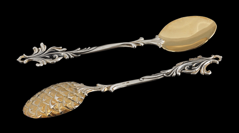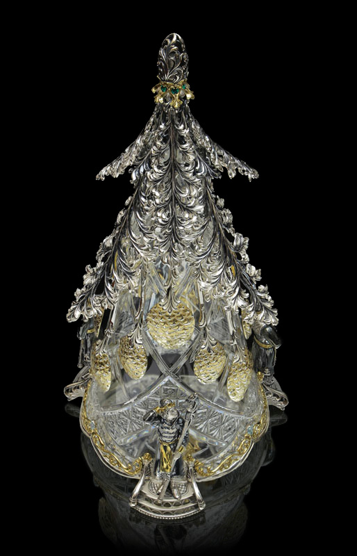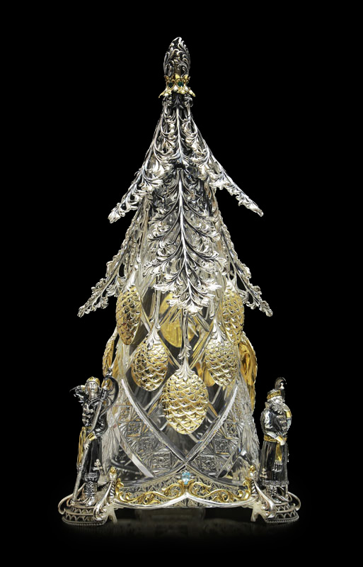 Изящный хрусталь Ели послужил основанием для благородной серебряной оправы — затейливых переплетений веток, удивительных сказочных шишек с орешками в золоченых скорлупках, загадочной верхушки, выглядывающей из золоченого воротника, украшенного изумрудами. Недаром слуги, приставленные к белочке, расположились под Елью: именно здесь растут те волшебные шишки, из которых наша затейница добывает орешки с изумрудами. Три стражника, каждый по-своему, несут свою службу. С ели, подняв веточку, удобно снимаются шишки — ложечки. Нижний край изделия подчеркивает декоративный орнамент. Его изящные золоченые элементы, украшенные голубыми топазами, создают гармоничное сочетание с другим предметом коллекции — сахарницей.