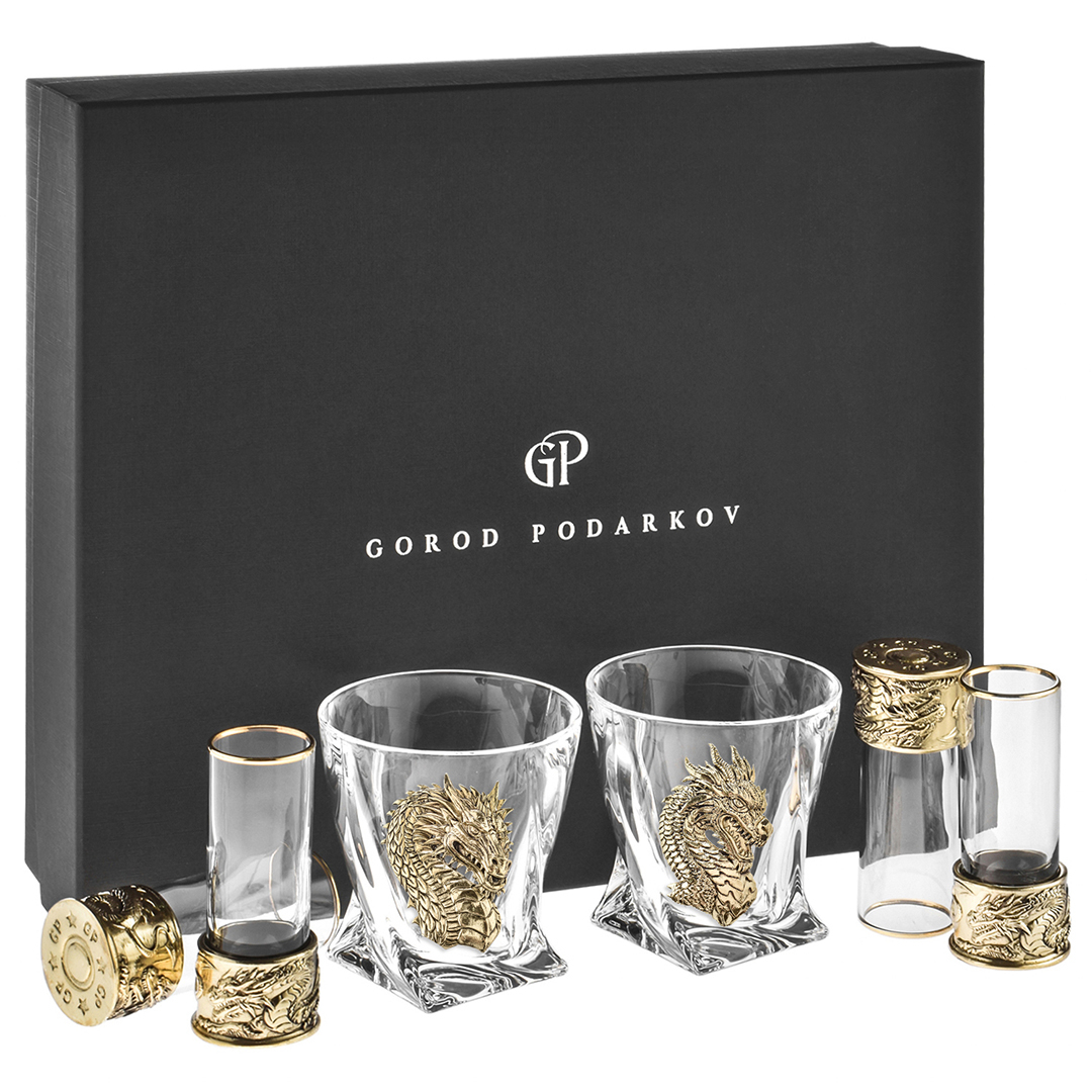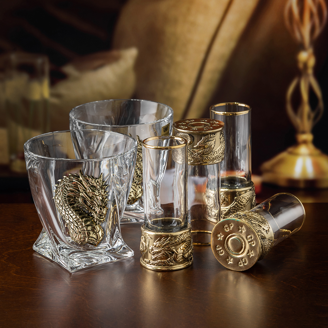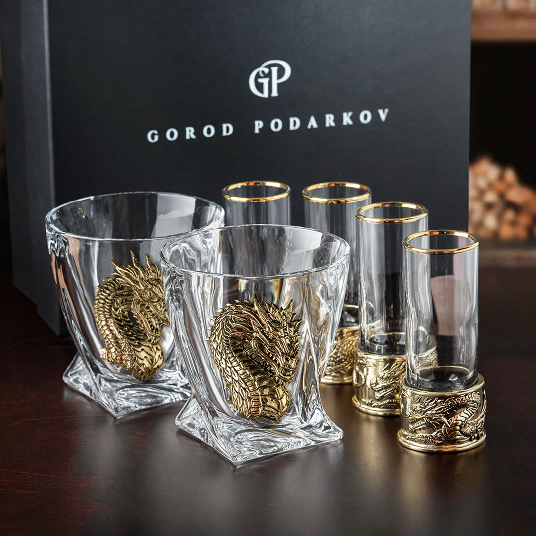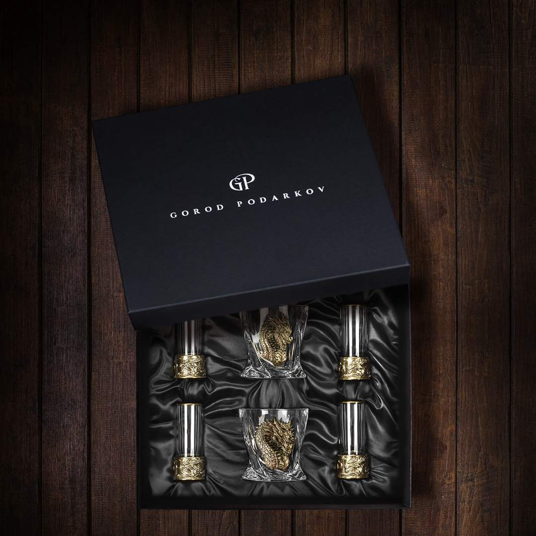 Этот набор будет прекрасным подарком для настоящих любителей виски и любого кто ценит интересный и элегантный дизайн. Наши бокалы и стопки не только высокого качества, но и имеют эффектный вид в виде гербового изображения дракона из металла, которое придаст дополнительный шарм вашему вечеру.