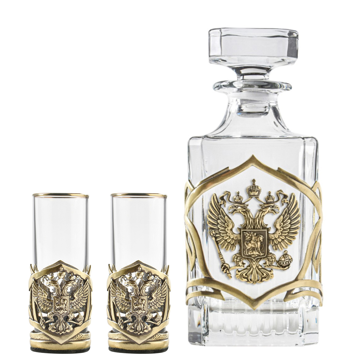 Набор для водки "Герб Российской Федерации" на 2 персоны — это исключительный пример утонченного стиля и величия, подходящий для тех, кто ценит не только элегантность, но и богатую символику. В его состав входят два стакана и графин, украшенные литыми латунными накладками, на которых изображен двуглавый орел — один из самых известных символов России, олицетворяющий её силу и стабильность. Каждая накладка, отлитая с высокой точностью, придает каждому предмету особую значимость и величие, превращая его в настоящее произведение искусства.