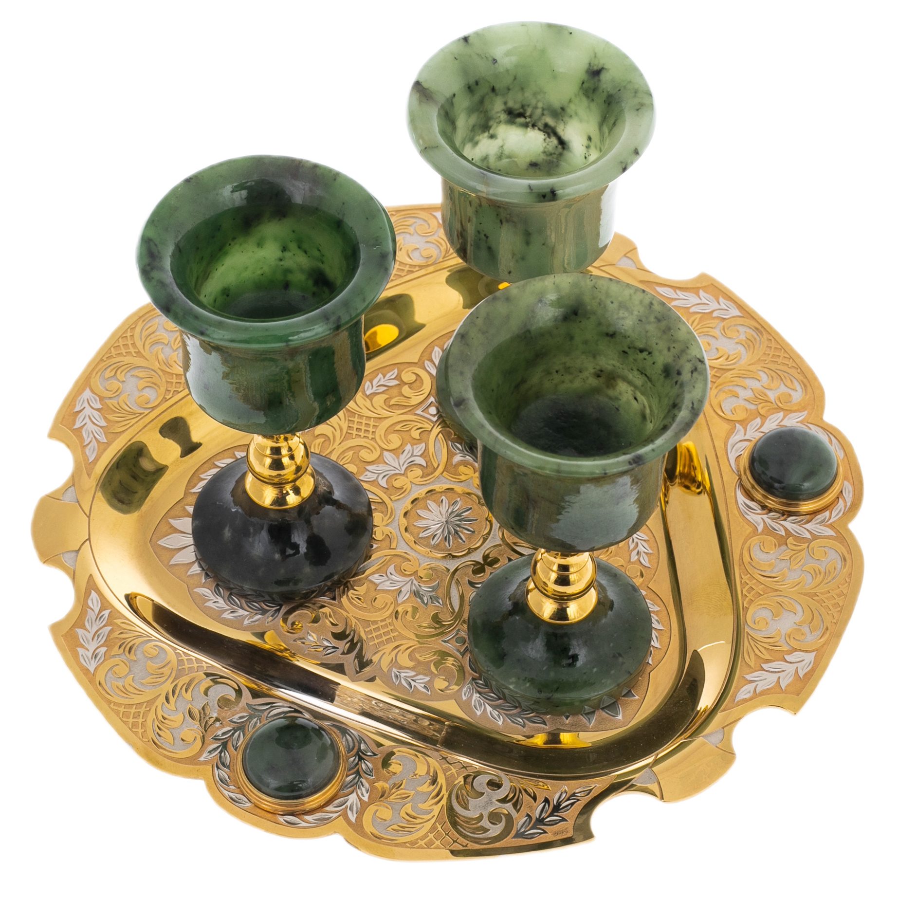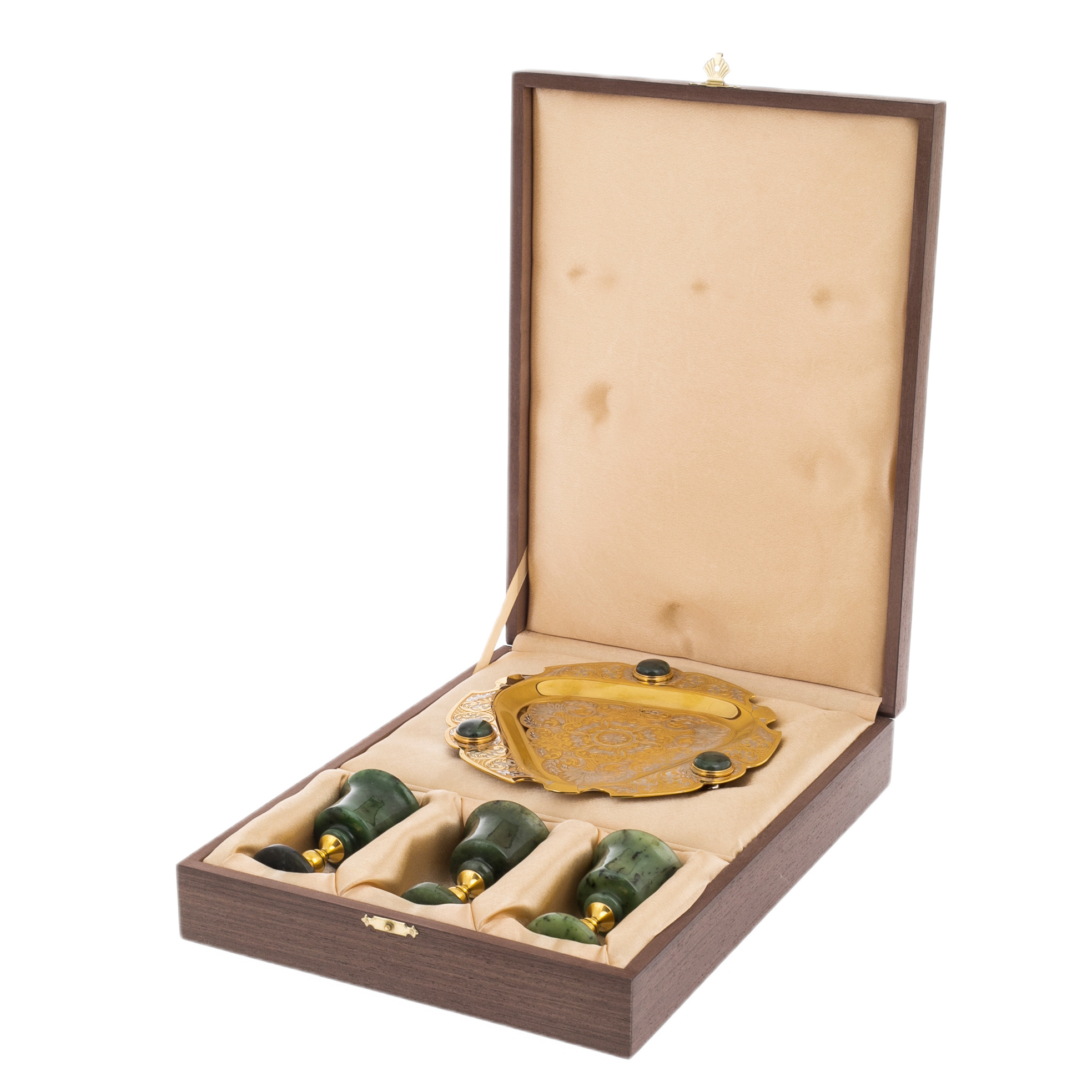 Форма бокалов немного расширена к краю, позволяя напитку раскрыться, подобно старинному секрету, известному лишь избранным. Каждый кубок опирается на массивное основание, подчеркивающее устойчивость и монументальность композиции. По краям подноса вставлены полированные нефритовые камни — символы защиты, мудрости и силы, напоминающие о традициях древних цивилизаций.