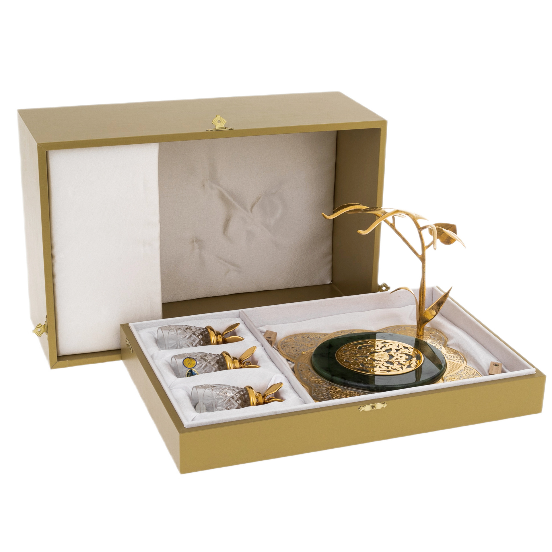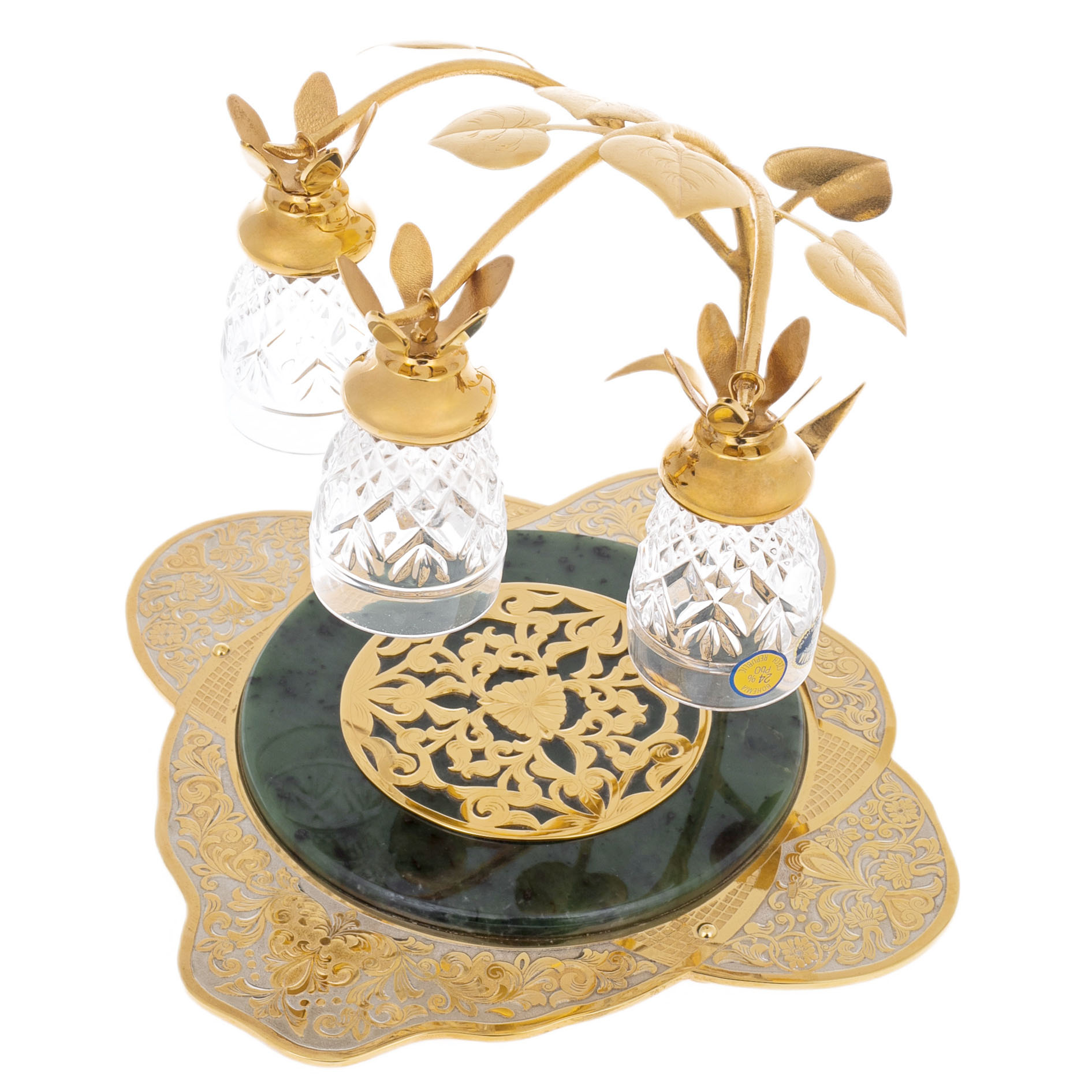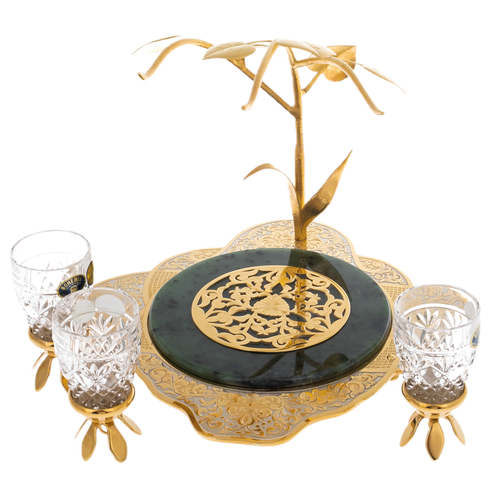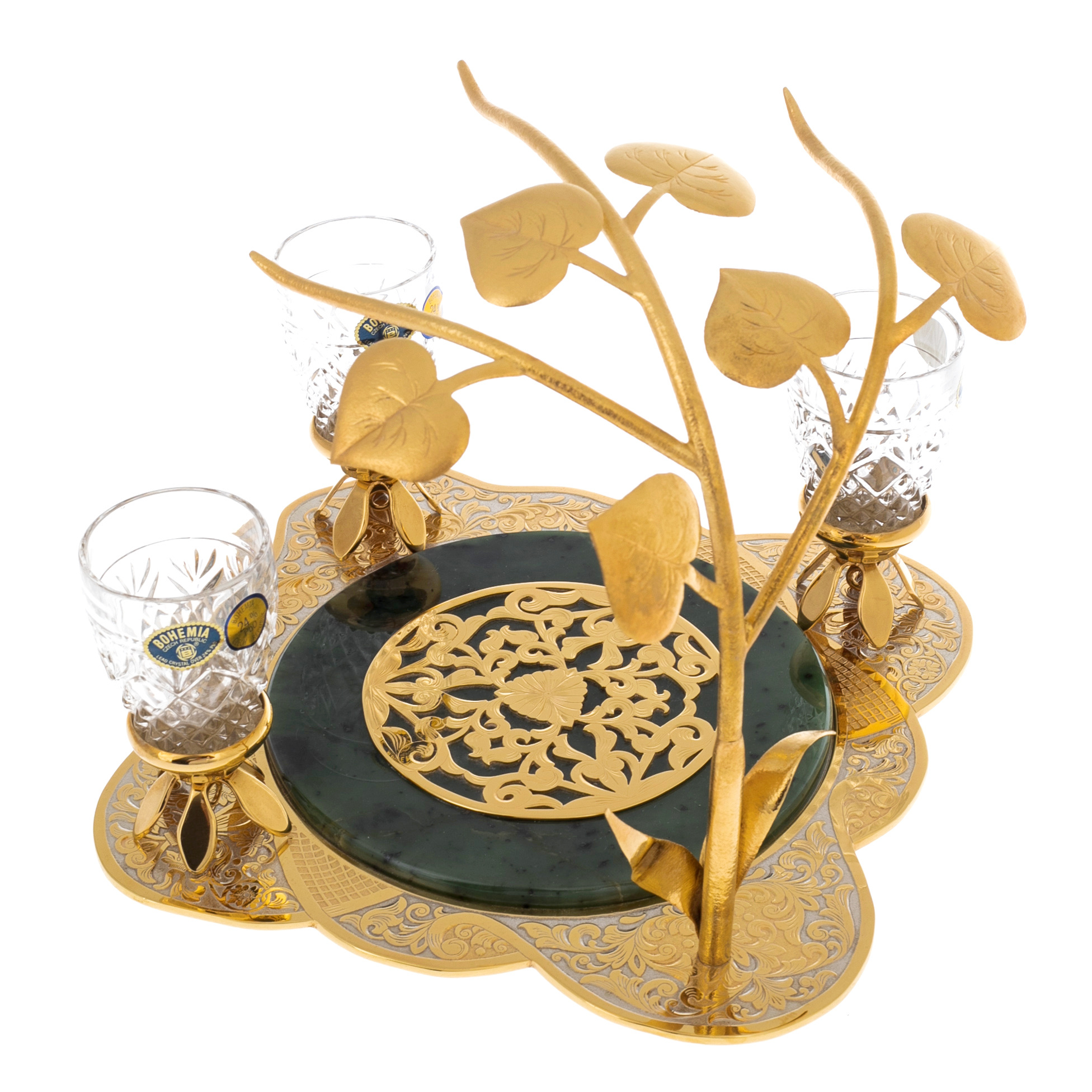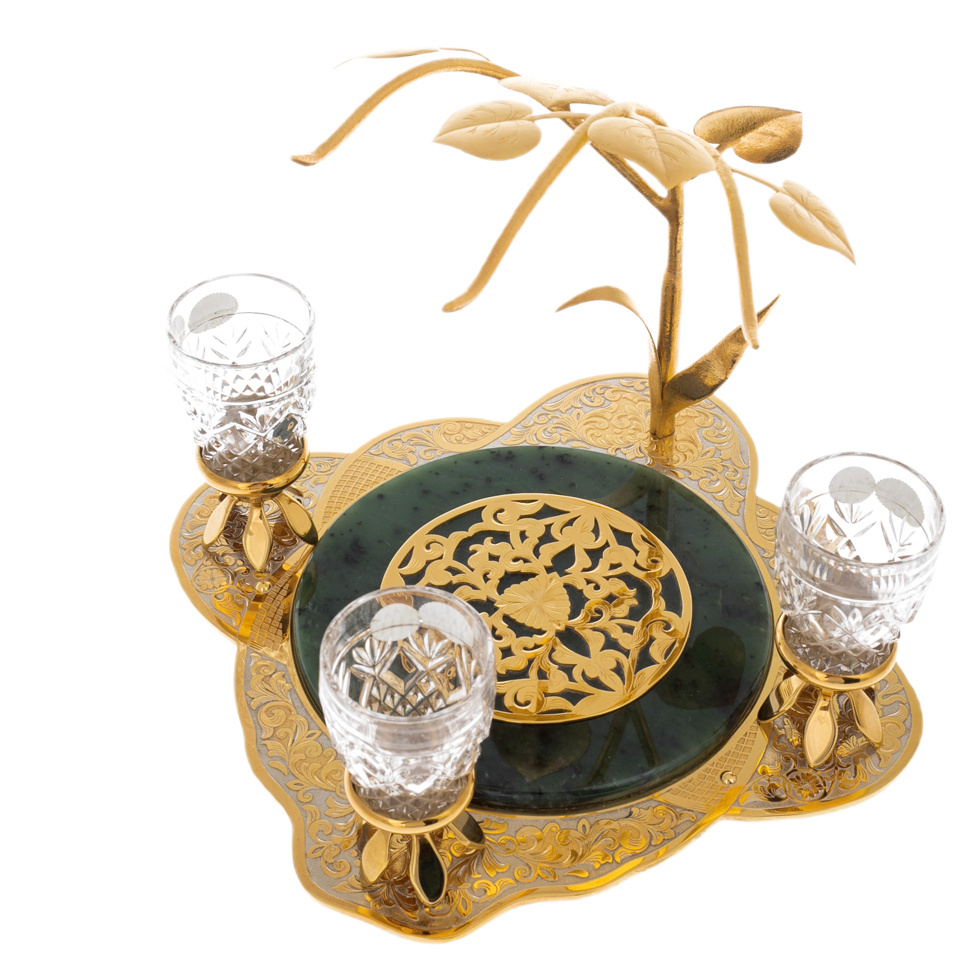 Центральный элемент набора — изысканная подставка с нефритовым основанием, символизирующим вечность и природную силу. Над ним возвышаются тонкие позолоченные ветви, несущие на себе три хрустальных стопки, словно драгоценные капли росы на рассвете. Филигранная гравировка на металлических деталях выполнена вручную в лучших традициях златоустовского мастерства. Золотой узор, вдохновленный классическими мотивами, подчёркивает роскошь и высокий статус этого подарка.