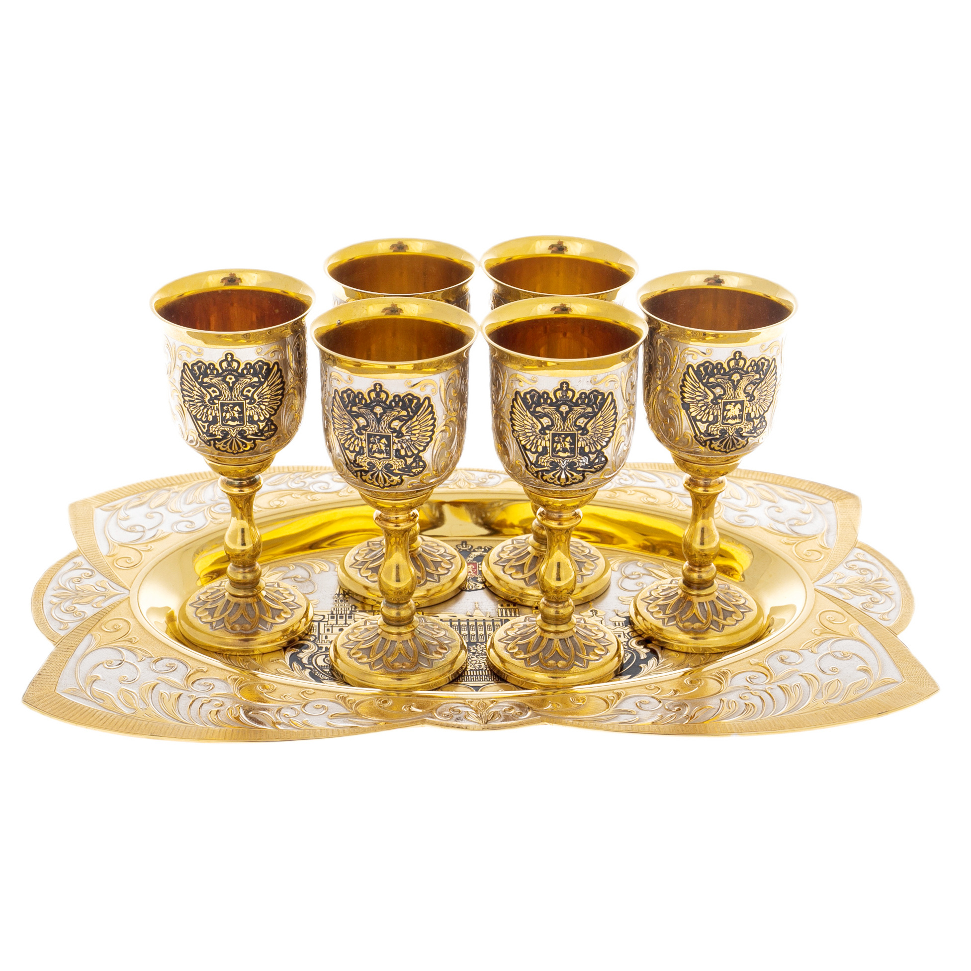 Набор из шести позолоченых стопок с гербом России на подносе с изображением Кремля — шикарный подарок человеку, облеченному властью. С одной стороны, это символ его безграничных возможностей. А с другой, напоминание о той высокой миссии, которая возложена на него страной.