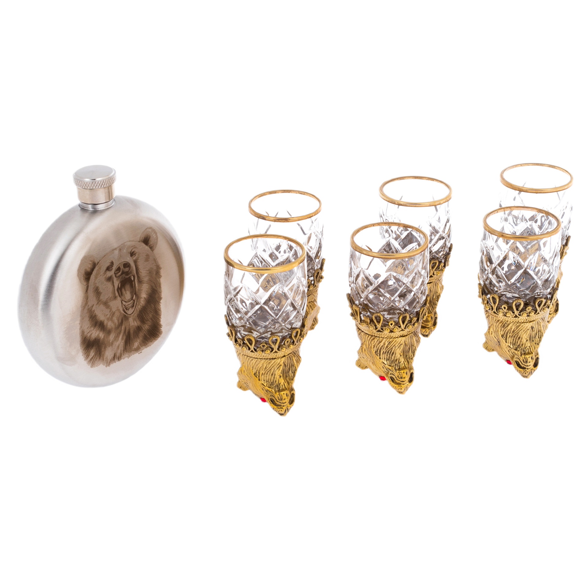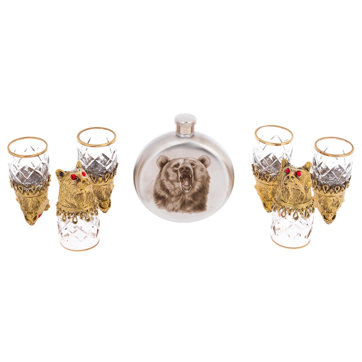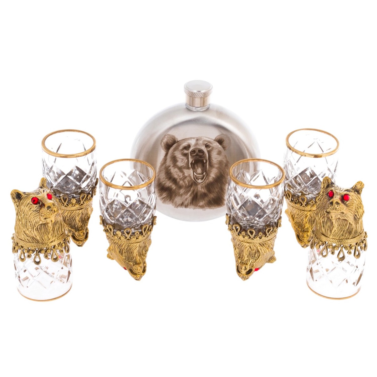 В центре композиции — фляга из нержавеющей стали, украшенная гравировкой грозного медвежьего оскала. Этот образ будто воплощает крик могущества и отваги, придавая всему комплекту характер торжественного величия. Круглая форма фляги напоминает о традициях, а благородный металл подчеркивает современную утонченность.