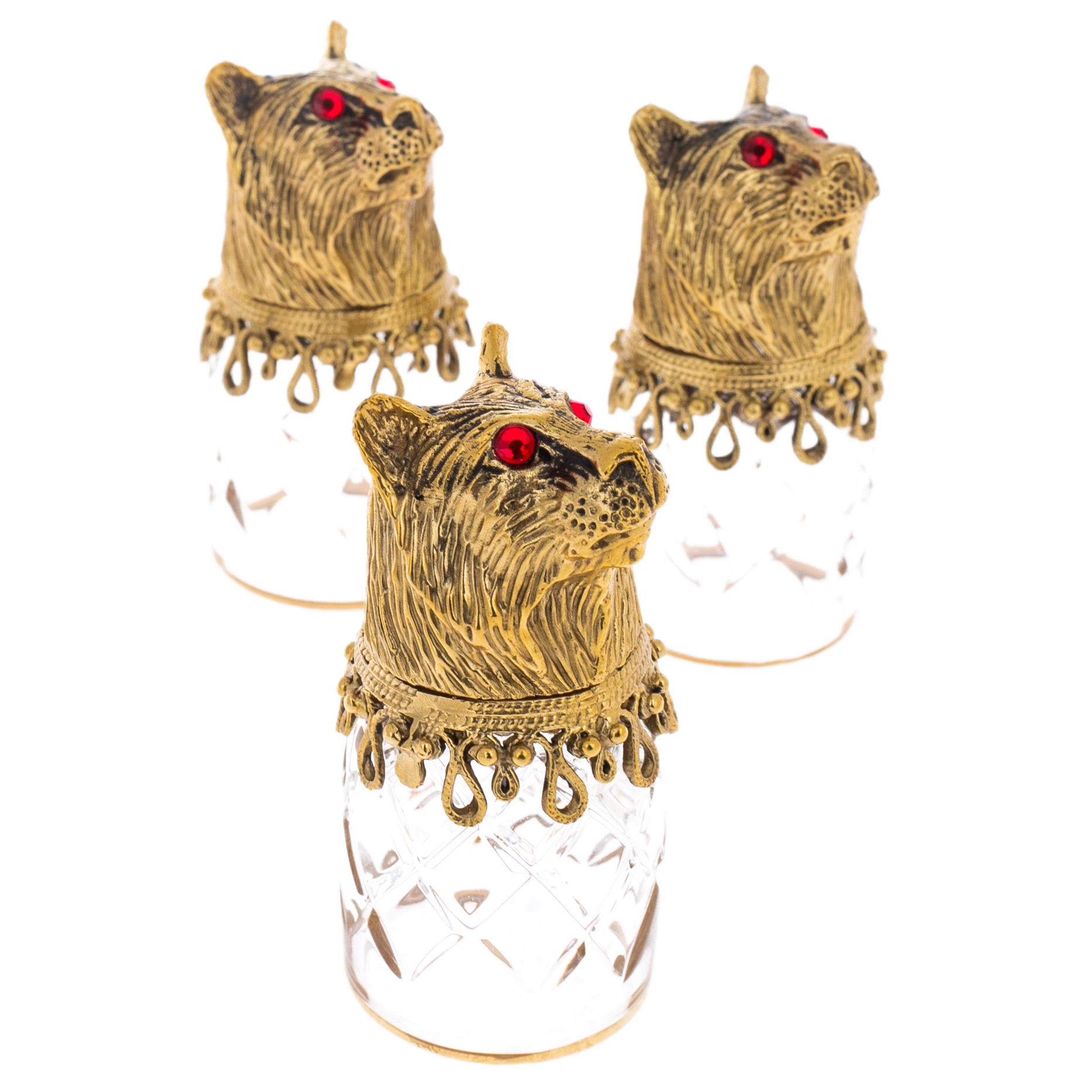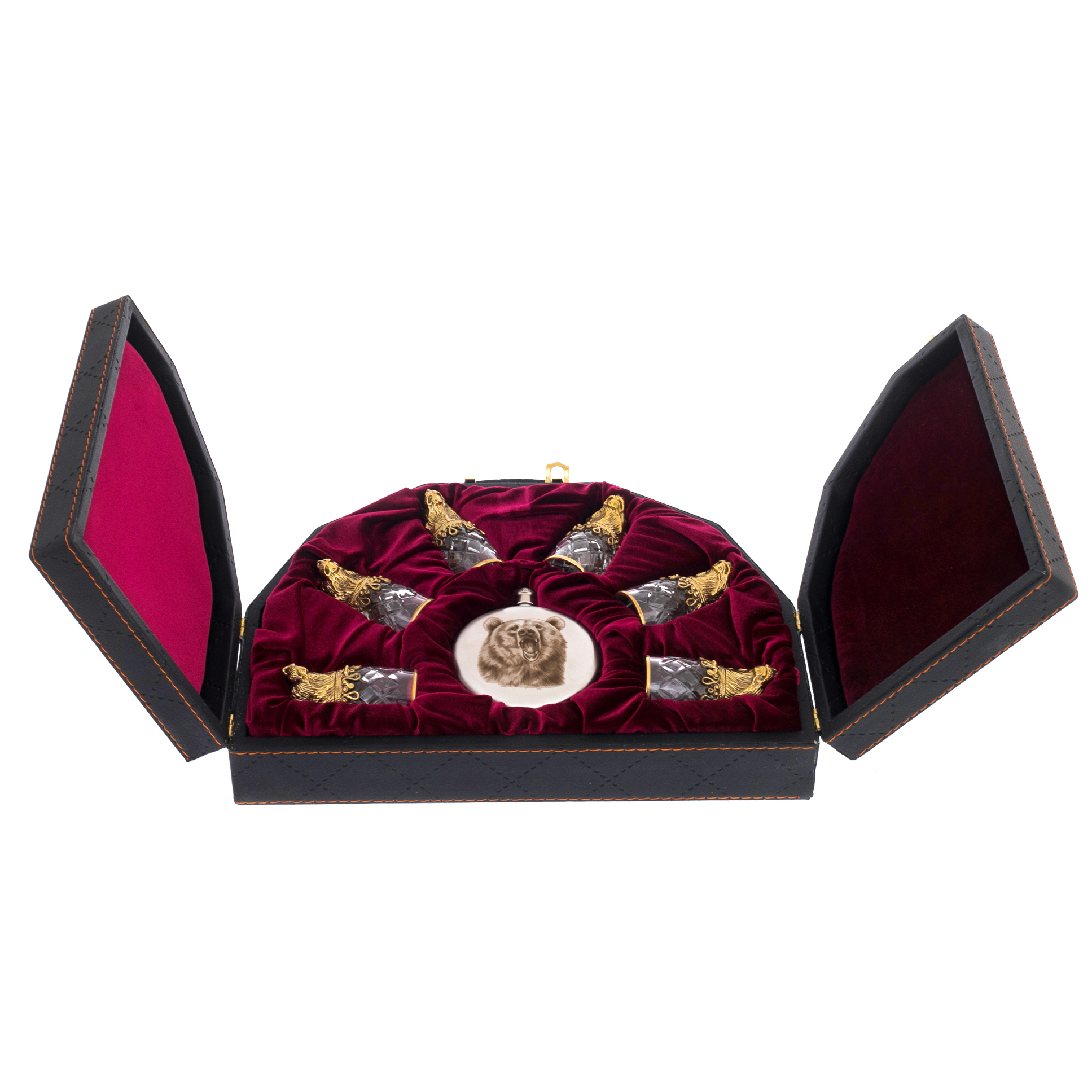 Шесть изысканных рюмок-перевертышей украшены скульптурными медвежьими головами из латуни с позолотой. Искусно проработанные детали, от текстуры меха до выразительности глаз, сверкающих яркими красными вставками, передают характер и мощь этого животного. Прозрачное стекло рюмок, украшенное глубоким резным узором, играет на свету, создавая ощущение мерцающего льда, который оживляет строгую золотую оправу.