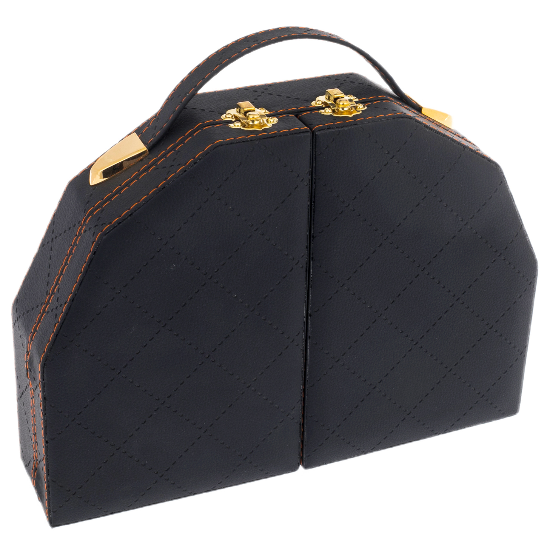 Всё это великолепие заключено в роскошный кейс, обтянутый черной кожей, внутреннее убранство которого поражает своей торжественностью. Бархат насыщенного бордового оттенка подчеркивает блеск золотых элементов, создавая ощущение королевской роскоши. Каждая рюмка и фляга аккуратно уложены в индивидуальные выемки, что добавляет комплекту не только практичности, но и эстетики.