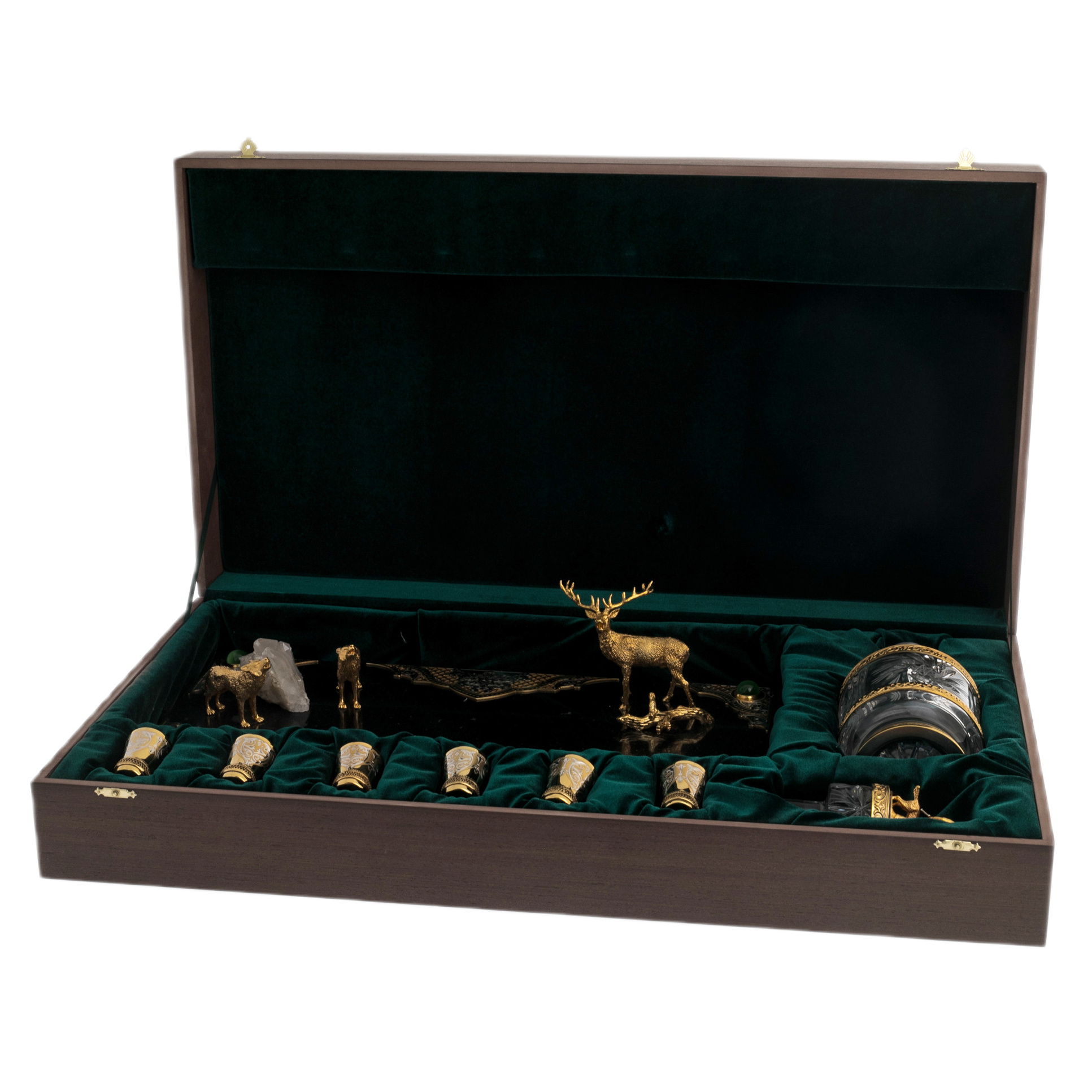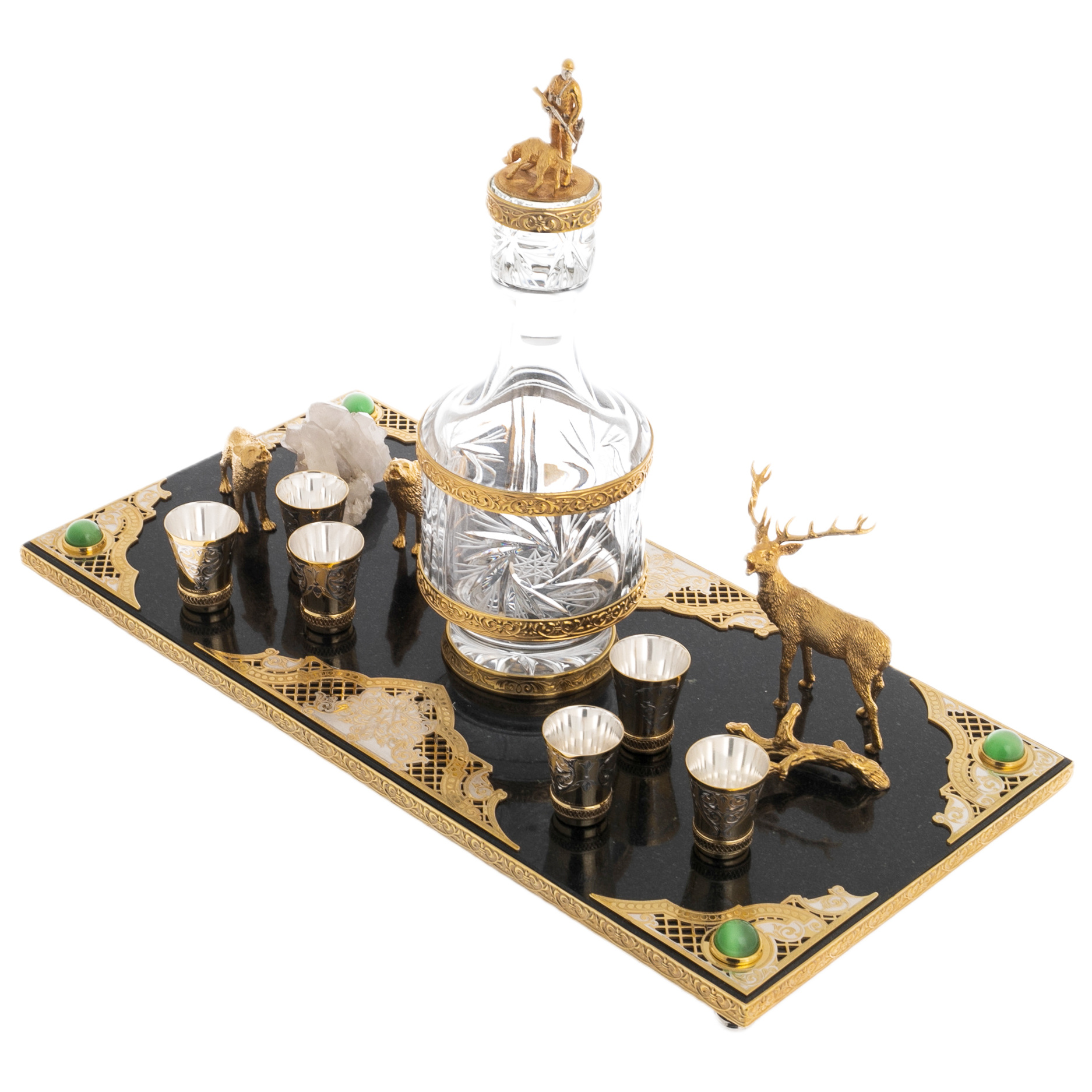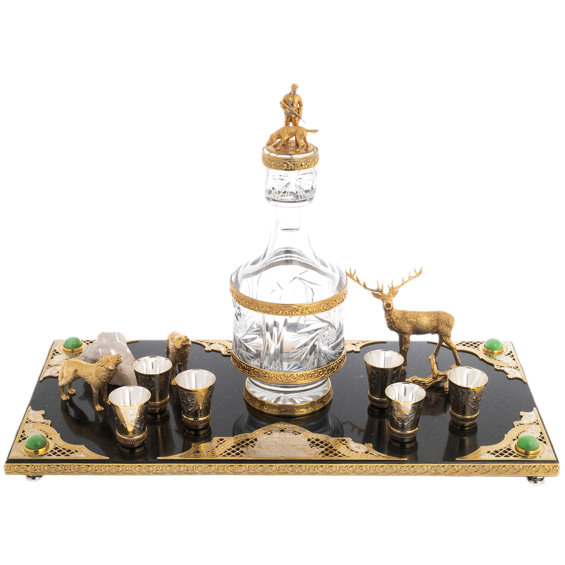 Олицетворение богатства природы, силы зверя и чести охотника, этот роскошный набор для водки «Охота на оленя» рассчитан на шесть персон и предназначен для тех, кто умеет наслаждаться моментом с безупречным вкусом. Композиция выстроена на элегантной черной подставке, инкрустированной резными латунными элементами и кабошонами из малахита. В центре внимания — хрустальный графин, украшенный золотистыми поясами ручной работы и венчаемый фигуркой охотника с собакой. Вокруг — шесть позолоченных рюмок с флоральным орнаментом и рельефными ножками, дополненные скульптурными миниатюрами: два воющих волка у ледяного кристалла, величественный олень с раскинутыми рогами и фантастической проработкой шерсти, ветвистый сучок, придающий пейзажу реалистичную фактуру.