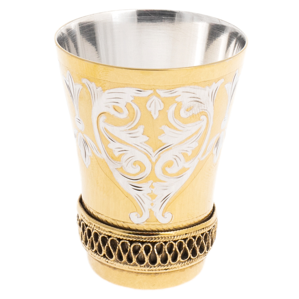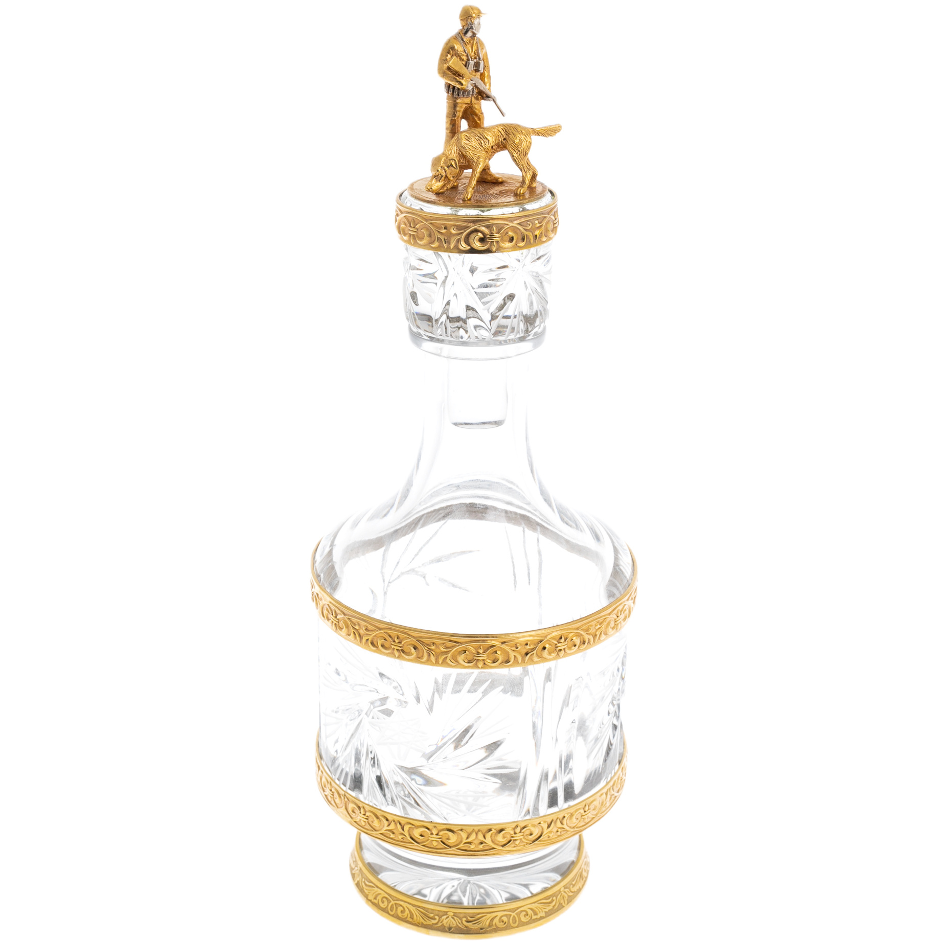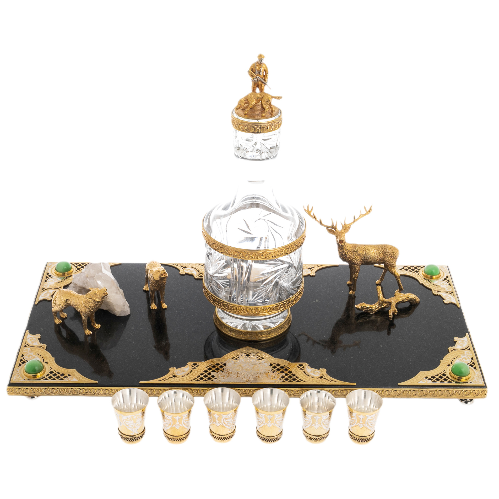 Олицетворение богатства природы, силы зверя и чести охотника, этот роскошный набор для водки «Охота на оленя» рассчитан на шесть персон и предназначен для тех, кто умеет наслаждаться моментом с безупречным вкусом. Композиция выстроена на элегантной черной подставке, инкрустированной резными латунными элементами и кабошонами из малахита. В центре внимания — хрустальный графин, украшенный золотистыми поясами ручной работы и венчаемый фигуркой охотника с собакой. Вокруг — шесть позолоченных рюмок с флоральным орнаментом и рельефными ножками, дополненные скульптурными миниатюрами: два воющих волка у ледяного кристалла, величественный олень с раскинутыми рогами и фантастической проработкой шерсти, ветвистый сучок, придающий пейзажу реалистичную фактуру.