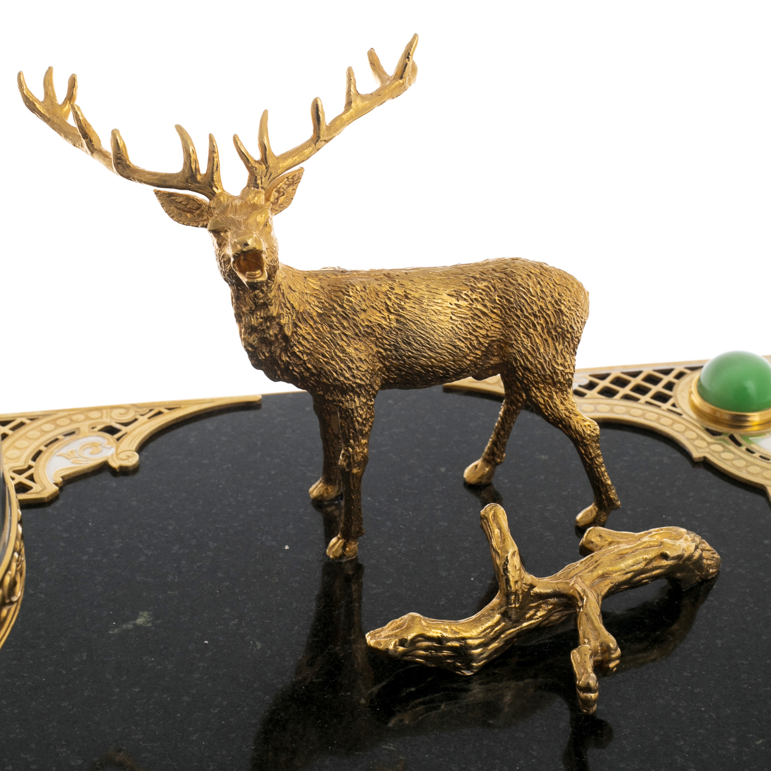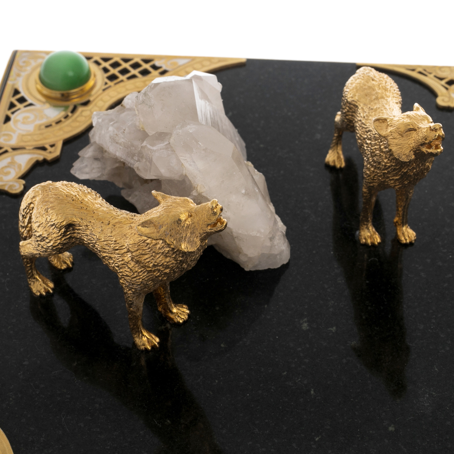 Каждый элемент декора был выполнен в традиционной златоустовской технике — древнем ремесле, объединившем гравировку по металлу, золочение, никелирование и ручную полировку. Металл проходит через несколько этапов обработки, включая чернение и нанесение травленого орнамента, благодаря чему на его поверхности рождается глубина и игра света. Все фигуры — от животных до охотника на пробке — отлиты вручную, отделаны с ювелирной точностью, отполированы до зеркального блеска и частично покрыты сусальным золотом. Малахитовые вставки в углах придают набору цветовую гармонию и отсылают к мотивам уральской природы.