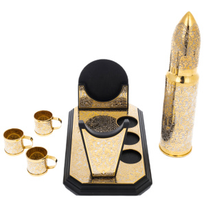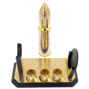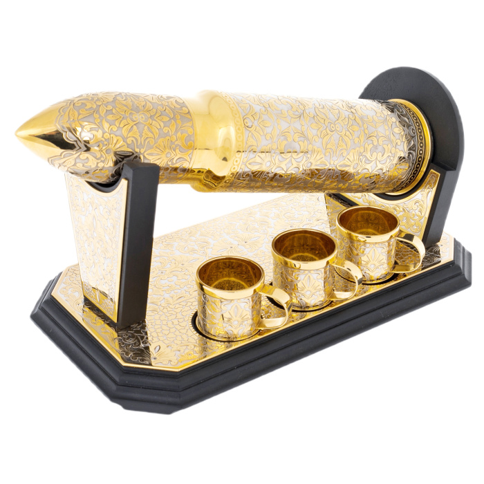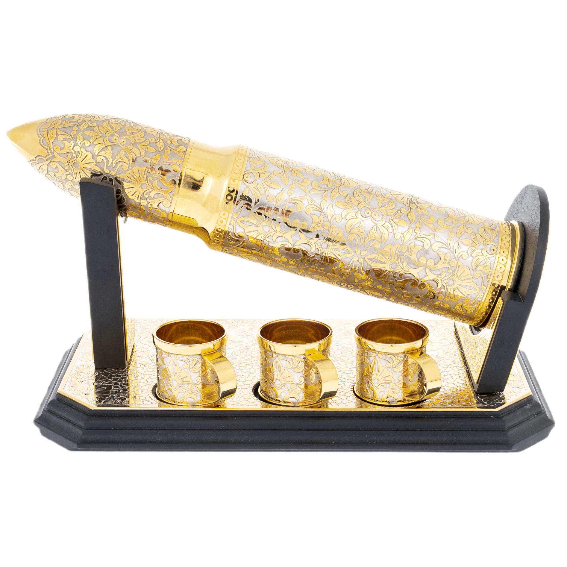 Набор для водки "Снаряд" на 3 персоны из Златоуста — предмет, в котором мощь мужского характера соединена с филигранной изысканностью исполнения. Композиция выстроена вокруг массивной фляги в форме артиллерийского снаряда, установленной на подставку из дерева и металла, дополненную тремя миниатюрными рюмками. Каждая деталь набора создана вручную и украшена классическим златоустовским орнаментом: сталь, золото и чернение сплетены в сложный растительный узор, выстроенный в идеальной симметрии. Подставка сочетает фактурную поверхность с полированными элементами, а черные акценты придают конструкции сдержанный, монументальный вид.