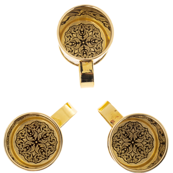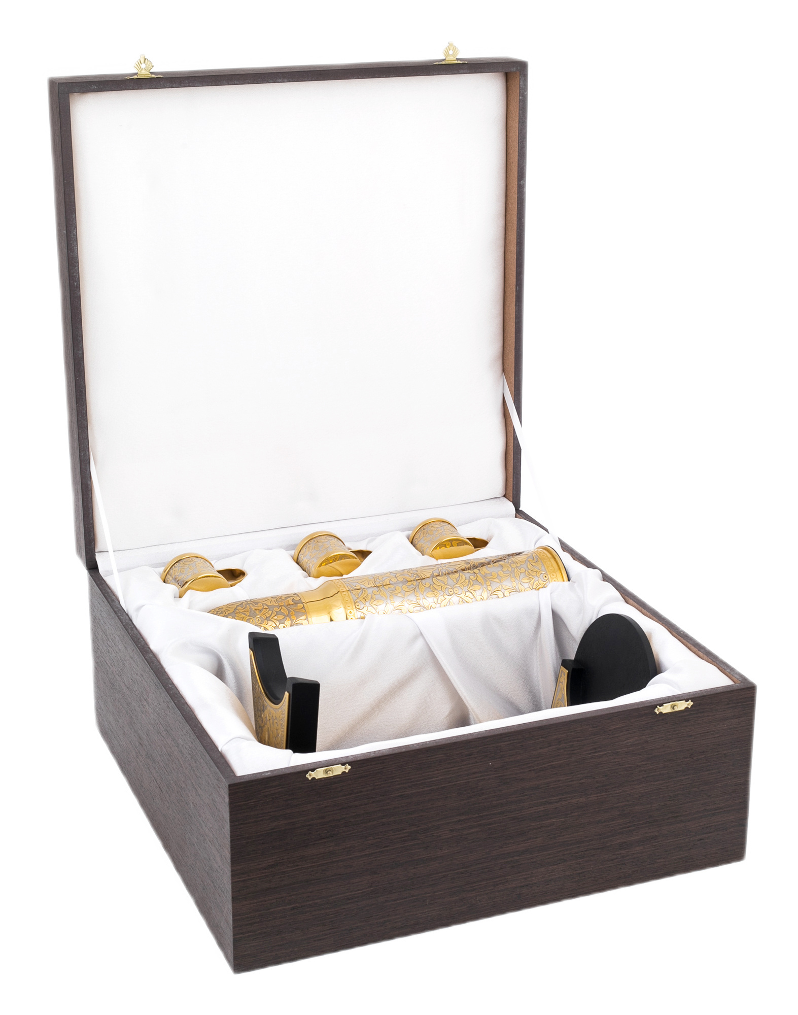 Техника исполнения основана на многовековых традициях Златоуста, где каждое изделие рождается в руках мастера, соединяющего холод металла и теплоту человеческого прикосновения. Гравировка нанесена вручную с использованием золочения и чернения, благодаря чему поверхность кажется живой — линии орнамента колышутся в свете, словно отблески пламени. Фляга и рюмки выполнены с ювелирной точностью: толщина металла, глубина реза, блеск позолоты рассчитаны так, чтобы создать ощущение артефакта, достойного не просто кабинета, но личной коллекции человека, умеющего ценить редкие вещи.