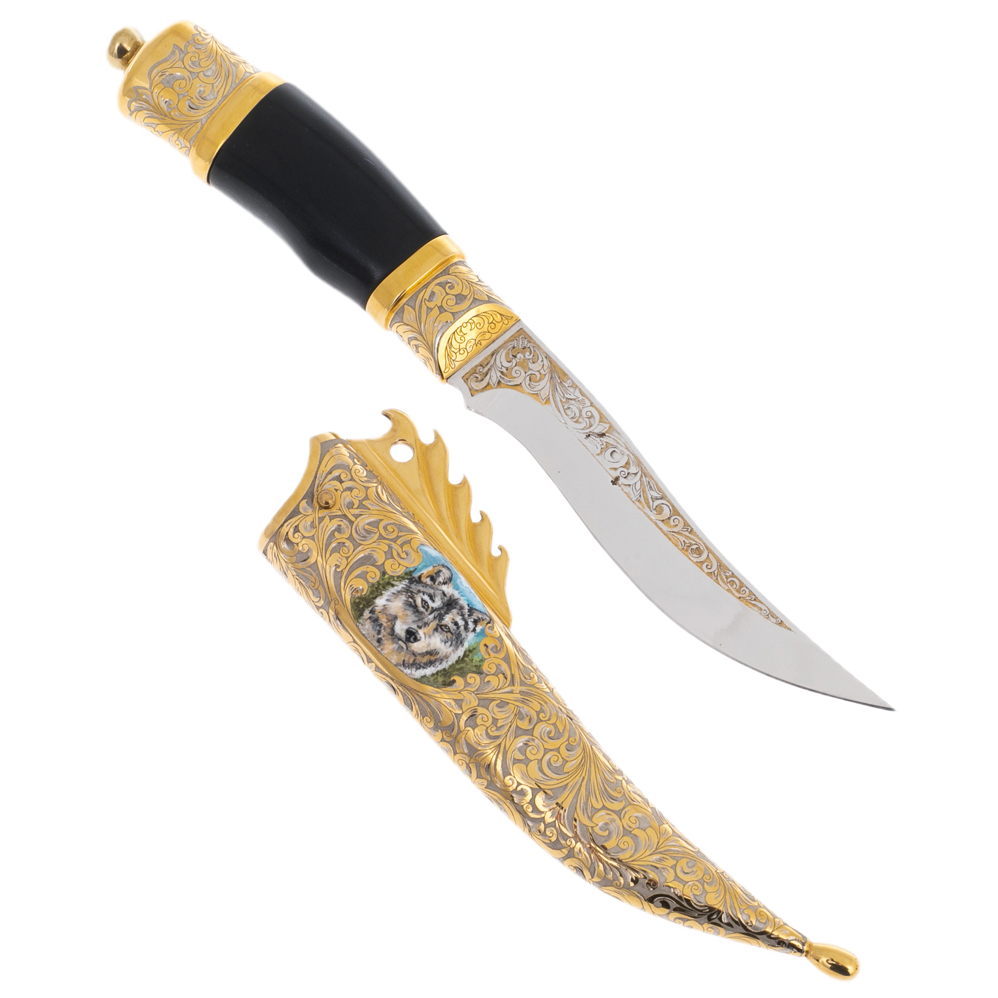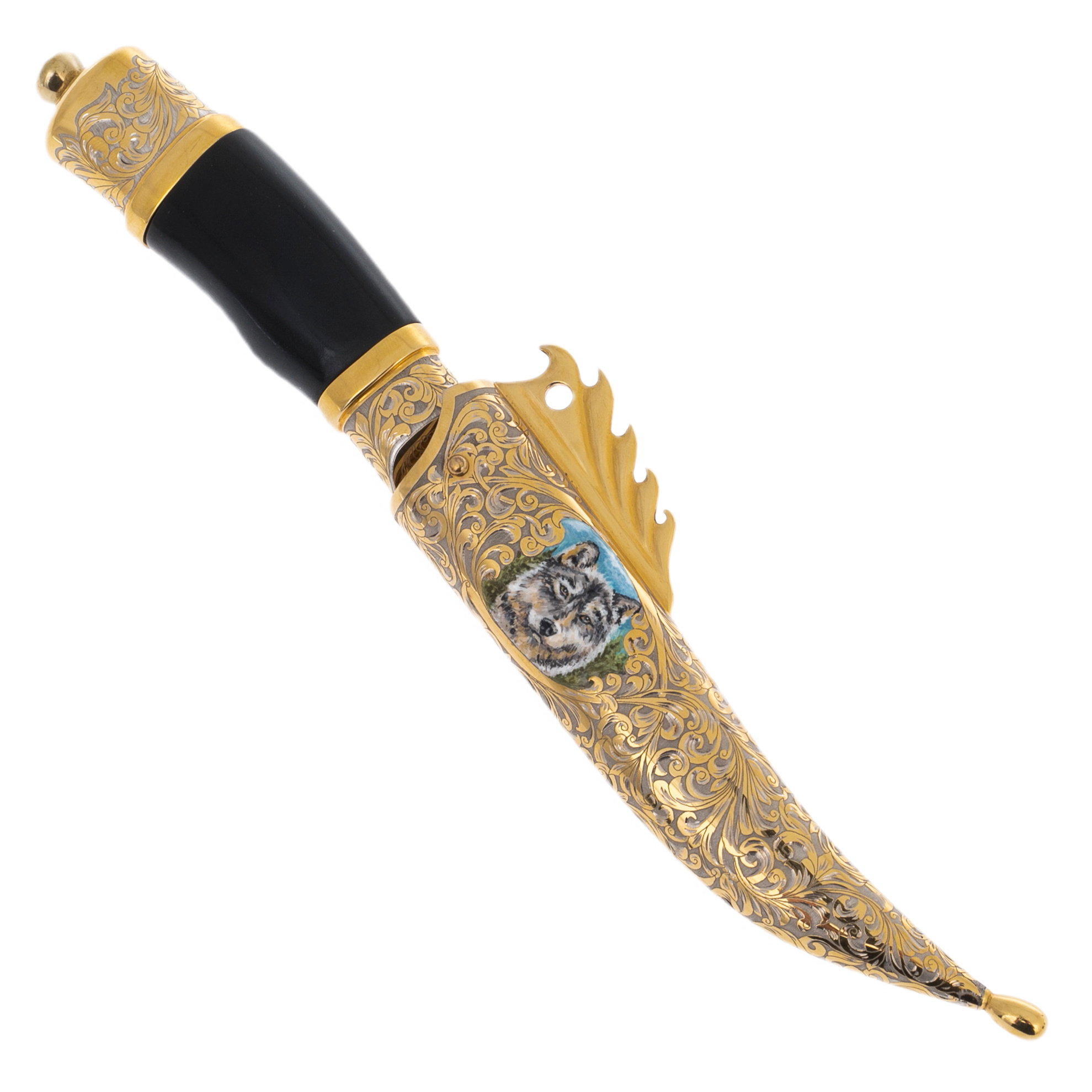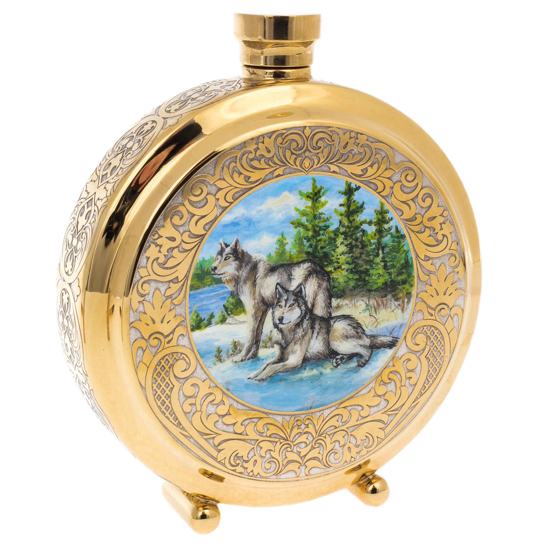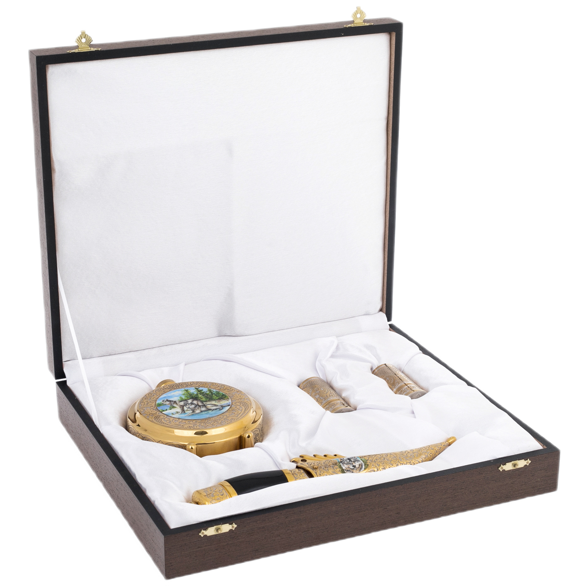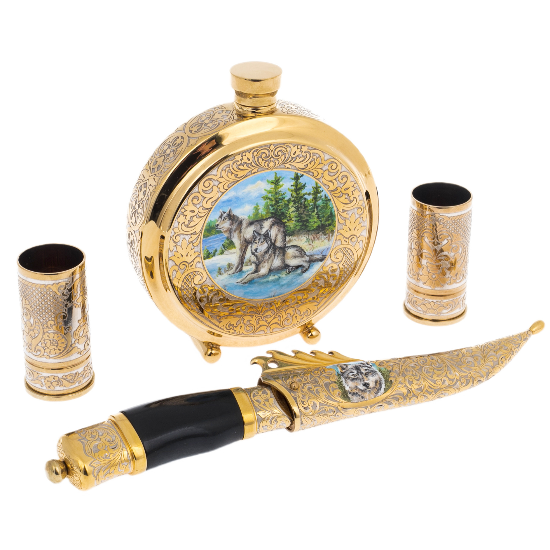 Набор «Охотника» на 2 персоны — редкий пример мужского подарка, в котором сила природы, традиции охоты и ювелирное мастерство слились в гармоничную композицию. В его состав входят плоская фляга, два стакана и декоративный нож в ножнах. Центральное место отдано живописной сцене: на фляге и ножнах — вручную нанесённая миниатюра с изображением волков у лесного ручья. Звери изображены в естественной среде, с тонкой передачей характера и пластики движений. Каждый предмет набора отделан латунью с гальваническим покрытием и украшен филигранной гравировкой с позолотой.