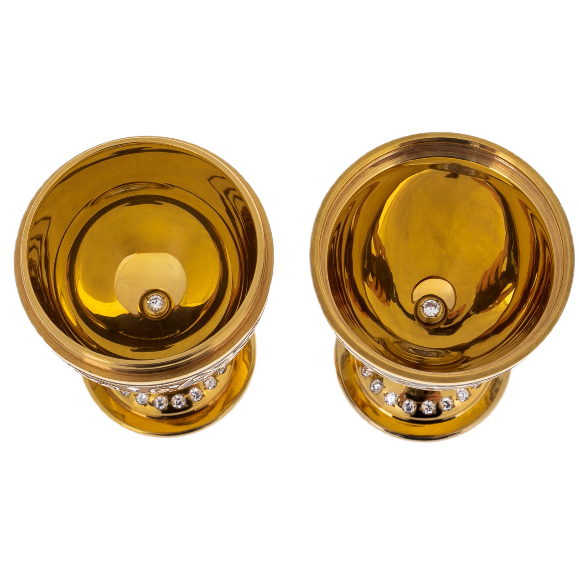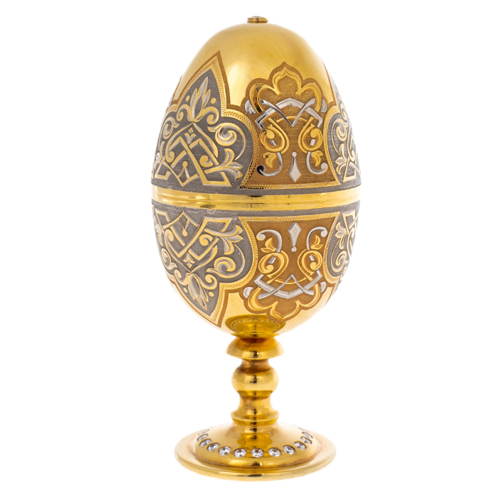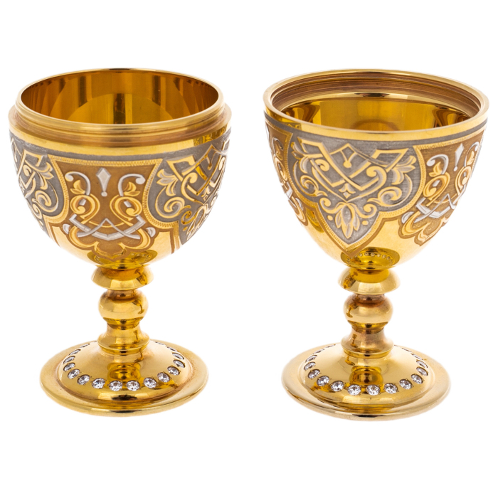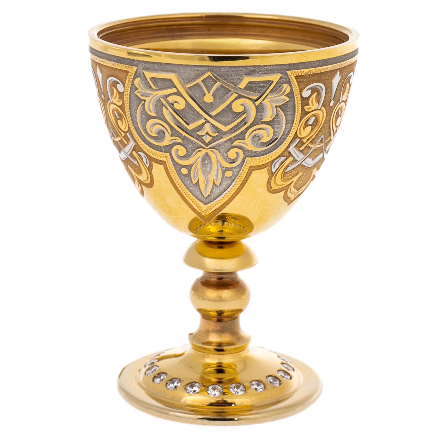 Конструкция яйца плавно раскрывается, превращаясь в два питейных кубка, каждый из которых сохраняет единую декоративную концепцию: плотное золотое покрытие, тончайшие травления, ручную подрезку и сияние фианитов по окружности основания. Камни, подобранные по размеру и чистоте, мягко светятся на золоте, подчеркивая роскошь предмета и его декоративную ценность. Форма ножки с аккуратным изгибом, плавной линией и аккуратной посадкой делает бокалы не только предметом демонстрации, но и удобным аксессуаром для применения.
