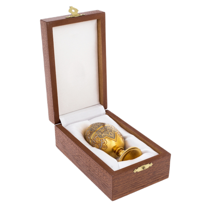 Набор «Яйцо» создан как изысканный питейный аксессуар, объединяющий эстетику старинных императорских реликвий и филигранную златоустовскую технику. Перед вами цельная композиция из двух бокалов, скрытых внутри элегантного яйца на ножке. Корпус, полностью покрытый плотным слоем золочения, украшен сложнейшей гравировкой с растительными и геометрическими мотивами, выполненной с высокой точностью и глубокой проработкой. Орнамент, построенный на сочетании теплых золотых оттенков и холодного благородного серебра, формирует ощущение музейного искусства, созданного для узкого круга ценителей.