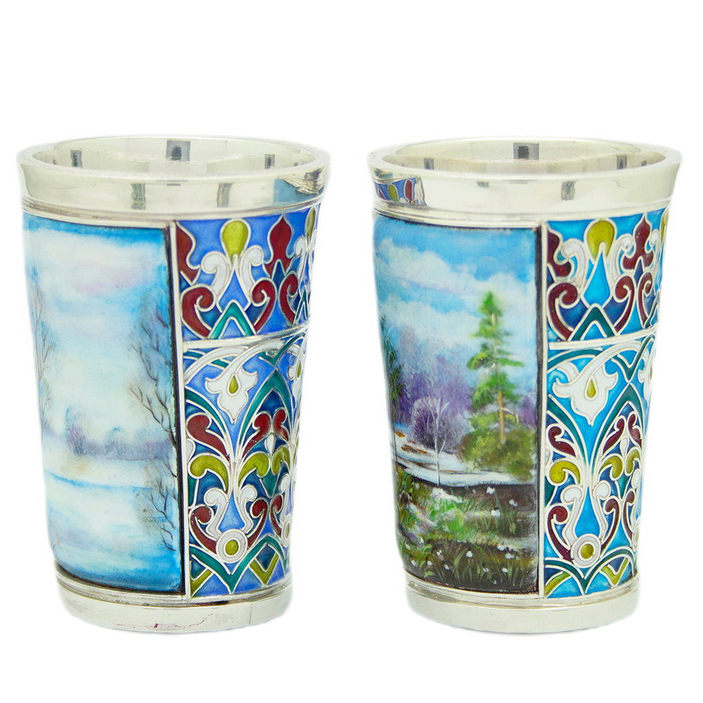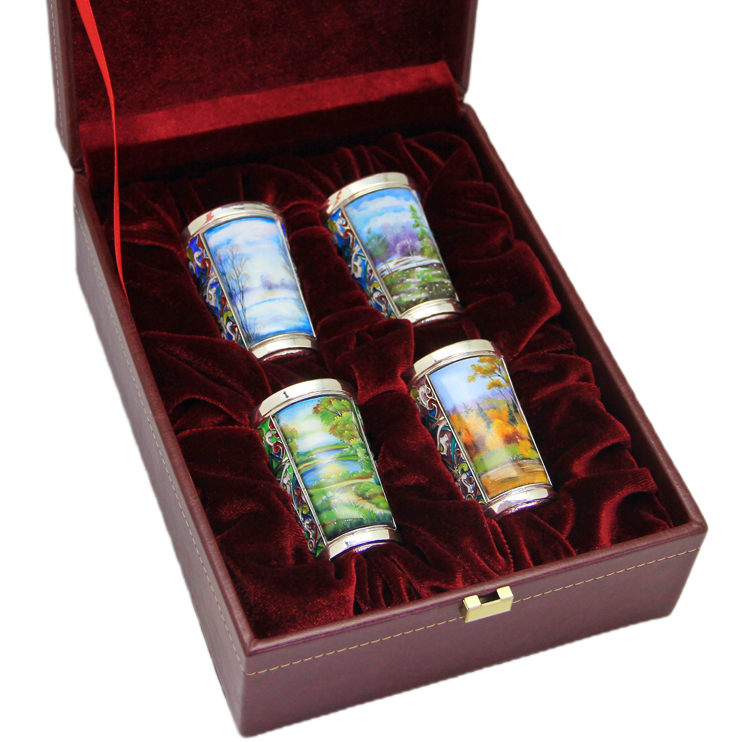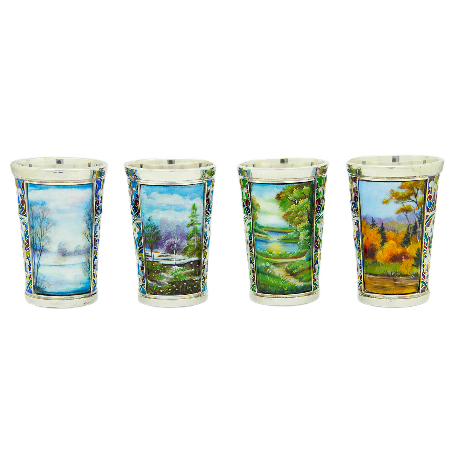 Набор стопок из серебра "Времена года" на 4 персоны, финифть