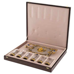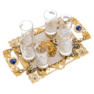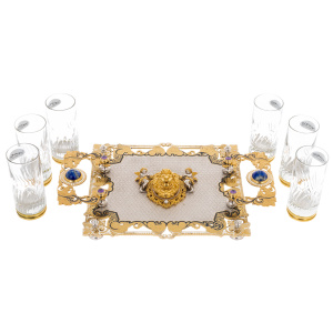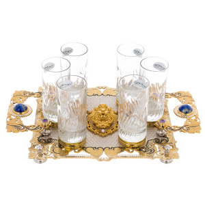 Набор "Лев" на 6 персон — представительский комплект для сервировки напитков, созданный как самостоятельный кабинетный акцент. В композицию входят шесть высоких стеклянных стаканов с рельефной фактурой, а также массивная подносная платформа с фигурными ручками и устойчивыми опорами, задающими предмету монументальную посадку на столе. Центральная часть подноса выделена рельефной маскаронной композицией льва, поддержанной строгой симметрией орнамента и драгоценными акцентами. Такой набор адресован тем, кому важны не бытовые детали, а уровень подачи, уместный на переговорах, в закрытом клубе, в кабинете руководителя, а также в качестве статусного подарка партнёру.