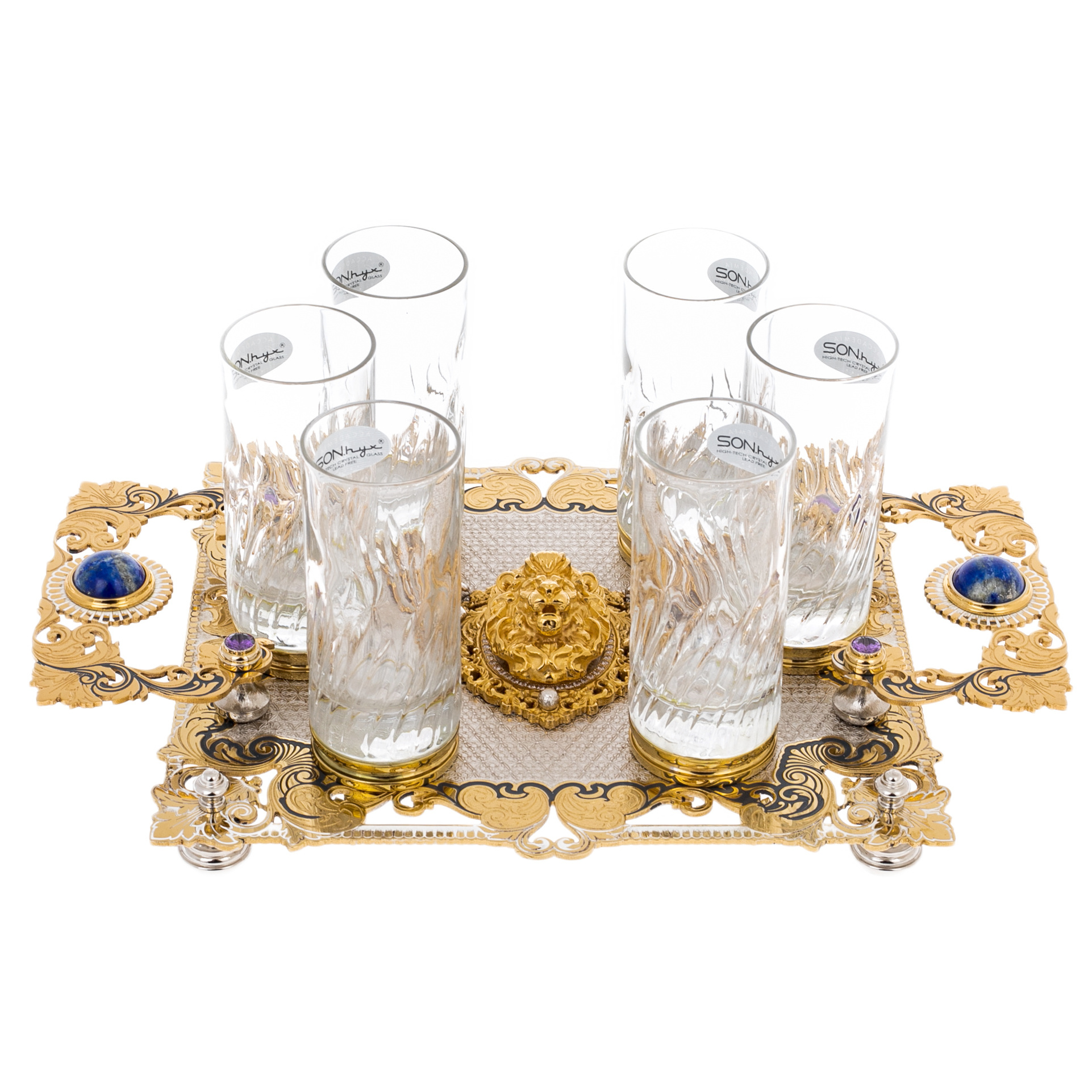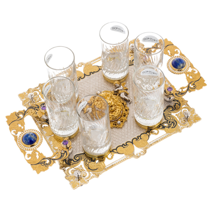 Символика "Льва" считывается без пояснений: уверенность, власть, охранительный знак, подчёркивающий характер владельца. Глубокая синева камня, оттенённая тёплым золотом, добавляет образу аристократическую холодность, а фиолетовые акценты дают редкую, почти церемониальную ноту. При боковом свете гравировка оживает, позолота играет мягкими отблесками, стекло отвечает прозрачной фактурой, создавая на столе ощущение тщательно продуманной сцены. Этот набор является не просто предметом сервировки — перед вами вещь, обозначающая уровень дома и привычку окружать себя деталями, говорящими о статусе спокойно и убедительно.