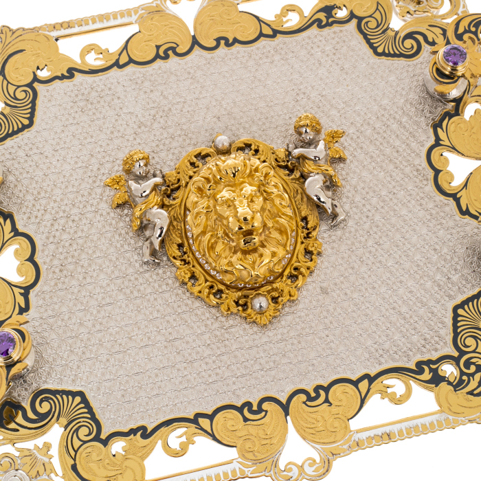 Златоустовская школа проявлена здесь в характерной пластике металла и в тонкой графике рисунка: орнамент построен на ручной гравировке, подчёркнутой контрастом позолоченных участков и затемнённых линий, усиливающих глубину узора. Поверхности доведены до благородного блеска с аккуратным переходом к матовым зонам, благодаря чему декор читается многослойно, не перегружая композицию. Каменные вставки закреплены ювелирно: крупные синие акценты на ручках и более деликатные фиолетовые огни в деталях создают ощущение дорогой арматуры, собранной вокруг функционального центра — подноса и стекла.