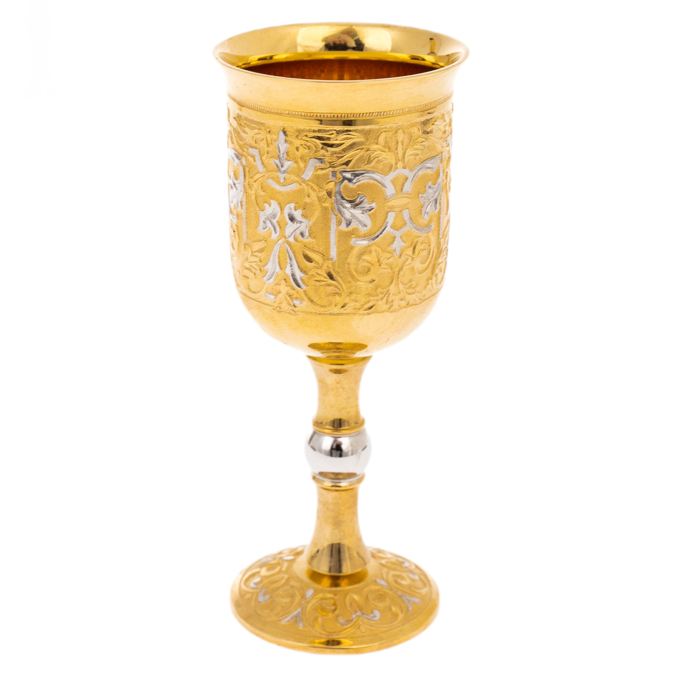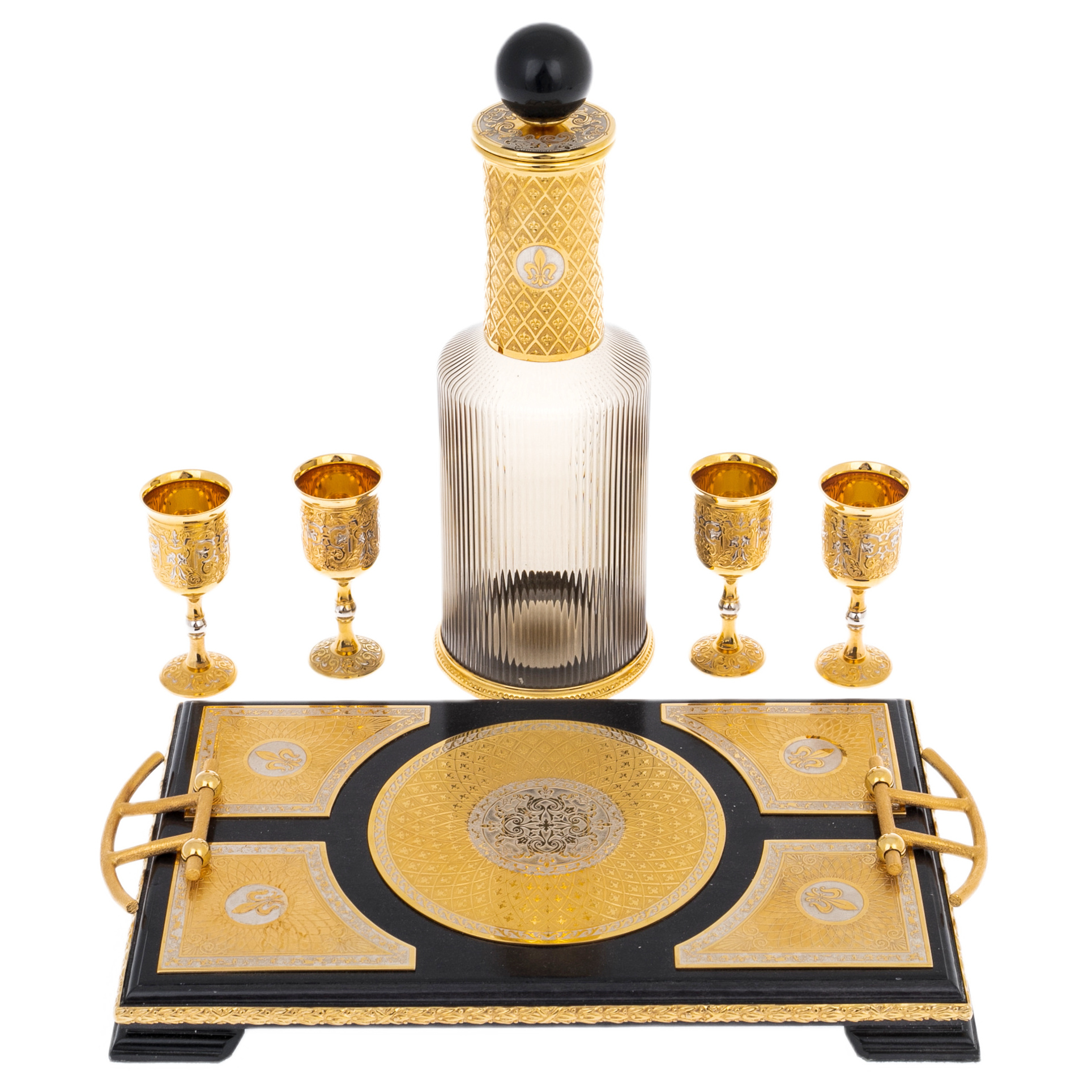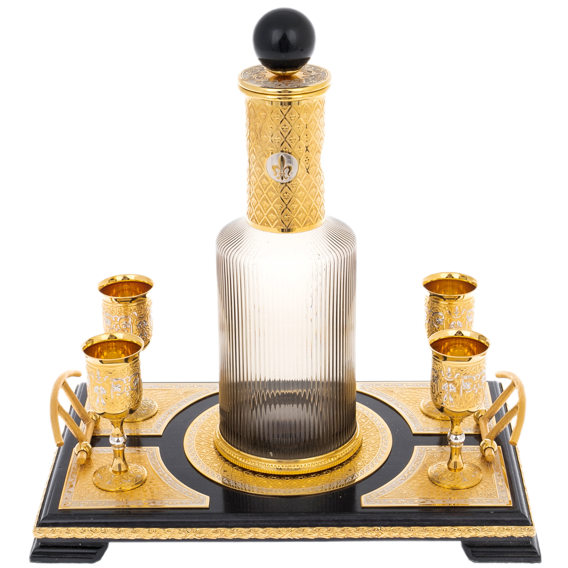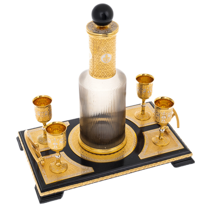 Четыре бокала помещены на индивидуальные подставки, вписанные в архитектуру общей композиции. Их строгие вытянутые пропорции уравновешены богатой декоративной обработкой: тонкие узоры, выполненные в золотой и серебряной гамме, создают мерцающий рельеф, перекликающийся с орнаментами графина. Внутренние поверхности бокалов покрыты золотом, усиливающим сияние напитка и превращающим каждое наполнение в маленькую церемонию. Основание набора представляет собой тяжёлую лакированную платформу глубокого чёрного цвета, где золотая инкрустация образует гармоничную геометрию линий и плавных изгибов — словно напоминая о придворных залах французской монархии.