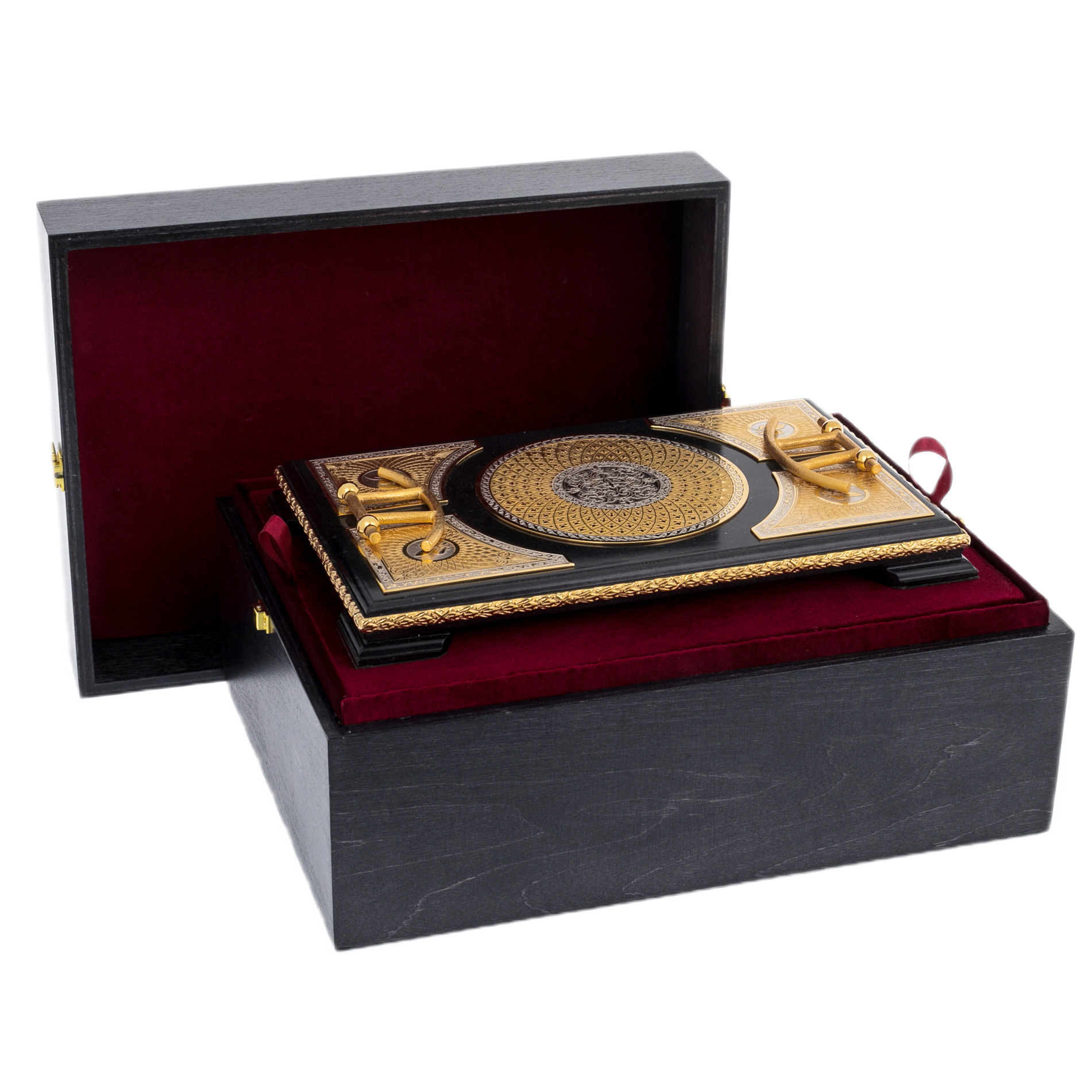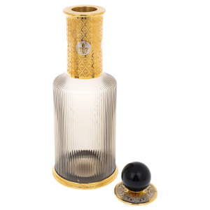 Водочный набор «Людовик» создаёт впечатление королевского ритуала, в котором каждая деталь подчёркивает редкое чувство меры и приверженность безупречному стилю. Центральное место занимает тяжёлая стеклянная графинная форма с глубокими вертикальными гранями, переходящими от кристальной прозрачности к дымчатому тону. Контраст усиливается массивной пробкой, увенчанной идеально отполированным чёрным шаром, создающим ощущение законченности и силы. Воротник графина, украшенный сложной алмазной гравировкой и золотыми орнаментами, формирует парадный облик предмета, в котором мастерство златоустовских оружейников чувствуется в каждом миллиметре.
