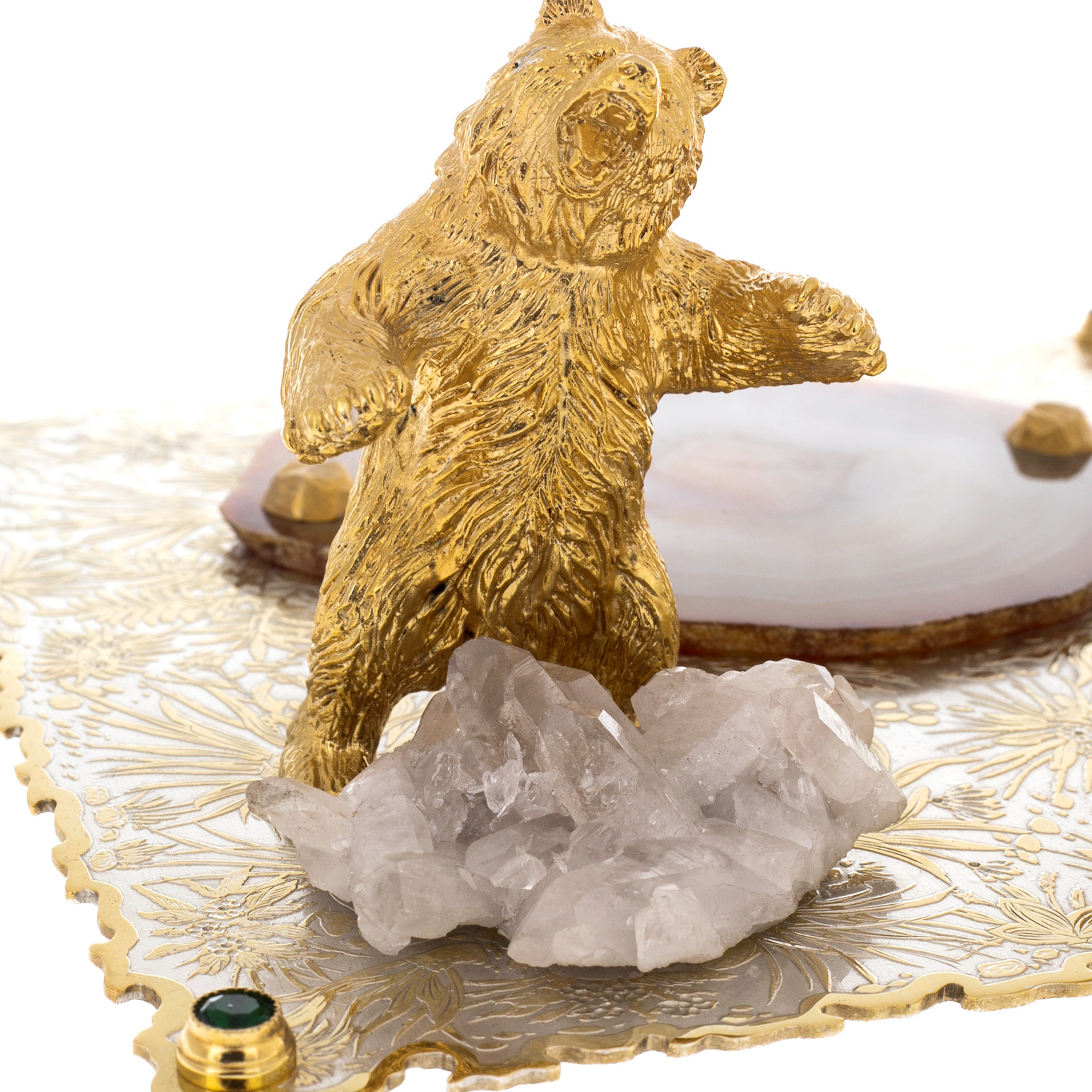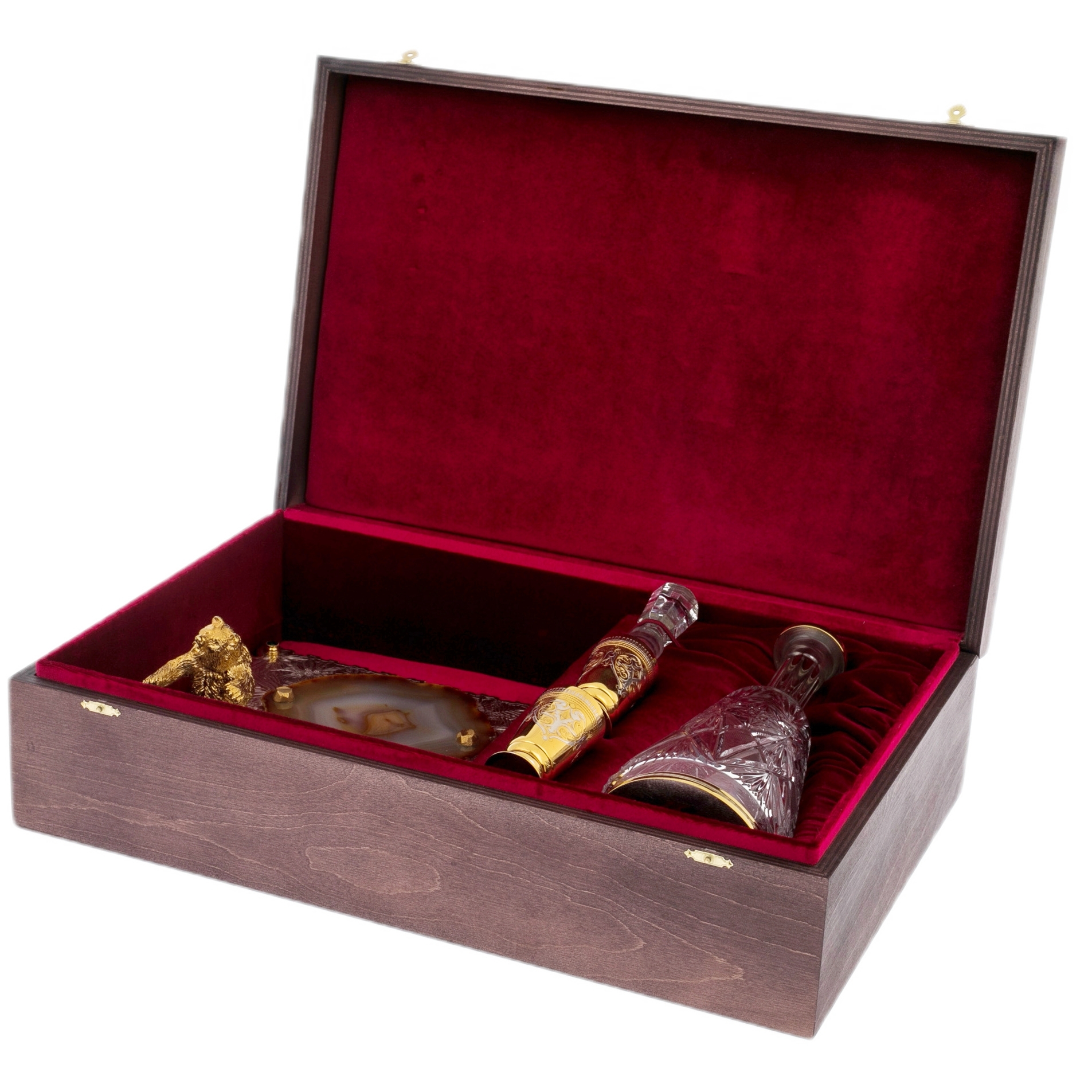Главным элементом набора является подставка из прочного камня с фигурами животных. Она обладает изысканным дизайном и прекрасно дополняет всю композицию. На подставке расположен великолепный штоф и стопки, которые придают набору изысканности и роскоши.
