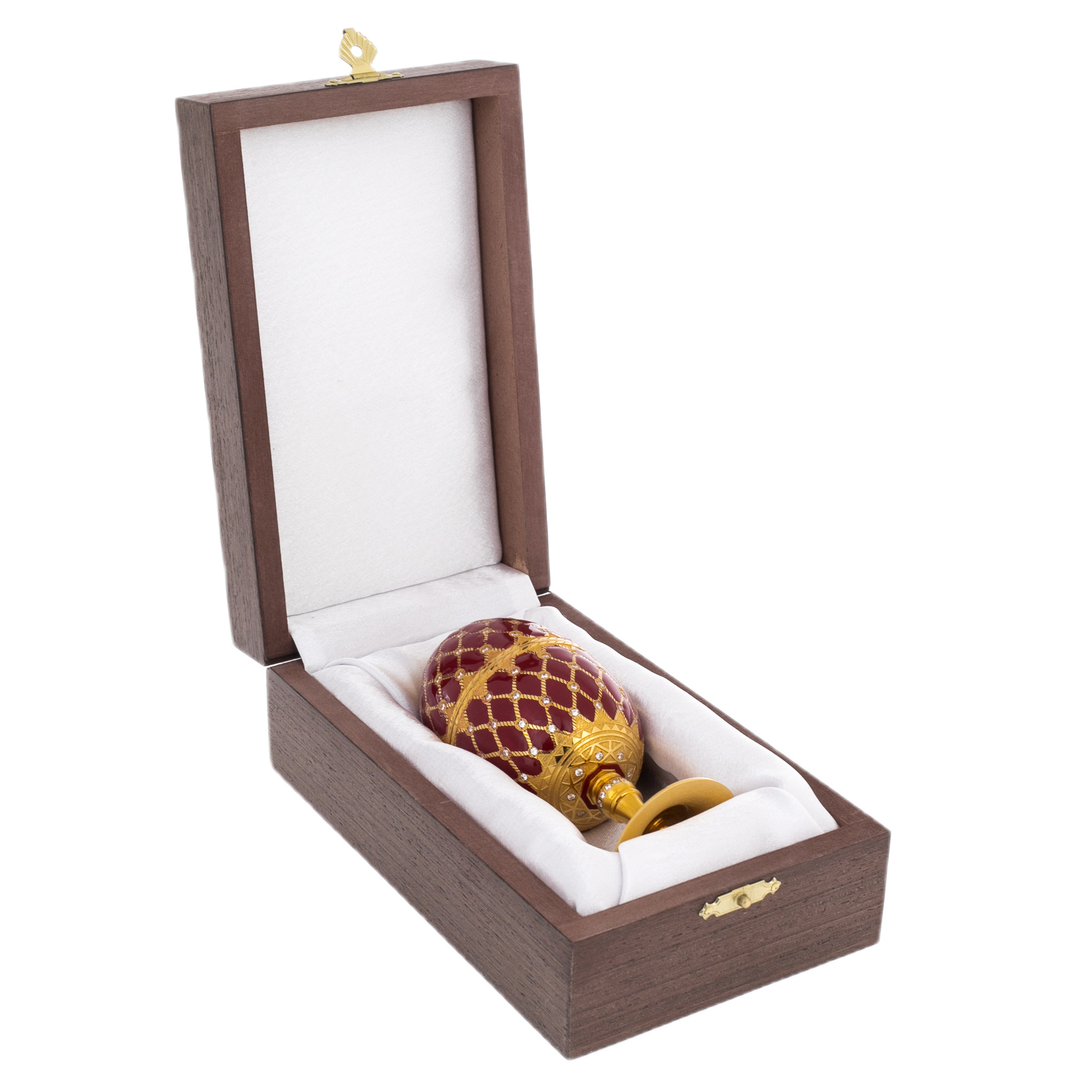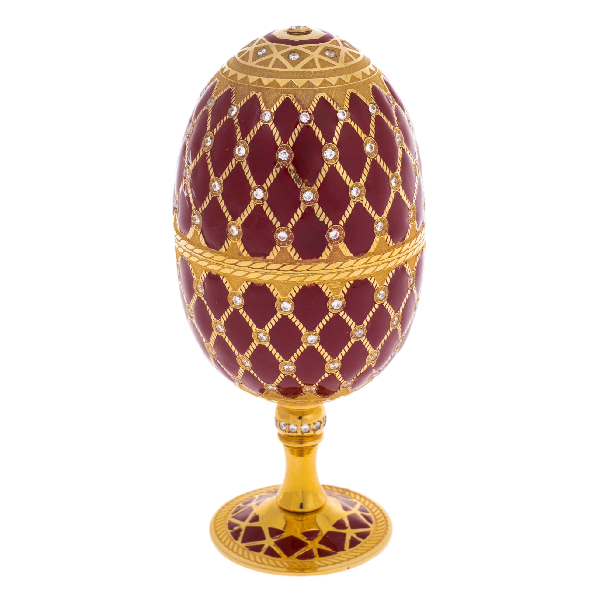 Главный акцент набора – благородное яйцо, возвышающееся на элегантной ножке. Глубокий бордовый цвет эмали, будто напоённый лучами закатного солнца, гармонично сочетается с золотом, которое не просто украшает, но и подчёркивает величие композиции. Сетка из тончайших нитей, усыпанная сверкающими кристаллами, создаёт эффект звёздного неба, запечатлённого в драгоценном материале.
