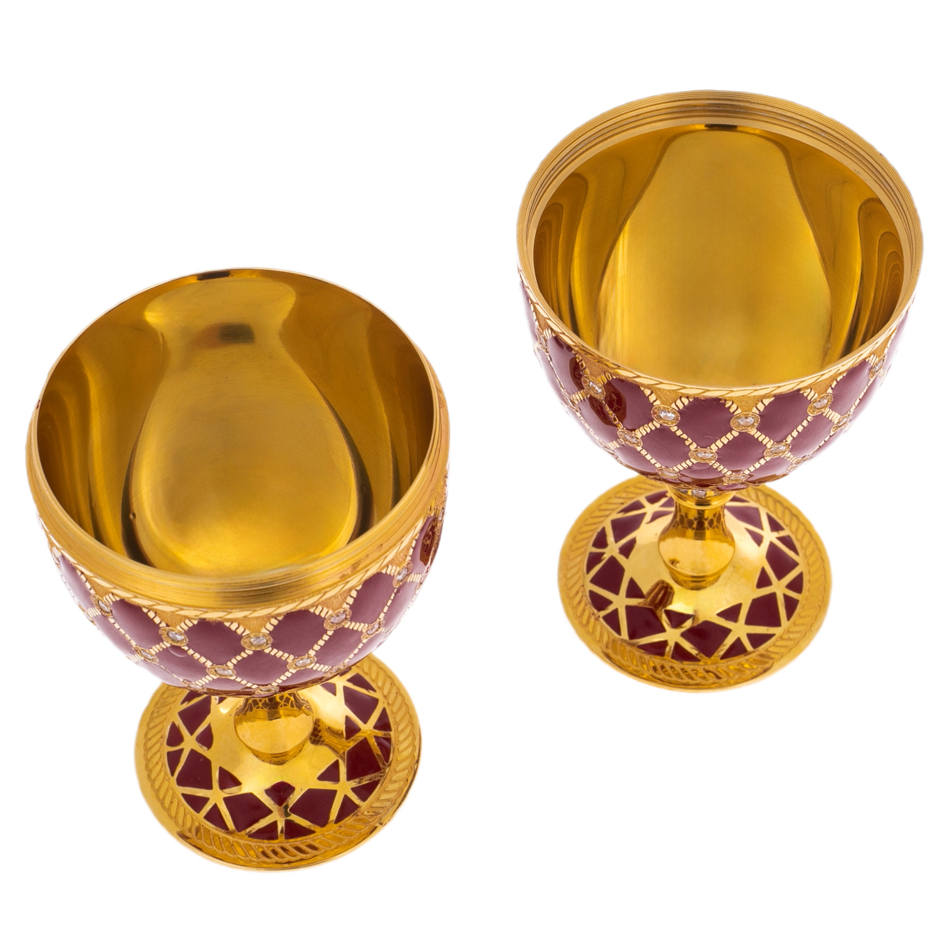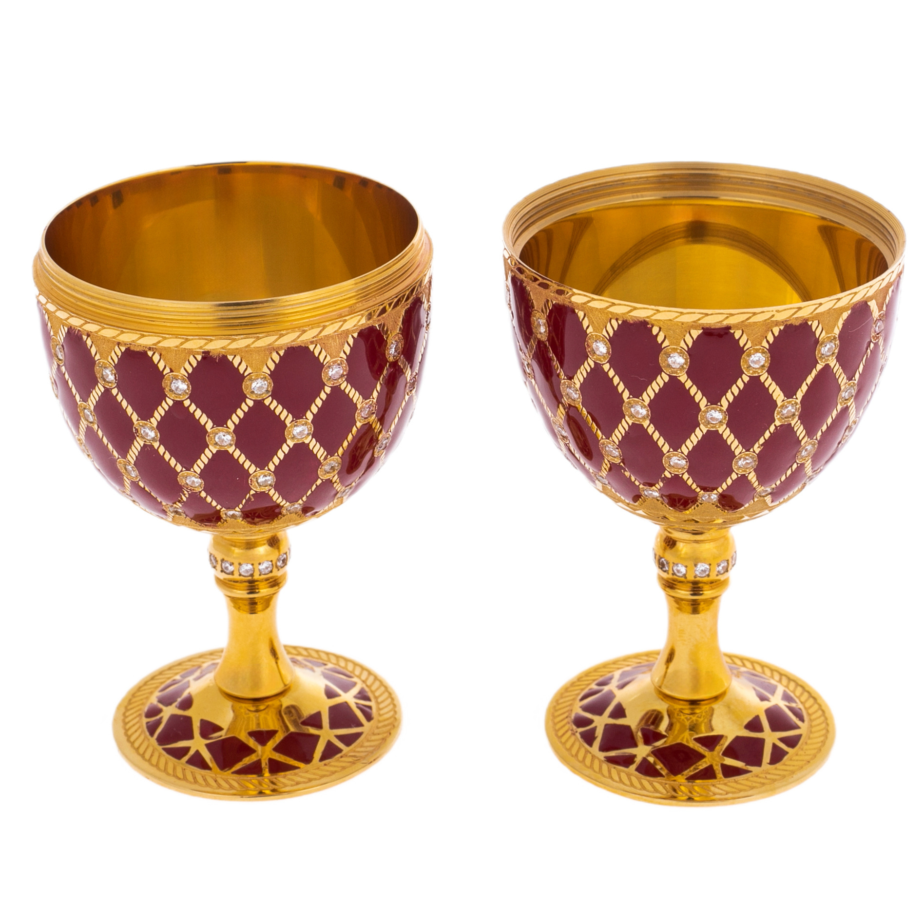 А в разобранном виде это два бокала, идеально повторяющие форму яйца. Их золотые чаши отражают каждый проблеск света, добавляя моменту использования ещё больше величия. Визуальная симметрия и изящество каждой детали настраивают на ритуал, способный возвысить любое событие, будь то тост в узком кругу или особый момент личного праздника.