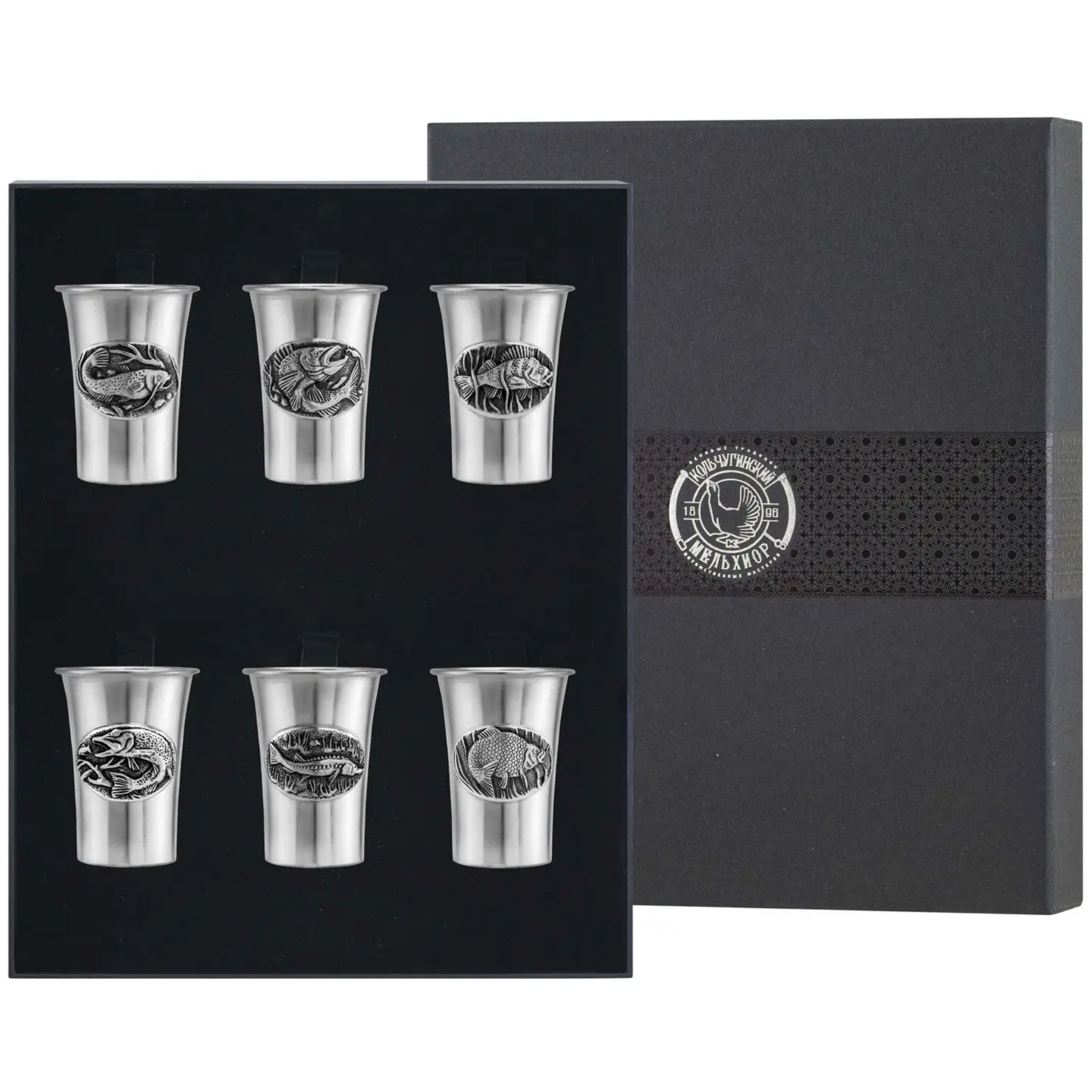 Посеребренный набор стопок "Рыбацкие" полированный, с чернением, на 6 персон