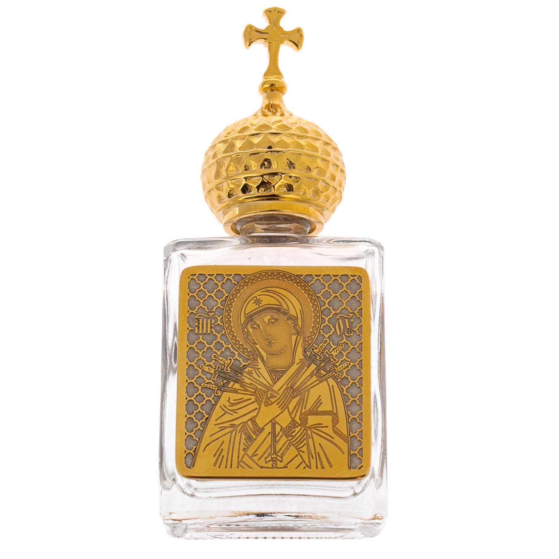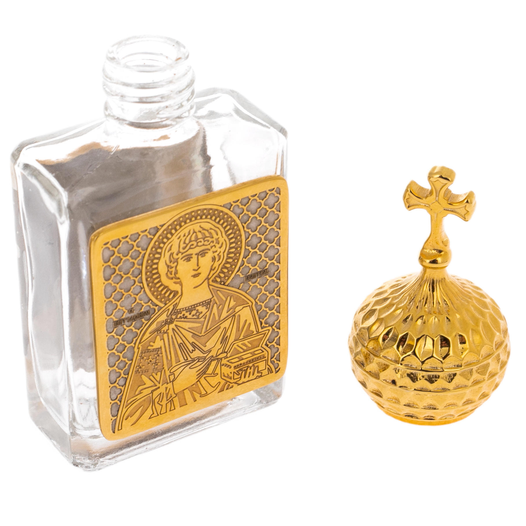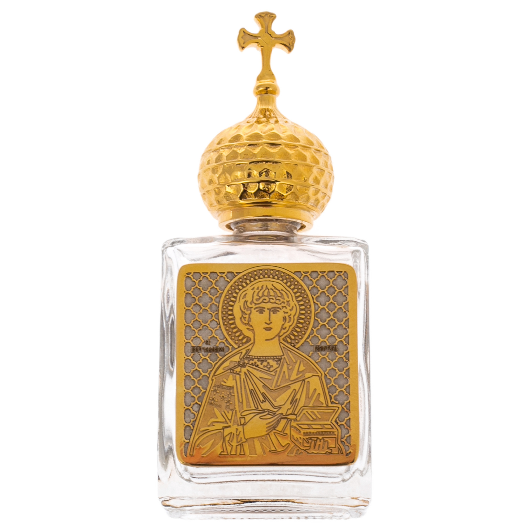 Прозрачное стекло сияет, словно сама вода отразила небесный свет, а изящная позолоченная крышка венчается куполом с крестом, подобным храмовому шпилю, который связывает землю с небесами. Рельефное изображение святых ликов, выполненное с филигранной точностью, наделяет сосуд величественной глубиной. Здесь каждый элемент говорит о вечных ценностях, передаваемых из поколения в поколение.