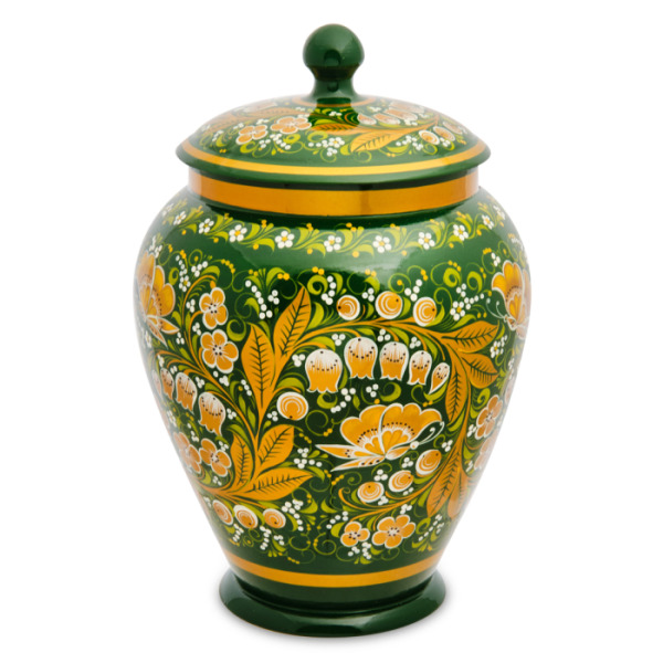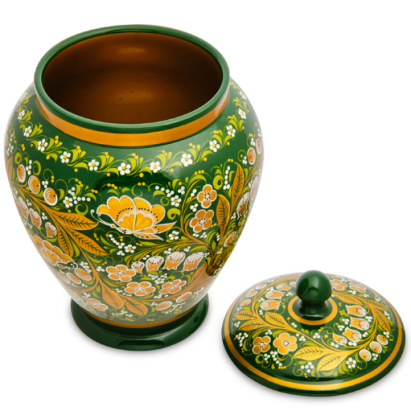Баночка имеет высоту 25 сантиметров (а стало быть, в нее можно засыпать не менее полутора килограмм пшена или риса). В оформлении преобладает красный цвет, присутствуют золотистые и зеленые оттенки. Если по какой-то причине поставок не подходит расцветкой, у нас есть аналог с альтернативной раскраской: идентичный по размеру поставок, украшенный росписью в зеленых тонах.