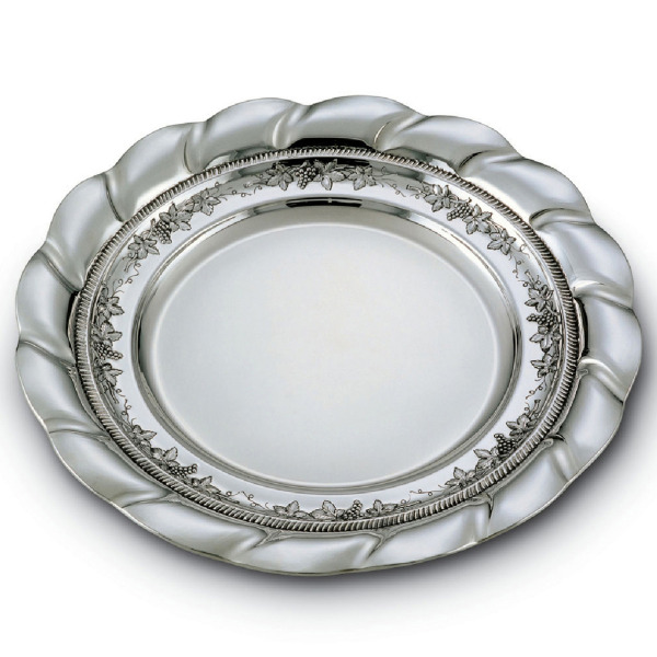Изготовленное из серебра, это блюдо пленяет безупречным сиянием и гармоничностью линий. Гравированные виноградные лозы, словно застывшие в металле символы изобилия и благополучия, обрамляют центральную часть, создавая эффект утонченной рамы для кулинарных шедевров. Мягкие волны рельефного края придают изделию объемность, напоминая драпировки королевских мантий.