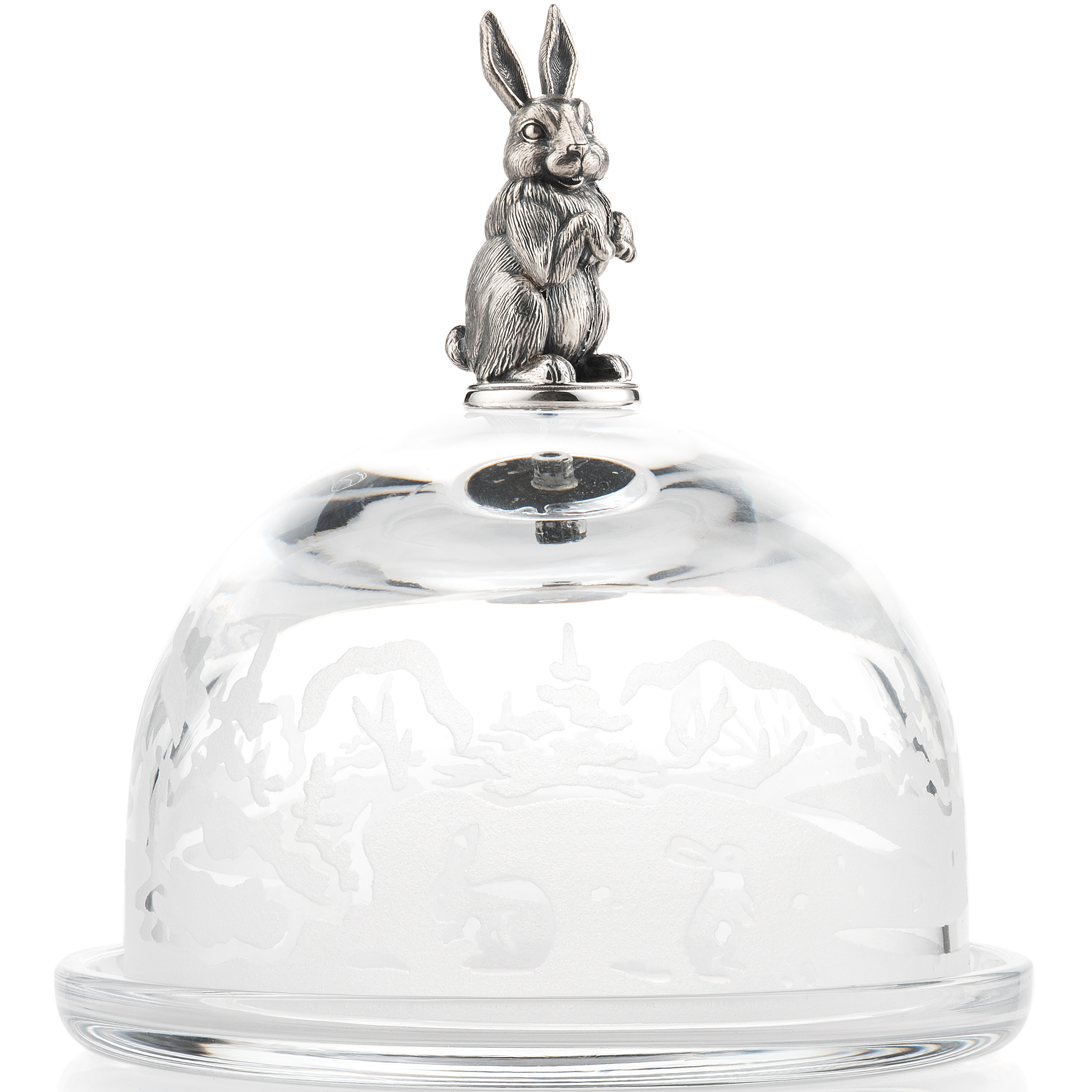 Хрустальная лимонница для подачи чая или коньяка увенчана фигуркой сказочного персонажа — Зайца — побегайца. Стекло разгравировано в стилистике русского леса.
