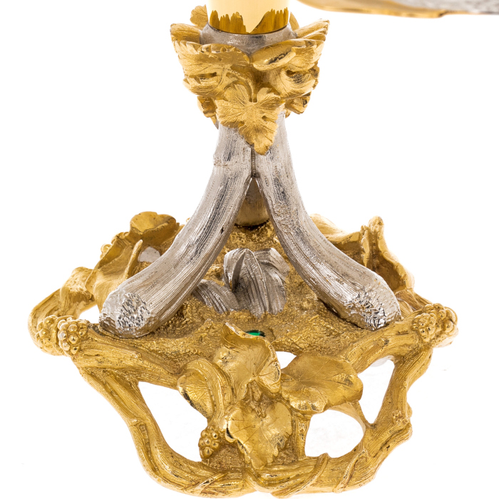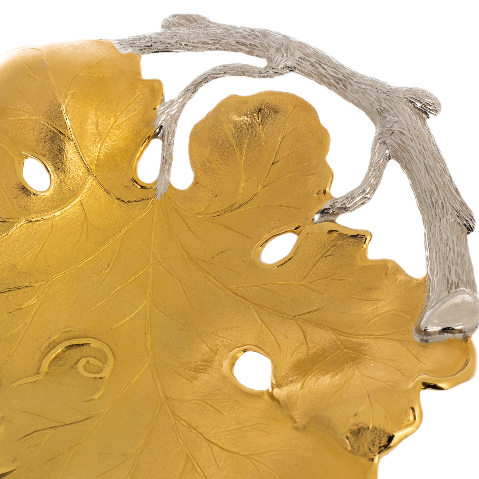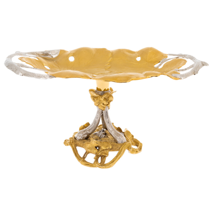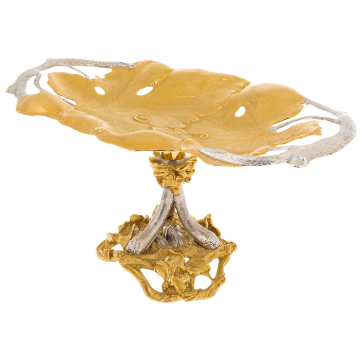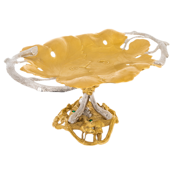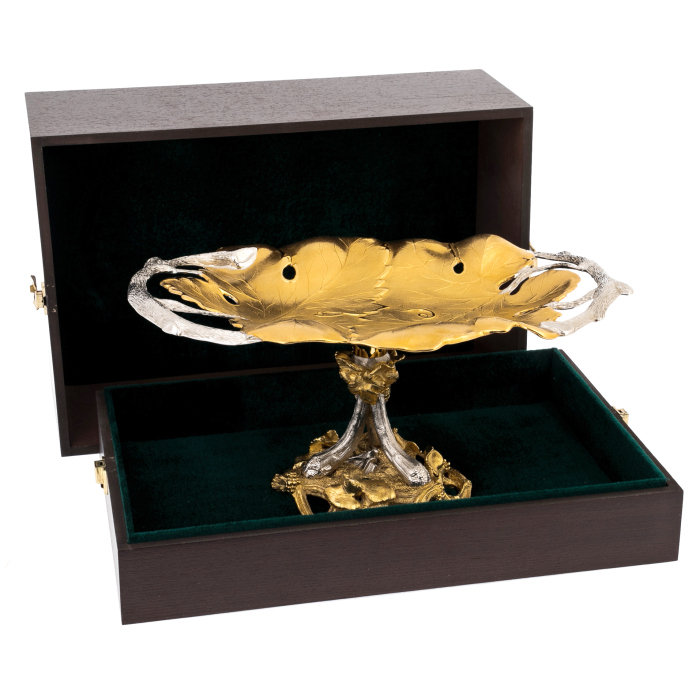 Фруктовница «Виноградная лоза» из Златоуста представляет собой изысканное произведение декоративно-прикладного искусства, воплощающее природную пластику в благородных металлах. Широкая чаша, выполненная в виде развернутого виноградного листа, сияет мягким золотым блеском, подчеркивающим тонкую фактуру прожилок и естественные изгибы краев. По бокам композицию завершают серебристые ветви, изящно обрамляющие чашу и создающие ощущение лёгкости и воздушности. Основание фруктовницы собрано из переплетающихся побегов лозы с гроздьями и листьями, между которыми мелькают миниатюрные зелёные вставки, имитирующие виноградные ягоды.